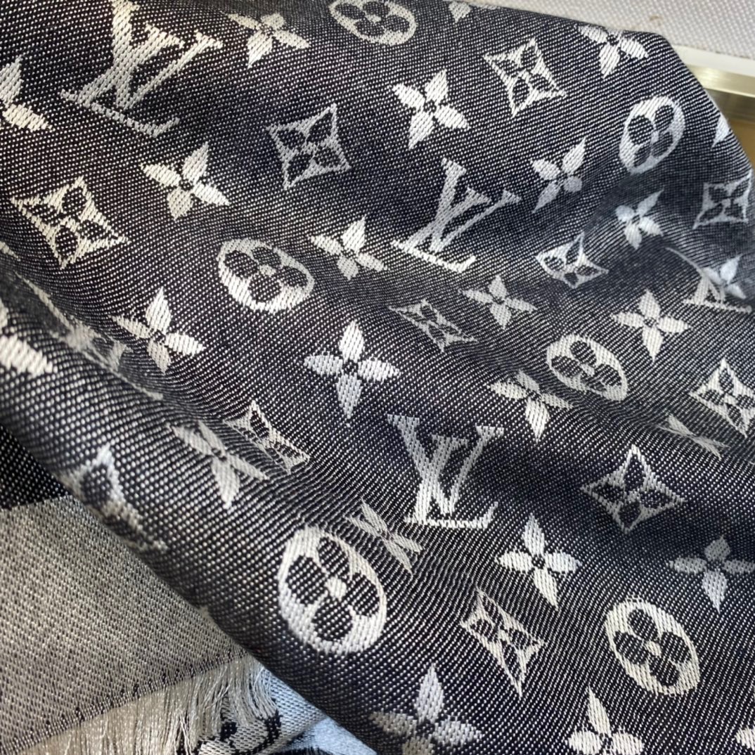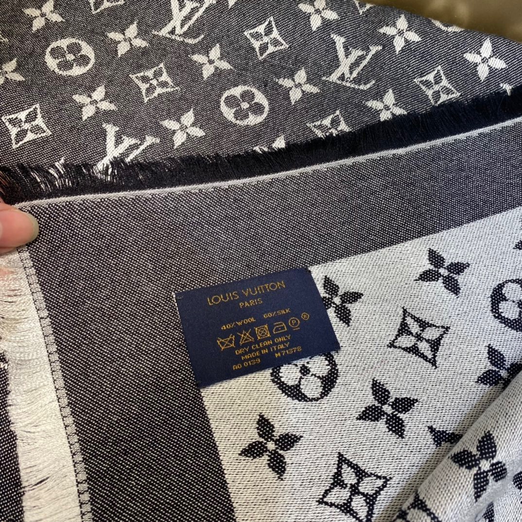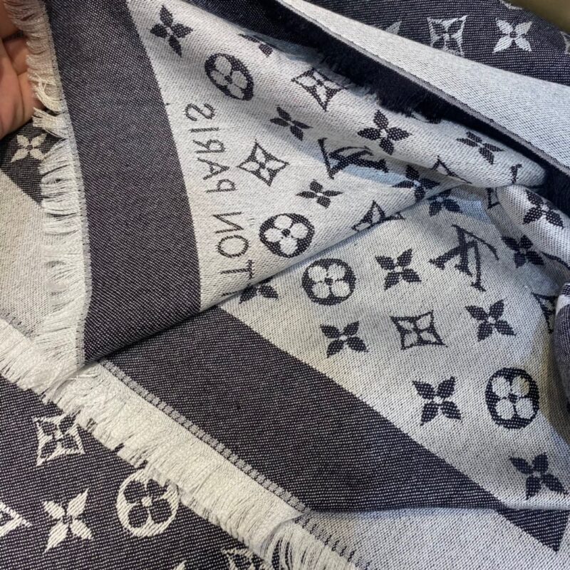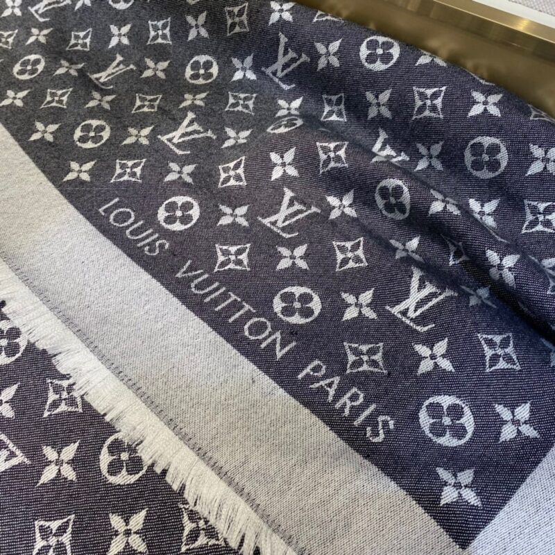 Louis Vuitton jacquard letter haze blue. 140*140cm 60% silk 40% wool Featuring the iconic Monogram pattern, the Denim Monogram Shawl is given a seasonal update in two fresh feminine shades. Made from a wool and silk blend, both yarns are dyed to accentuate the contrasting jacquard. Effortlessly elegant, it can be displayed as a hijab or worn around the neck.