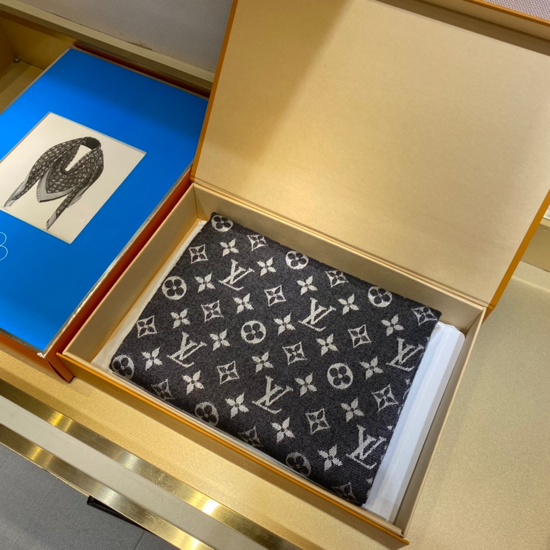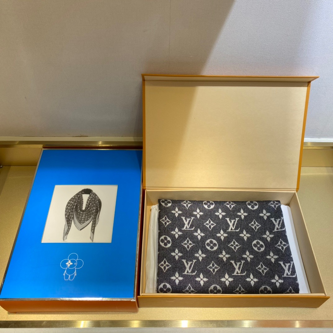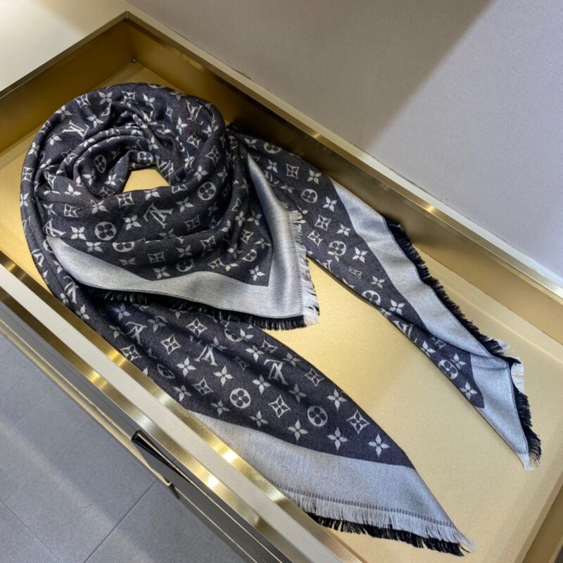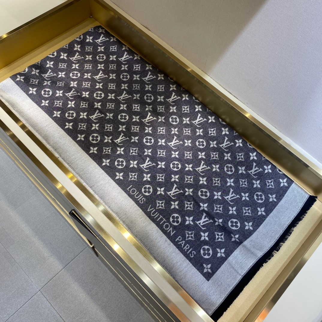 Louis Vuitton jacquard letter haze blue. 140*140cm 60% silk 40% wool Featuring the iconic Monogram pattern, the Denim Monogram Shawl is given a seasonal update in two fresh feminine shades. Made from a wool and silk blend, both yarns are dyed to accentuate the contrasting jacquard. Effortlessly elegant, it can be displayed as a hijab or worn around the neck.
