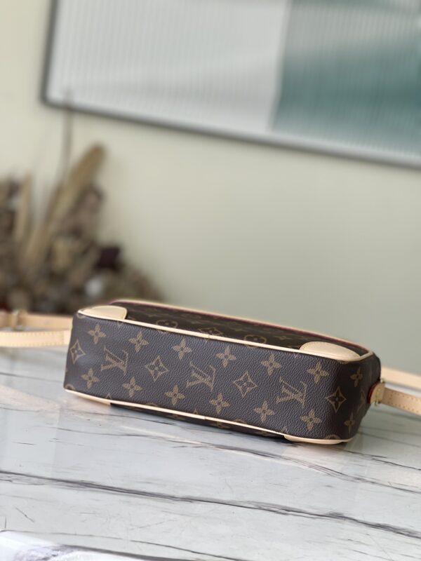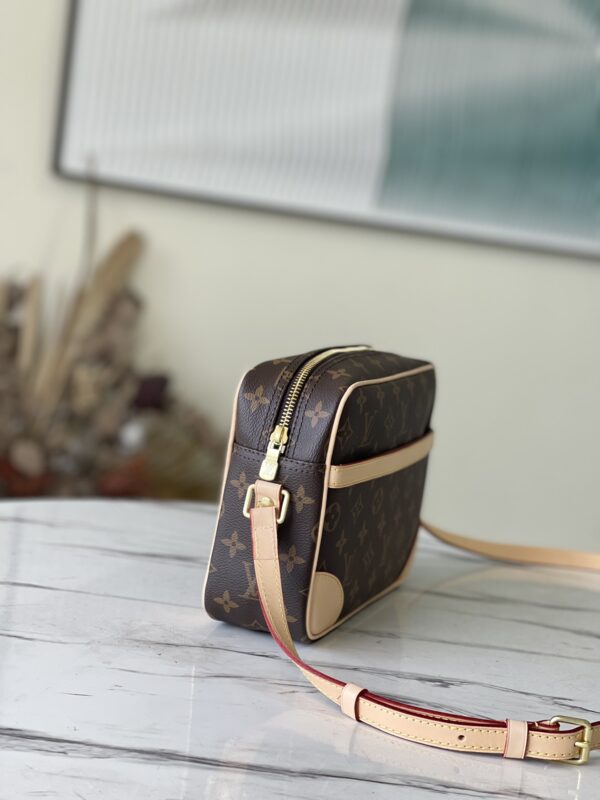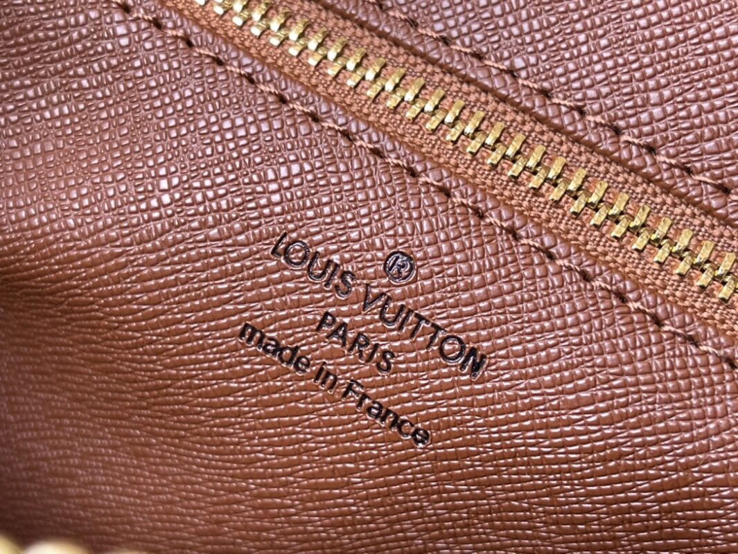 Medium-sized Vintage camera bag, messenger bag, unisex, classic Monogram canvas with yellow leather trim, calm and atmospheric, one outside open pocket, inside with zipper side pocket, adjustable shoulder strap to switch freely at any time, daily use Sufficient capacity. Size: 27*17*7cm.