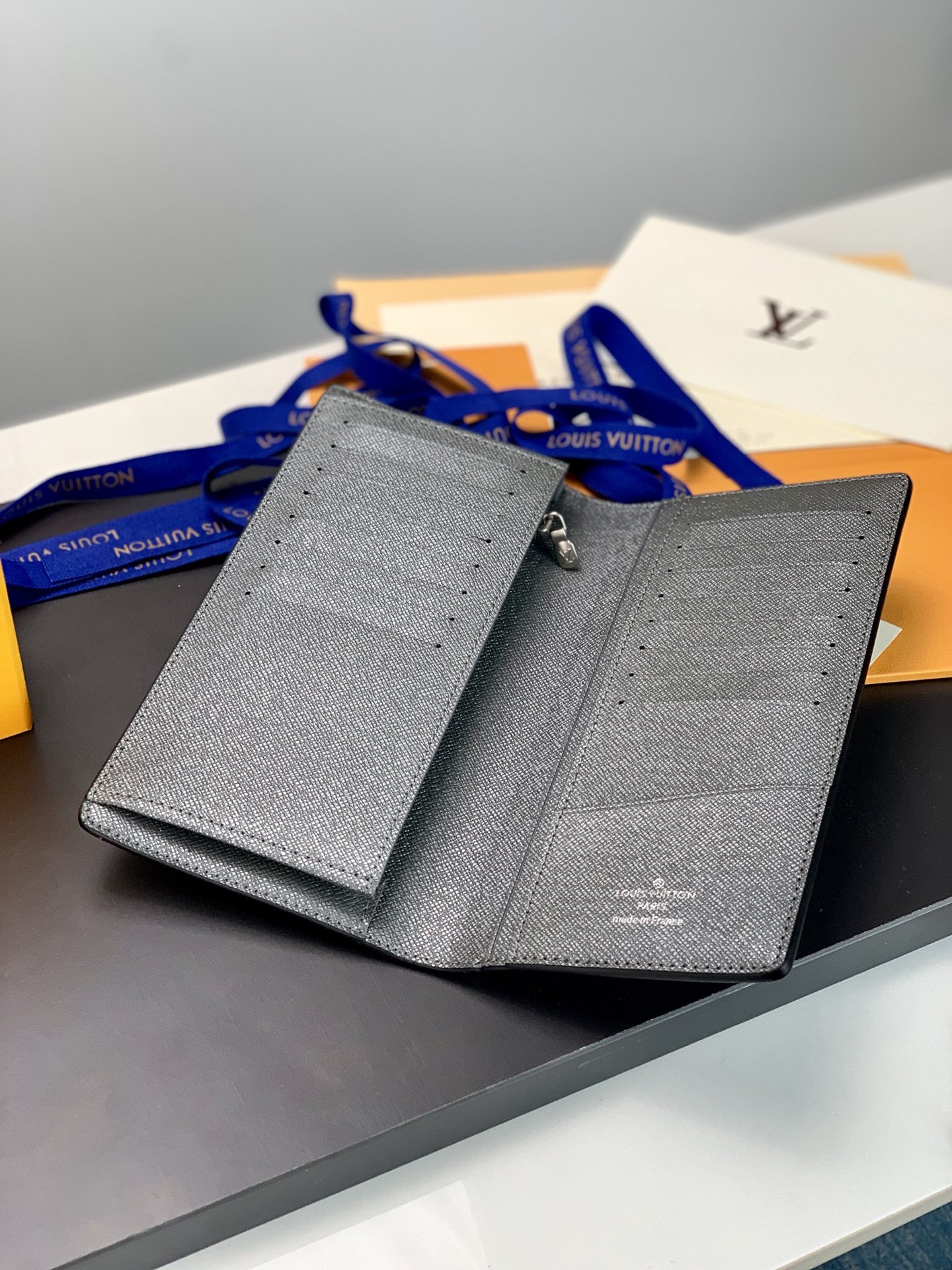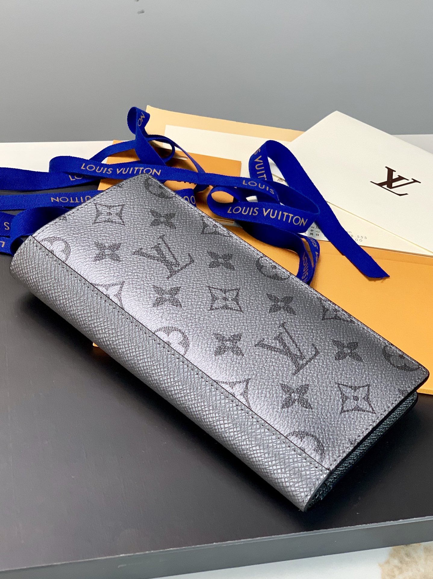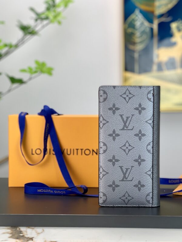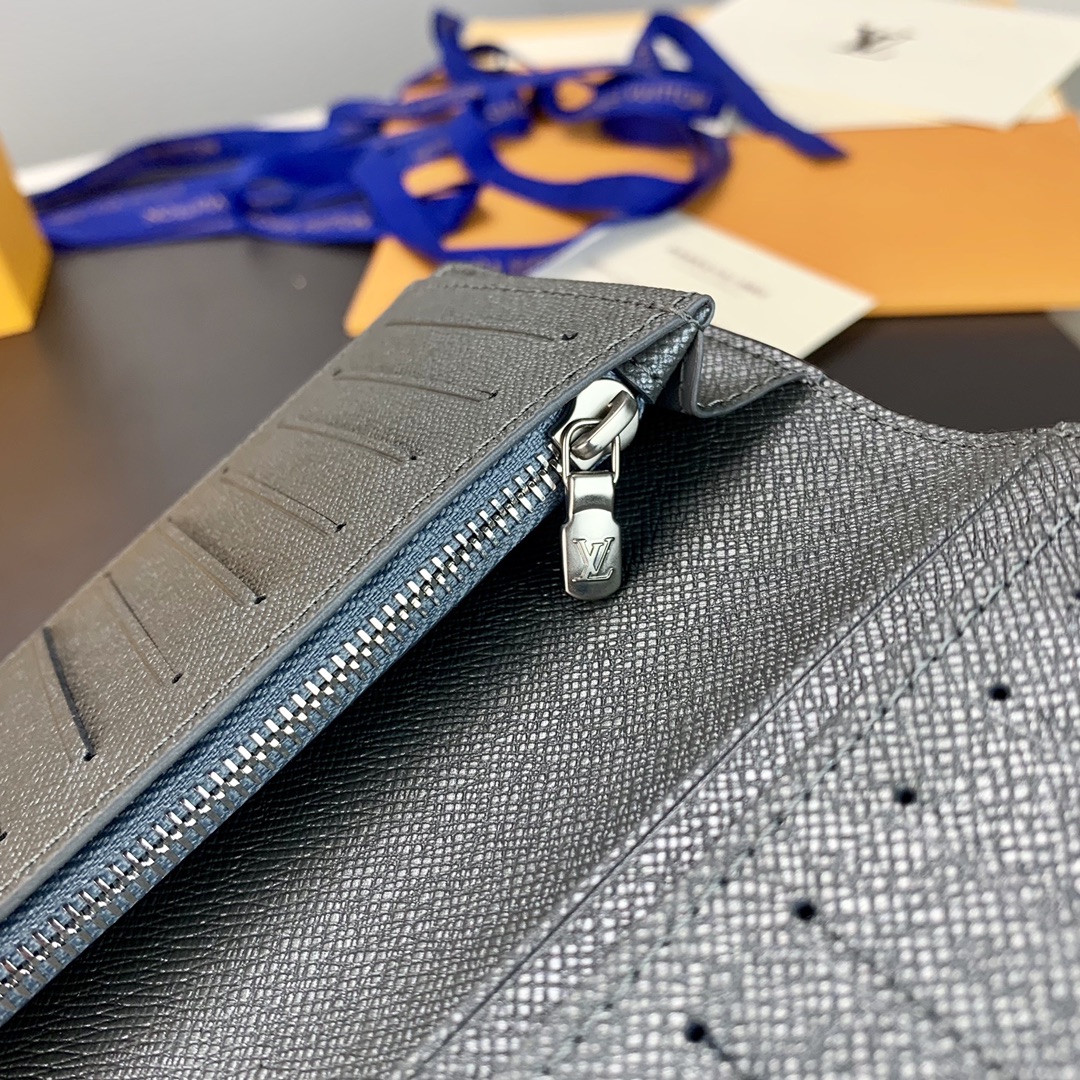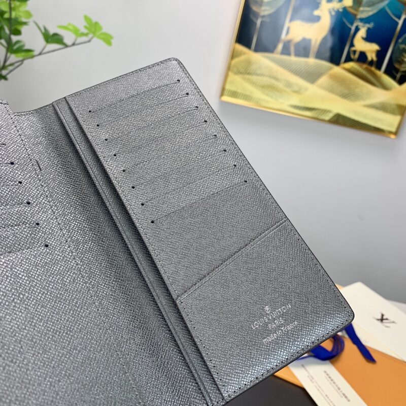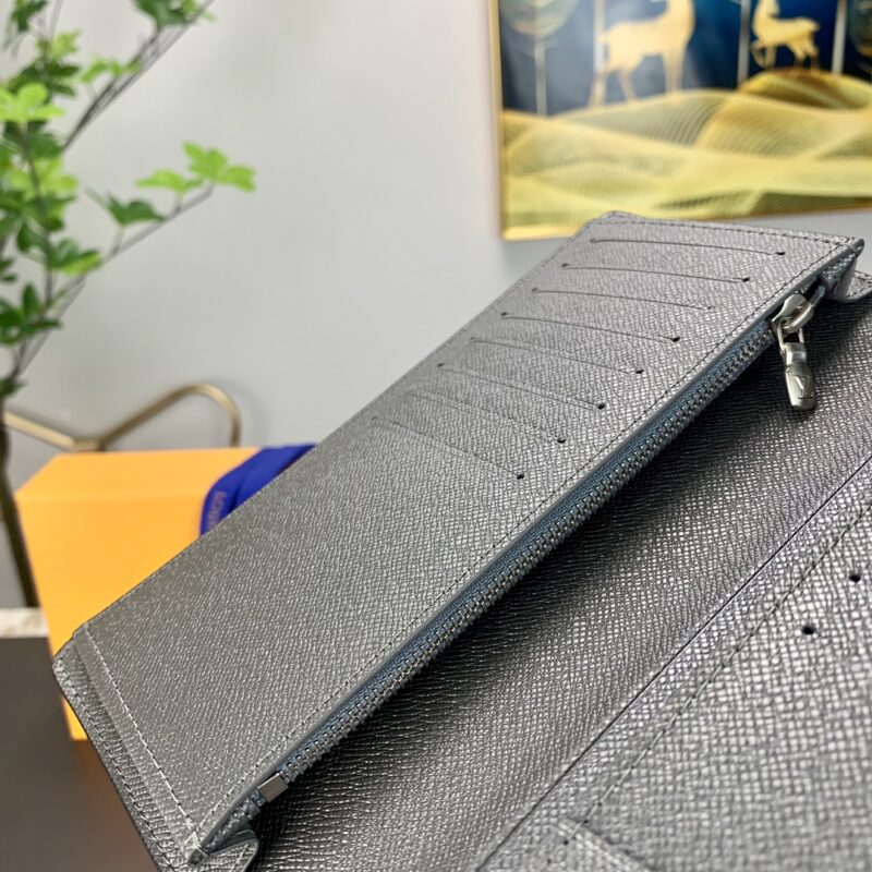 Ash from the Taigrama leather goods collection, the Brazza blazer is crafted in Taiga leather and Monogram coated canvas in a slim silhouette and has a roomy interior with card slots and coin compartments. Size: 10 x 19 x 2 cm.