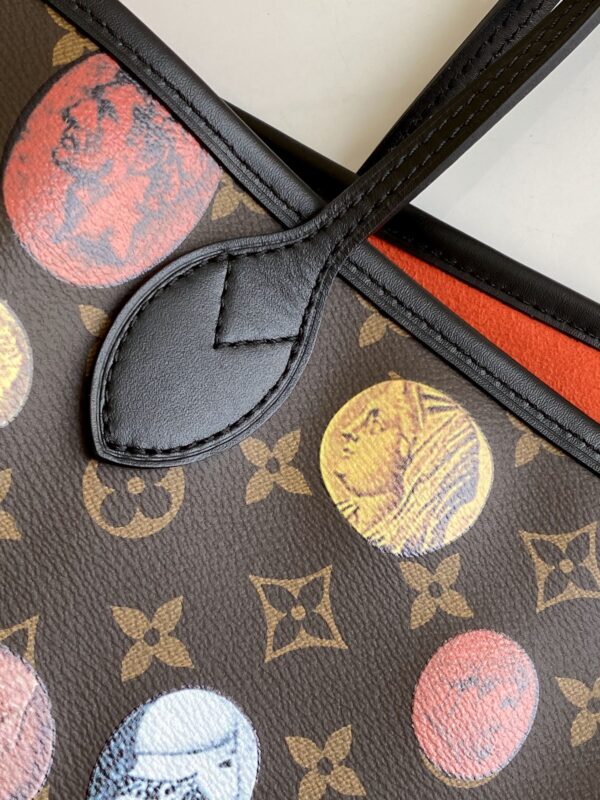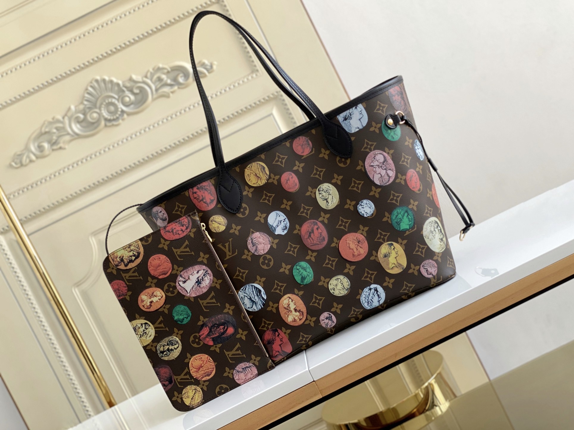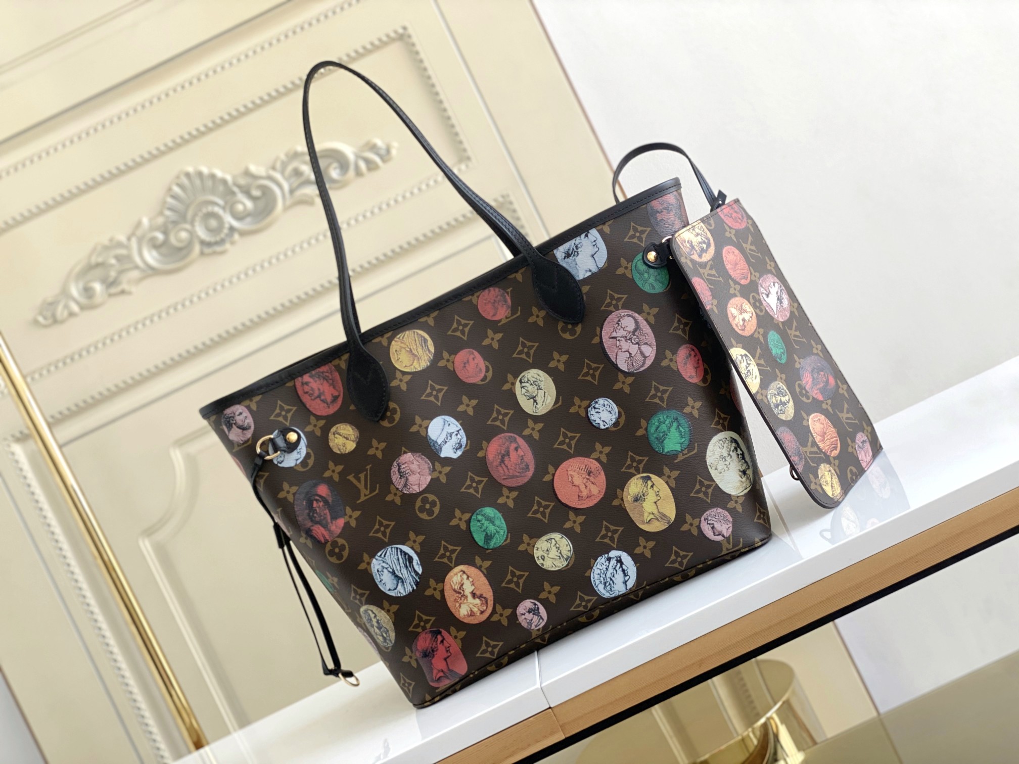 The Neverfull medium handbag comes from the Fornasetti autumn/winter 2021 capsule collection. It overprints colorful embossed patterns on Monogram canvas, telling the inspiration of ancient Greek and Roman coins, relying on the iconic style of the Fornasetti art studio to appear in the field of vision. Size: 31 x 28 x 14 cm (L x H x W)