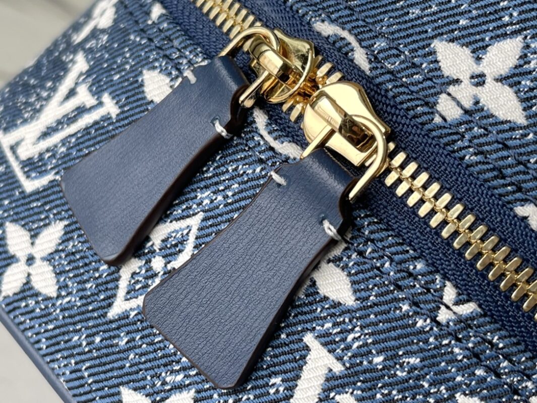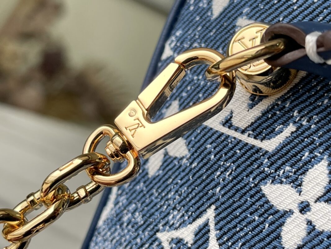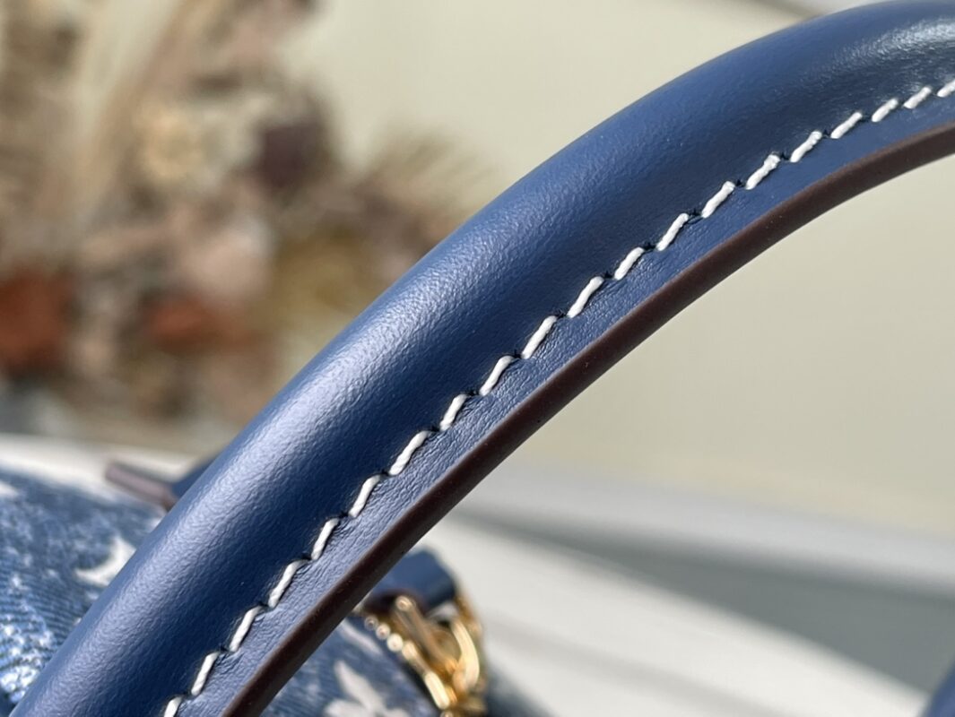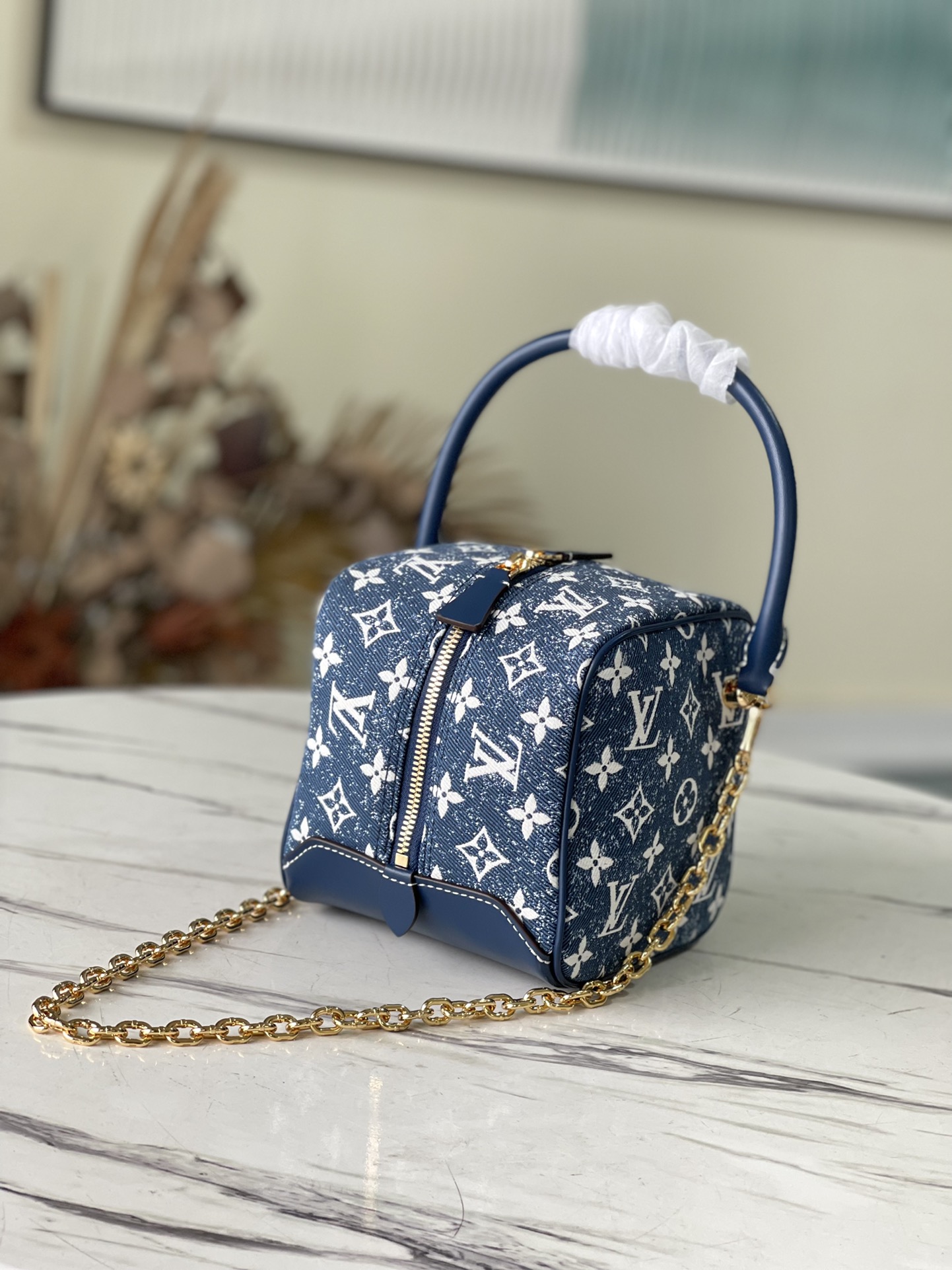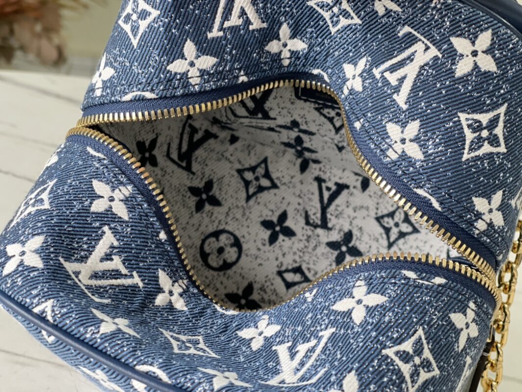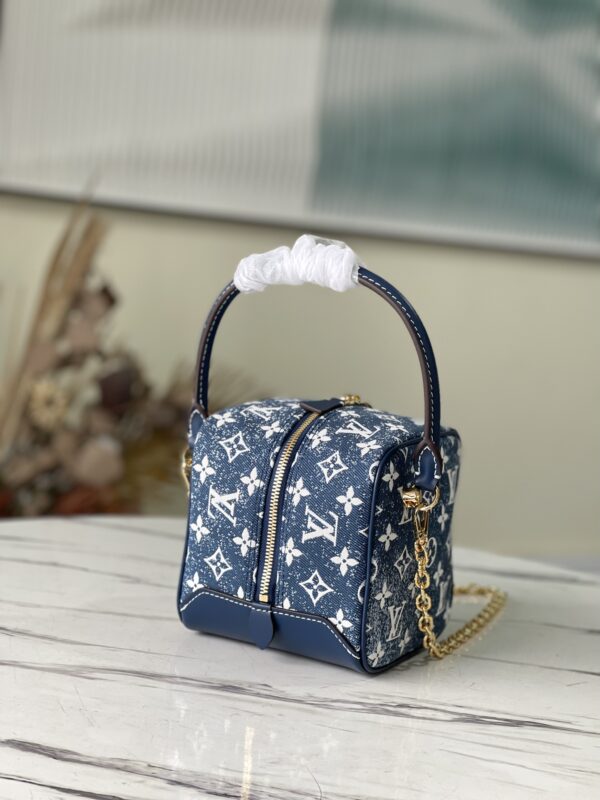 Denim blue Nice bag Square handbag, the design is inspired by the feminine vanity box, made of classic logo denim, showing the unremitting pursuit of sustainable denim craftsmanship, and conveying the atmosphere of neo-retro together with the cow leather trim. With detachable chain. Dimensions: 16x16x16 cm