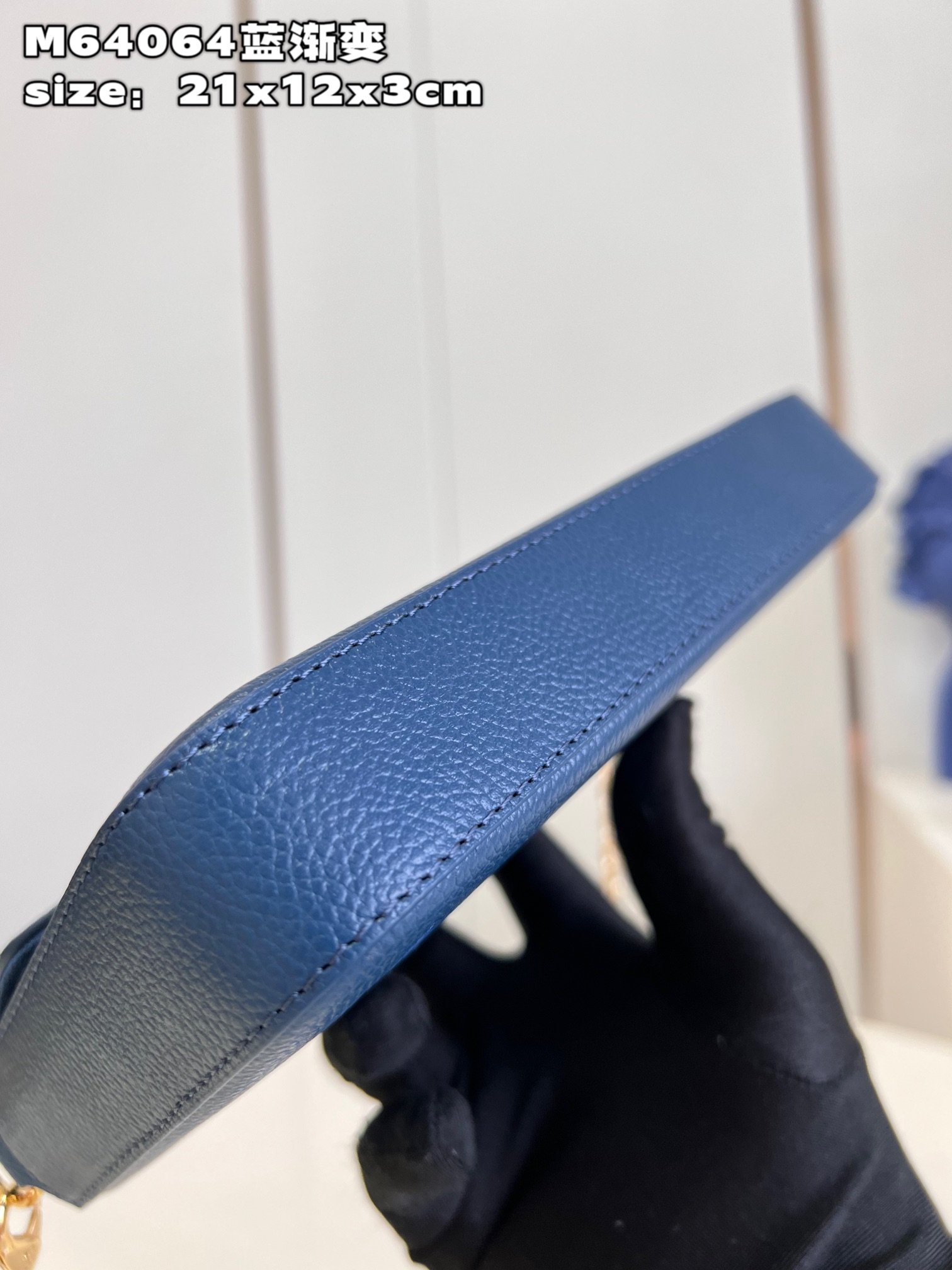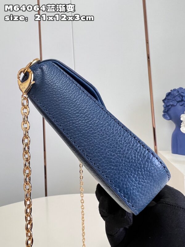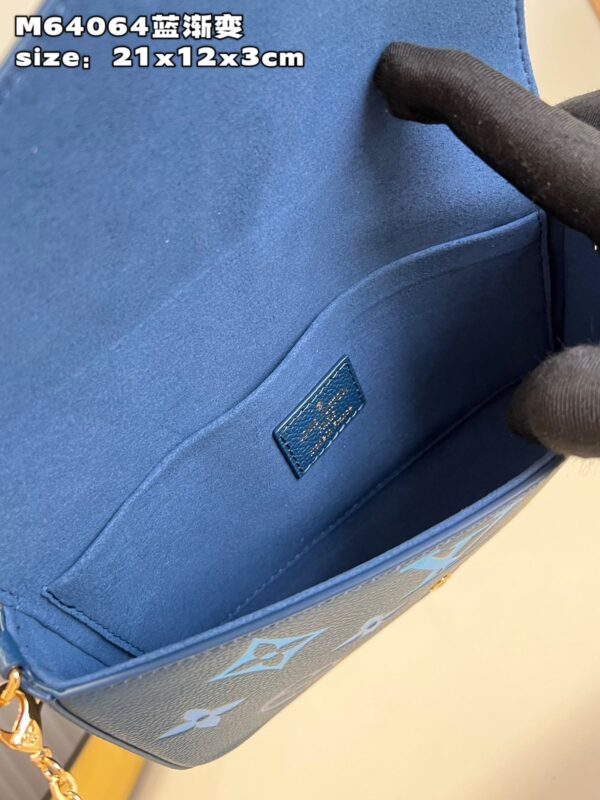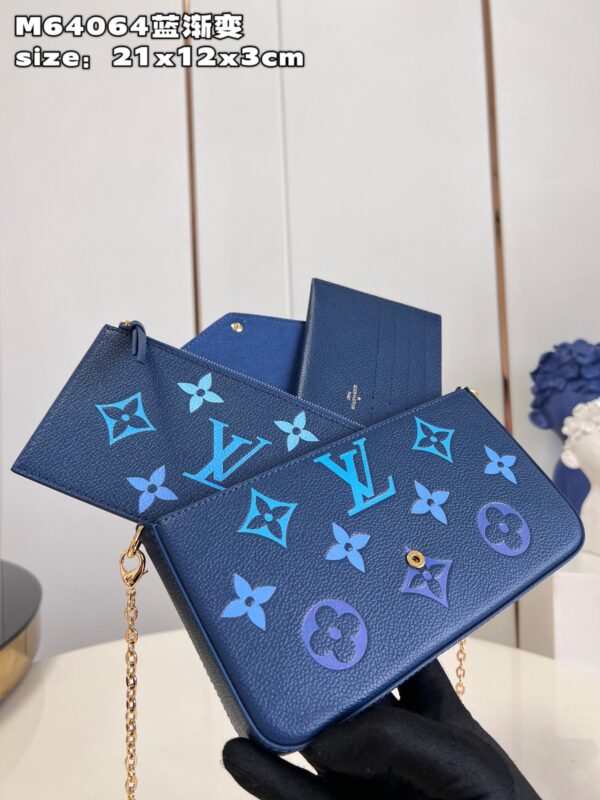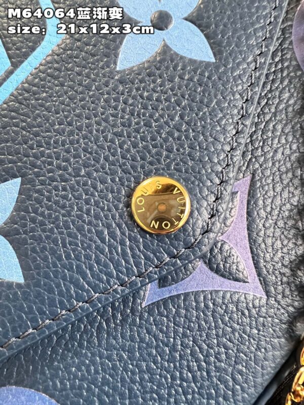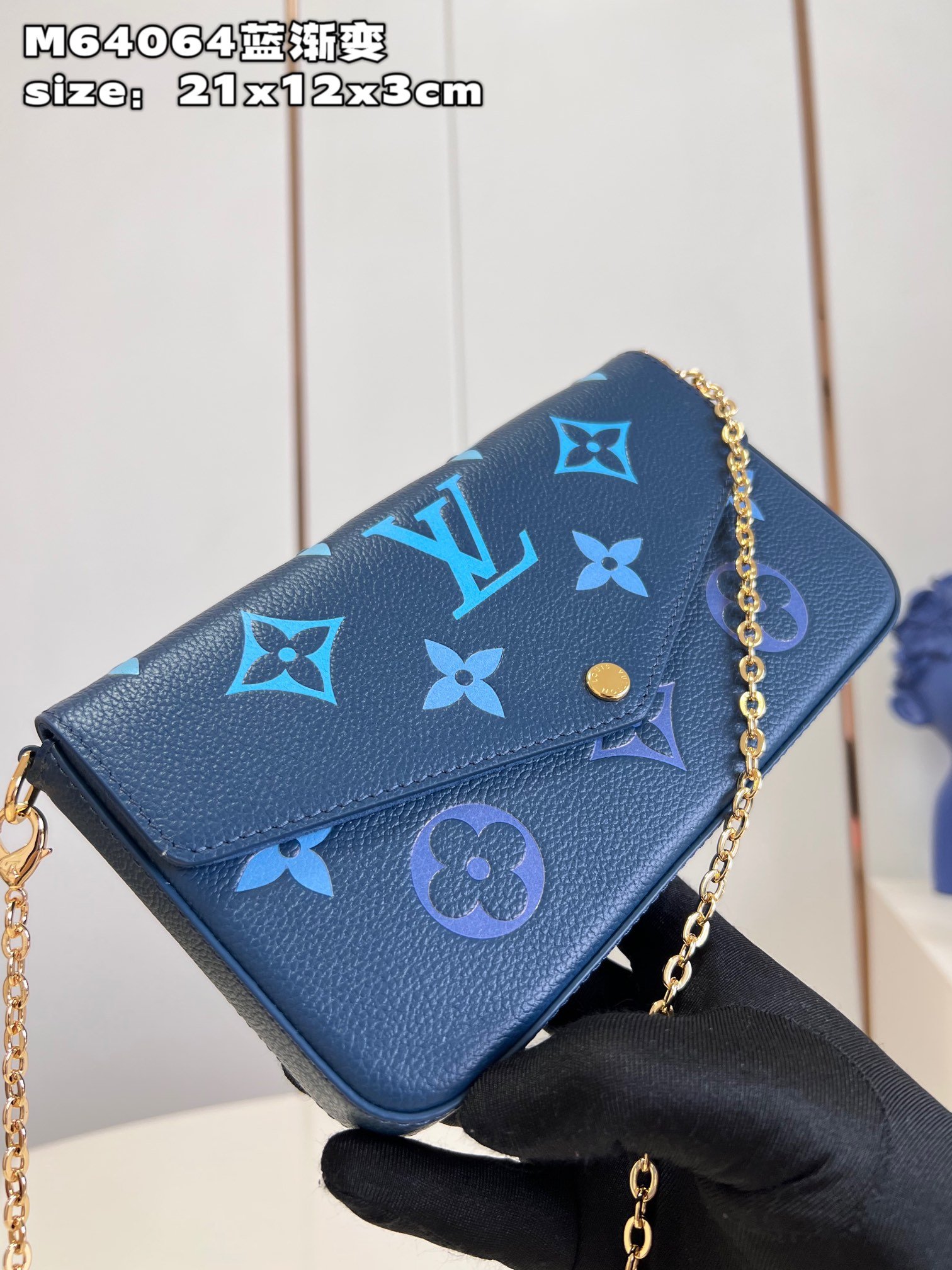 This style of Pochette Félicie chain bag is made of Monogram Empreinte leather, depicting the Monogram pattern in light colors. The envelope-style configuration includes a detachable inner bag, which can be transformed into an elegant clutch by removing the chain. Size: 21x12x3cm