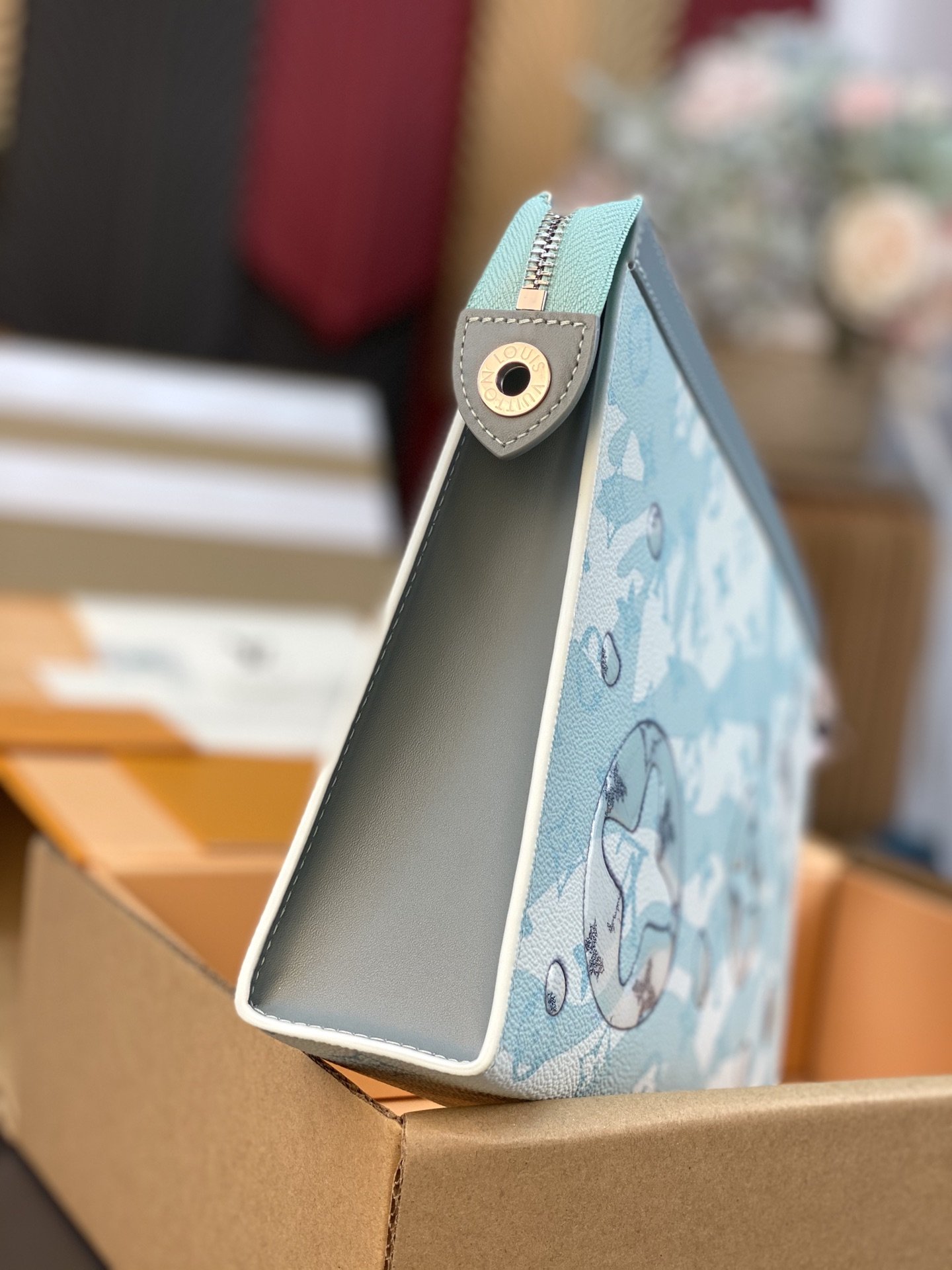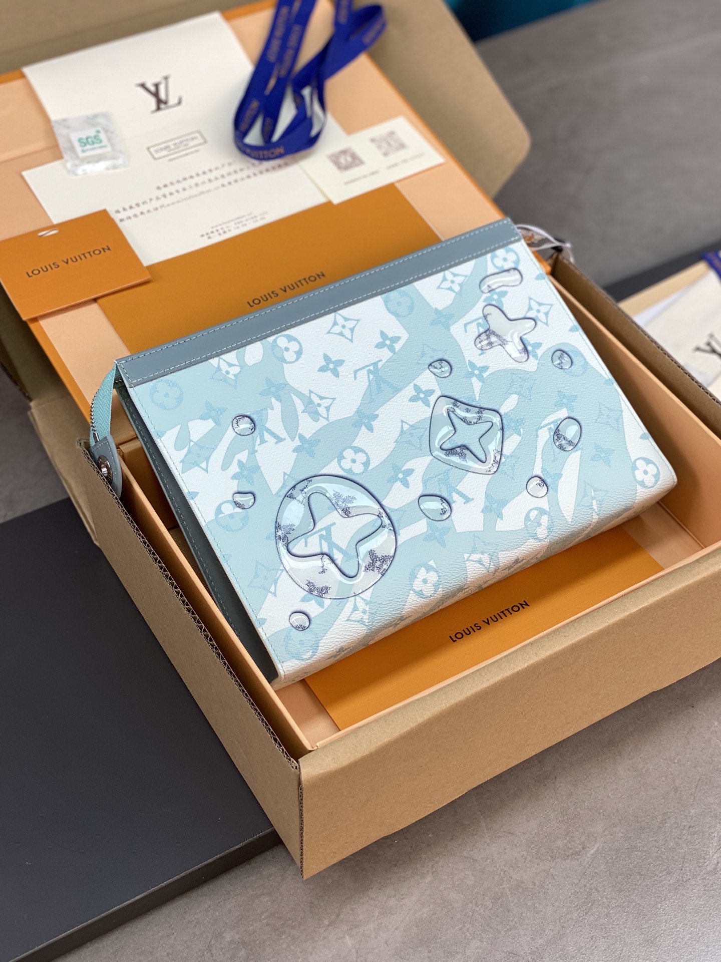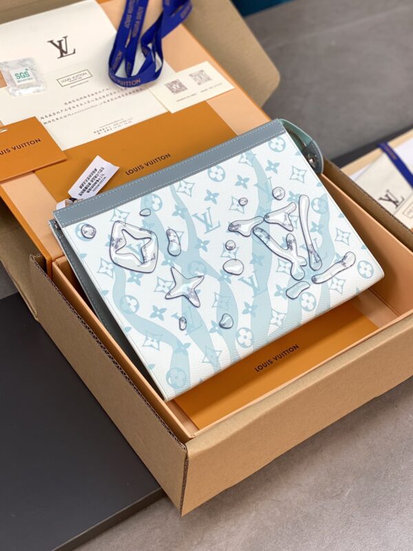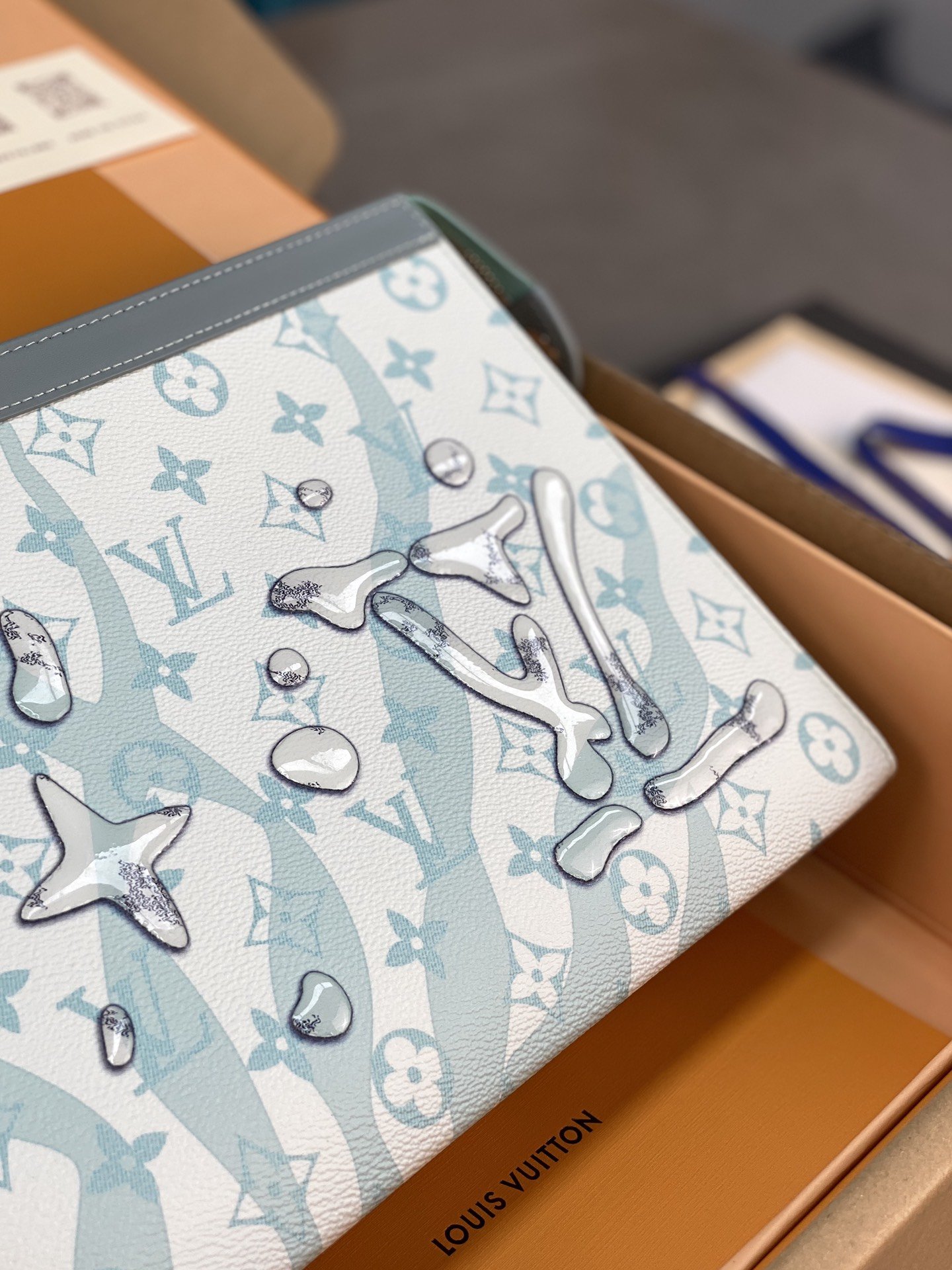 POCHETTE VOYAGE Medium Clutch, this Pochette Voyage Medium Clutch is creatively printed so that the Monogram element looks like a splash of water, flowing on the surface of the faded Monogram pattern, as if jumping out of the water from the depths of the sea. Functional design includes Inside patch pocket and card slot 27 x 21 x 6 cm (LxHxW), Monogram Aquagarden coated canvas