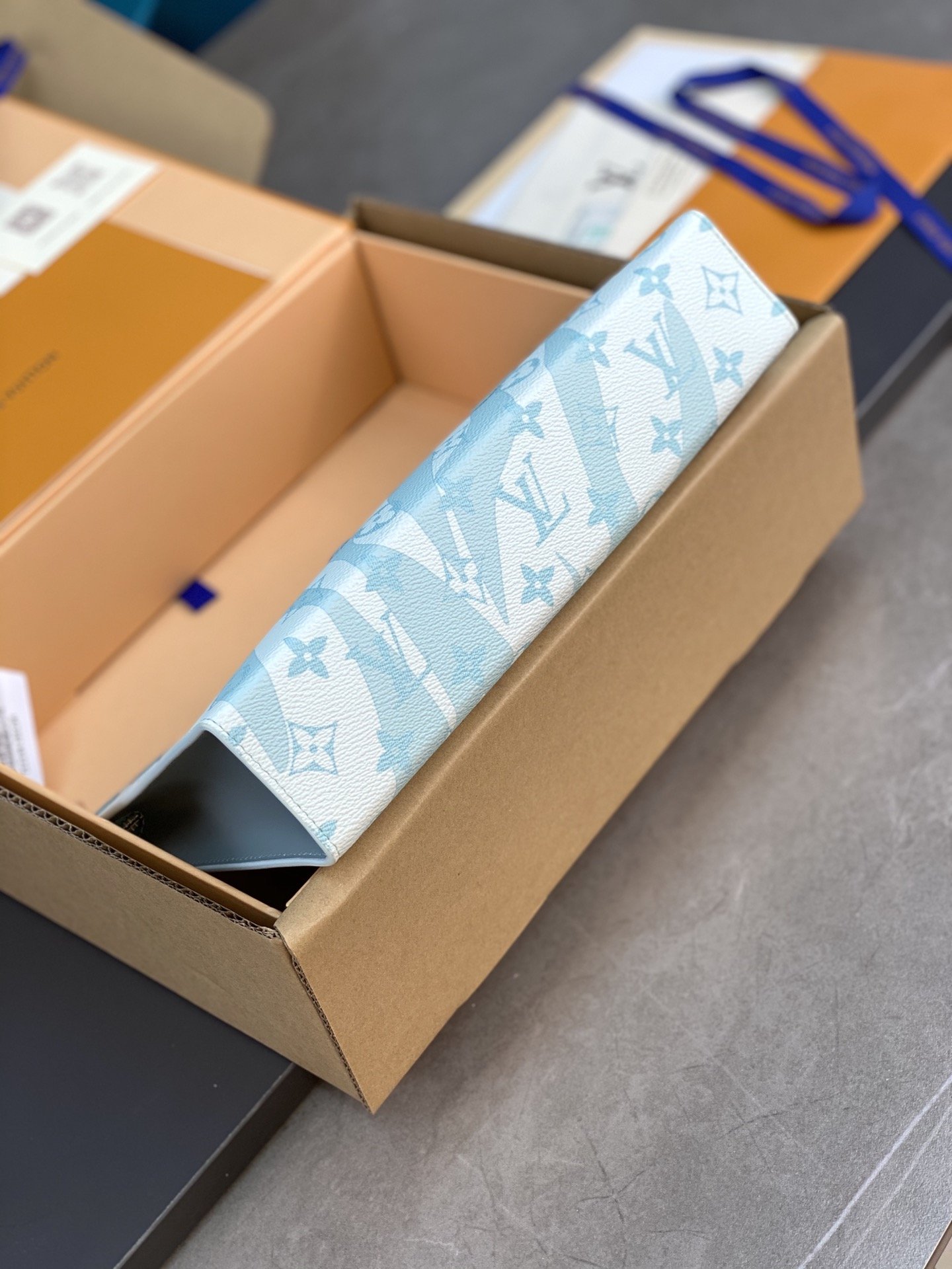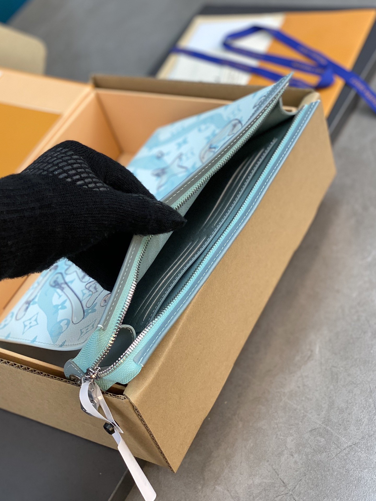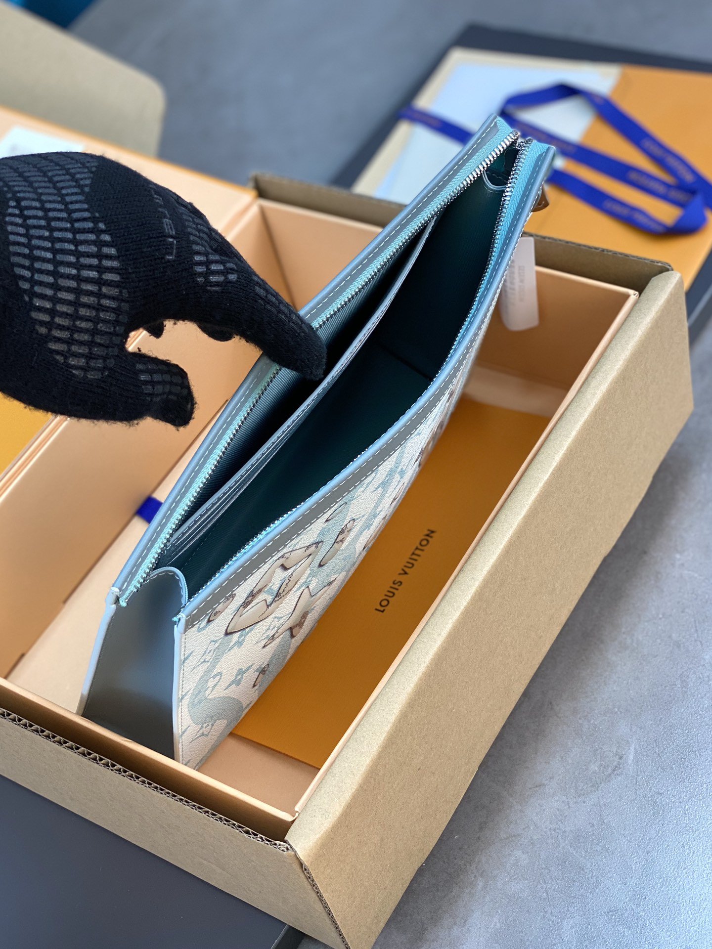 POCHETTE VOYAGE Medium Clutch, this Pochette Voyage Medium Clutch is creatively printed so that the Monogram element looks like a splash of water, flowing on the surface of the faded Monogram pattern, as if jumping out of the water from the depths of the sea. Functional design includes Inside patch pocket and card slot 27 x 21 x 6 cm (LxHxW), Monogram Aquagarden coated canvas