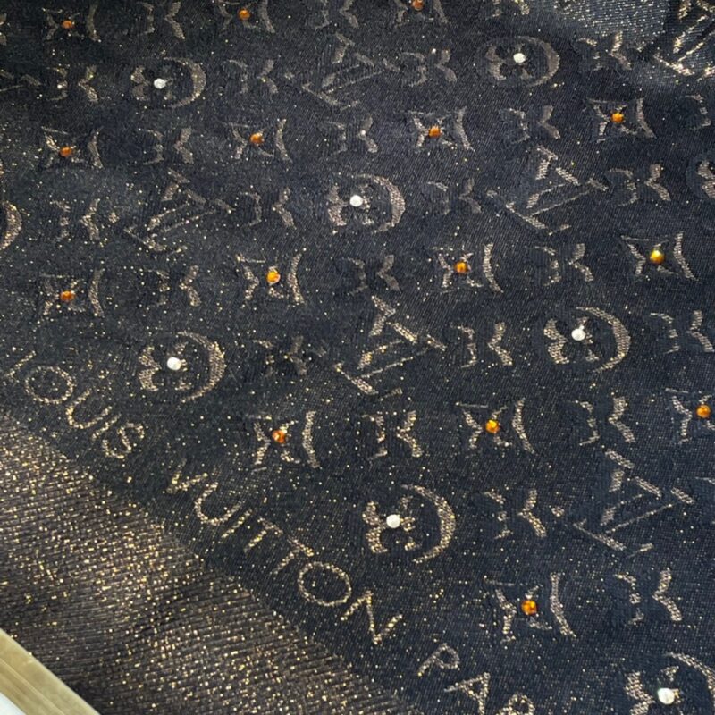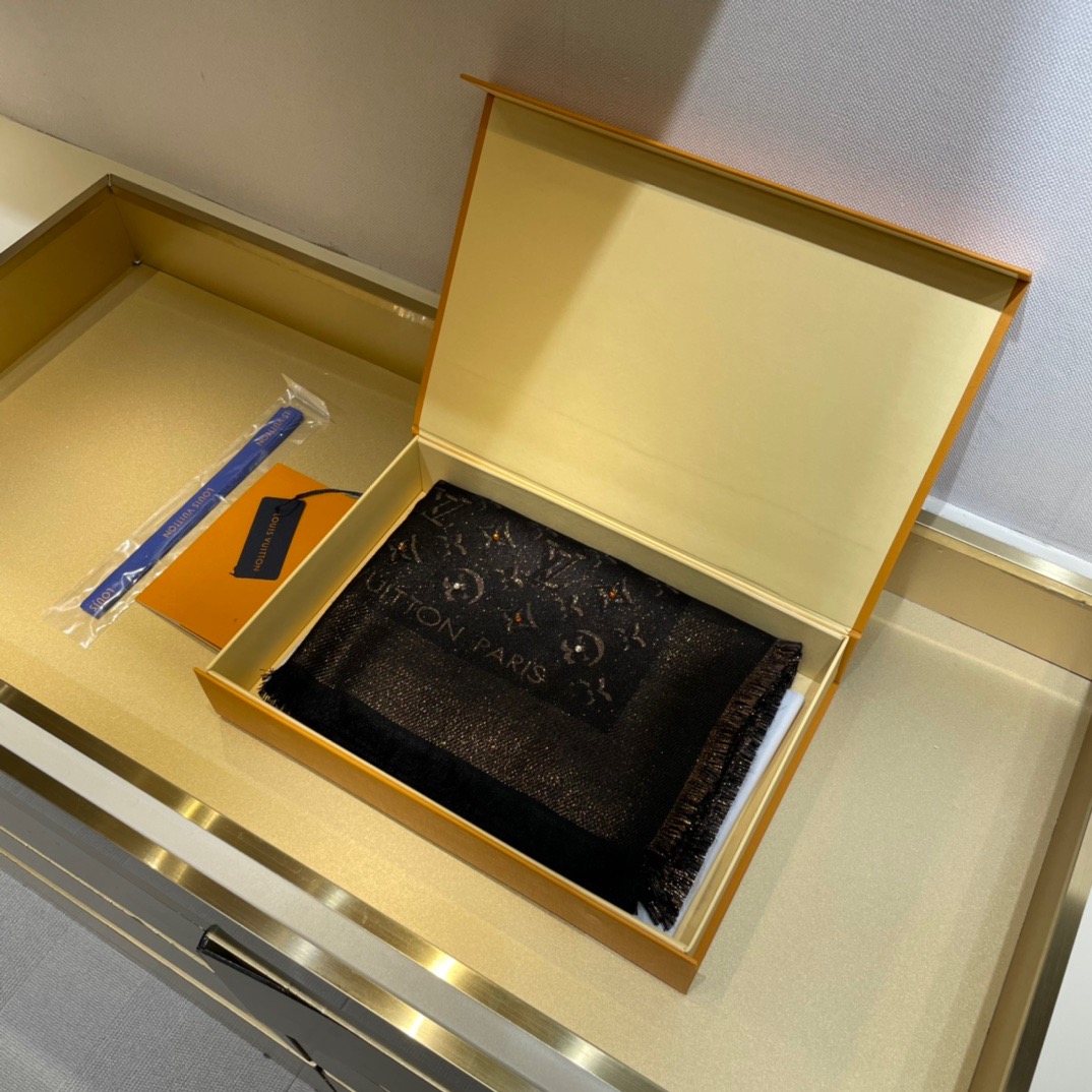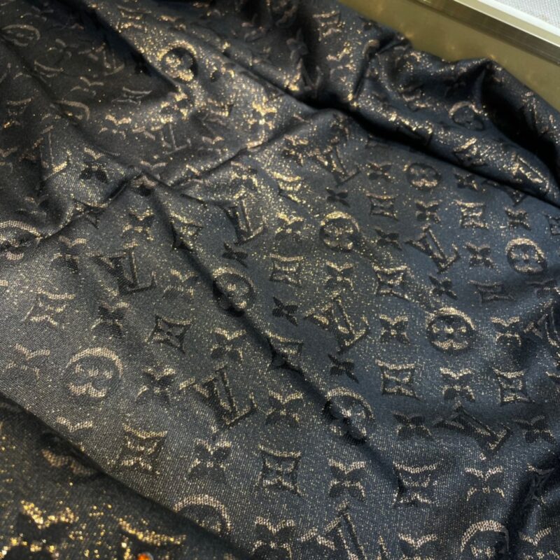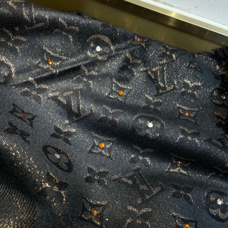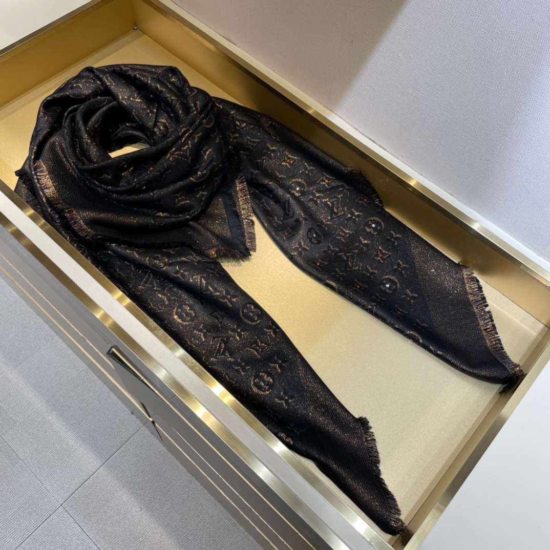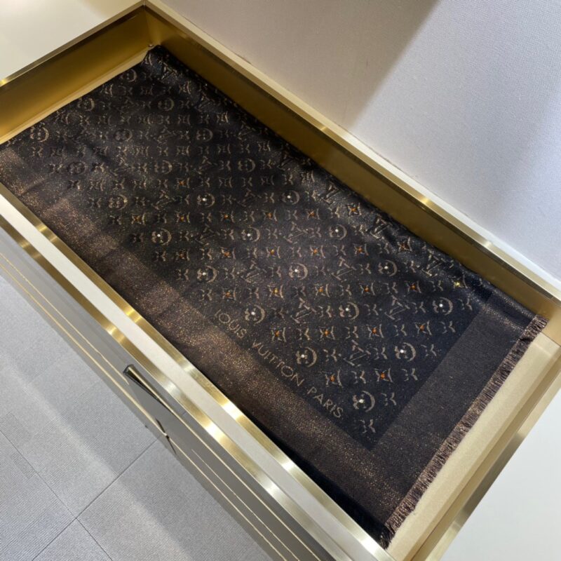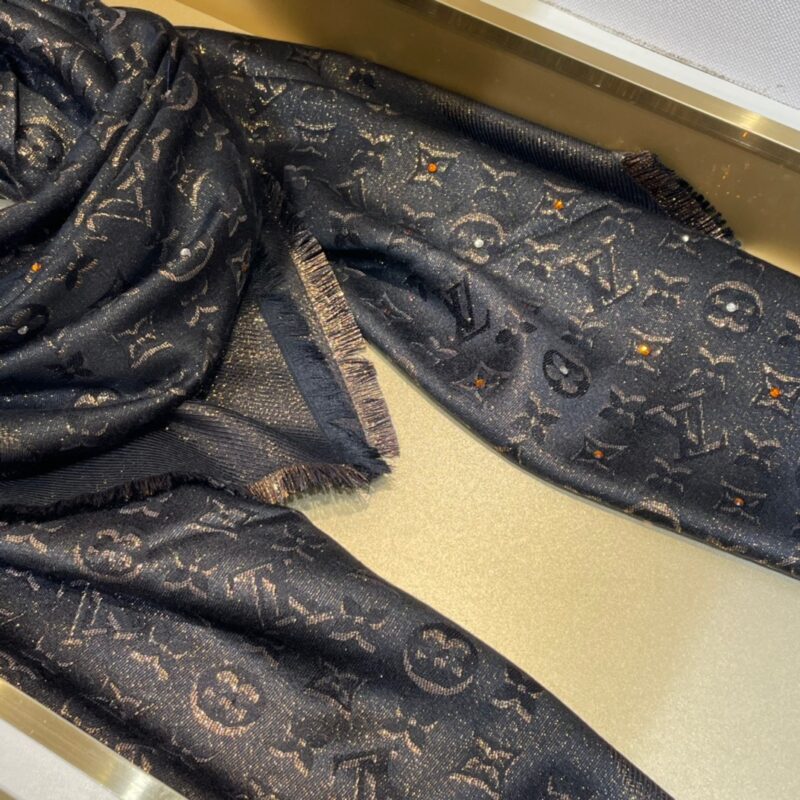 Louis Vuitton Shining Letters. 140*140cm. 53% Wool 33% Silk 14% Lurex The Shiny Monogram shawl is made of fine silk and wool blends, incorporating the sparkle of Lurex metal threads, and presents a full Monogram pattern under the illusion of jacquard technology.