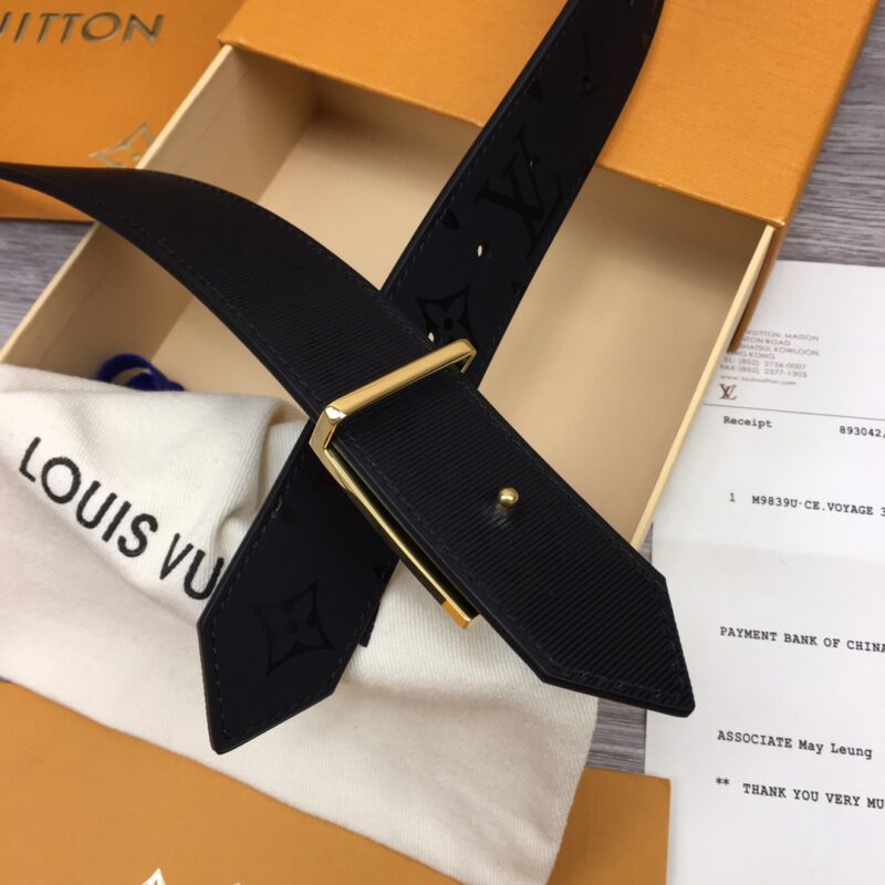 Louis Vuitton women’s boutique belt. Width 35cm. Custom-made classic canvas fabric against soft pure black calfskin. New open molded square shape with brand pattern. Double-sided use. 35080182