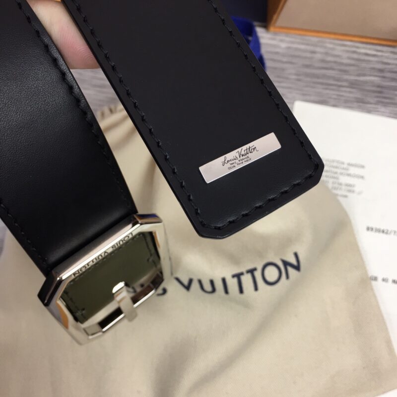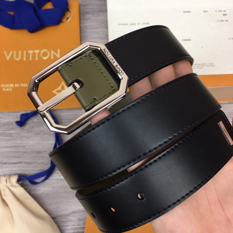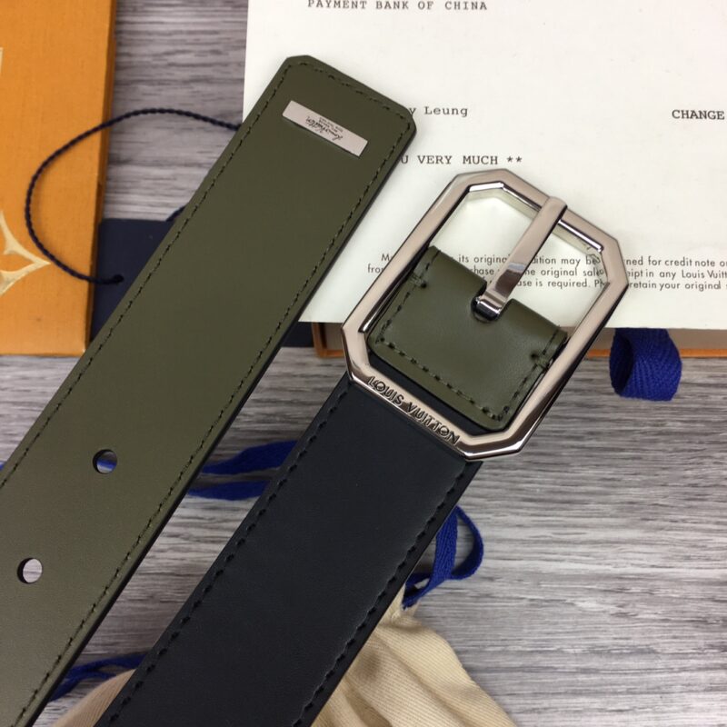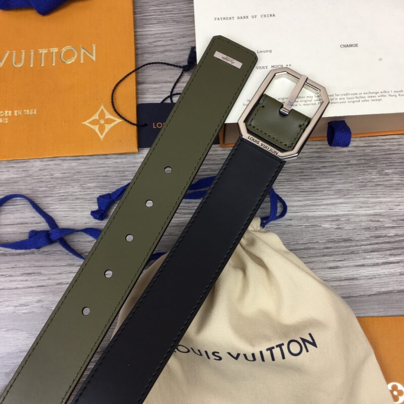Louis Vuitton men’s belt. Width 35cm. This belt is made of double-sided original calfskin. Color: black-green. Enamel nameplate on both sides of the tail. Square pin buckle. Double-sided use. 35080230