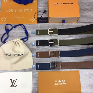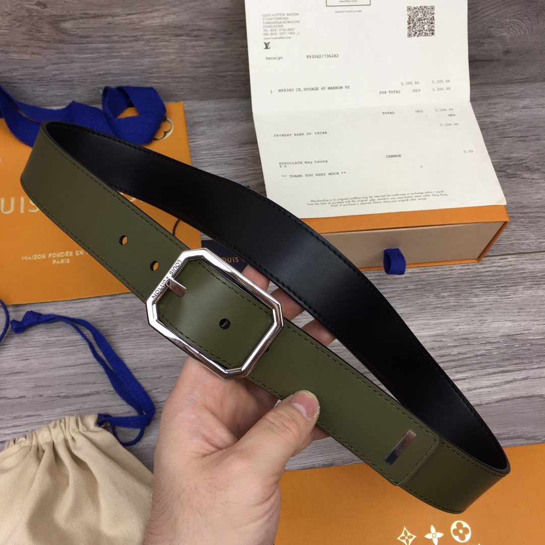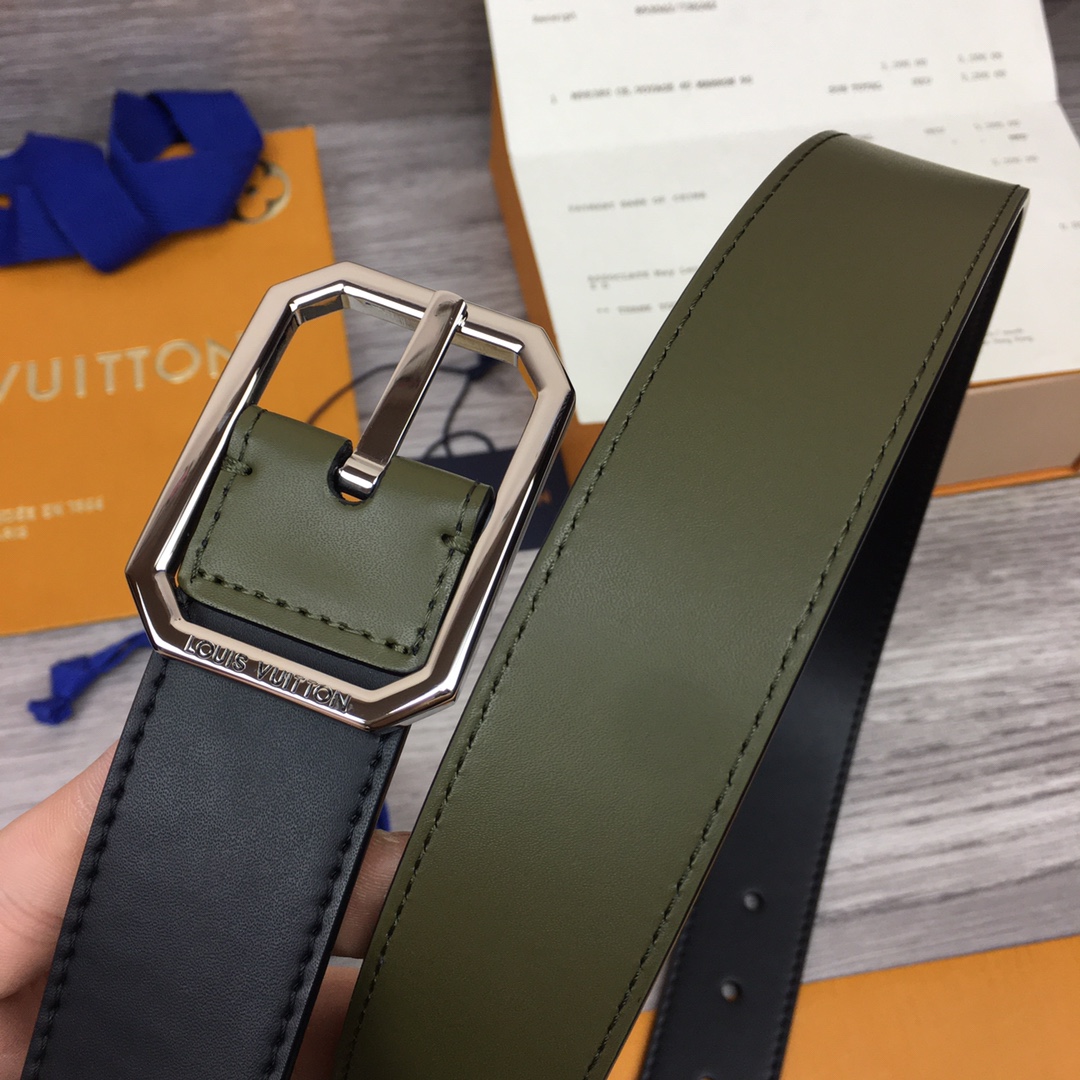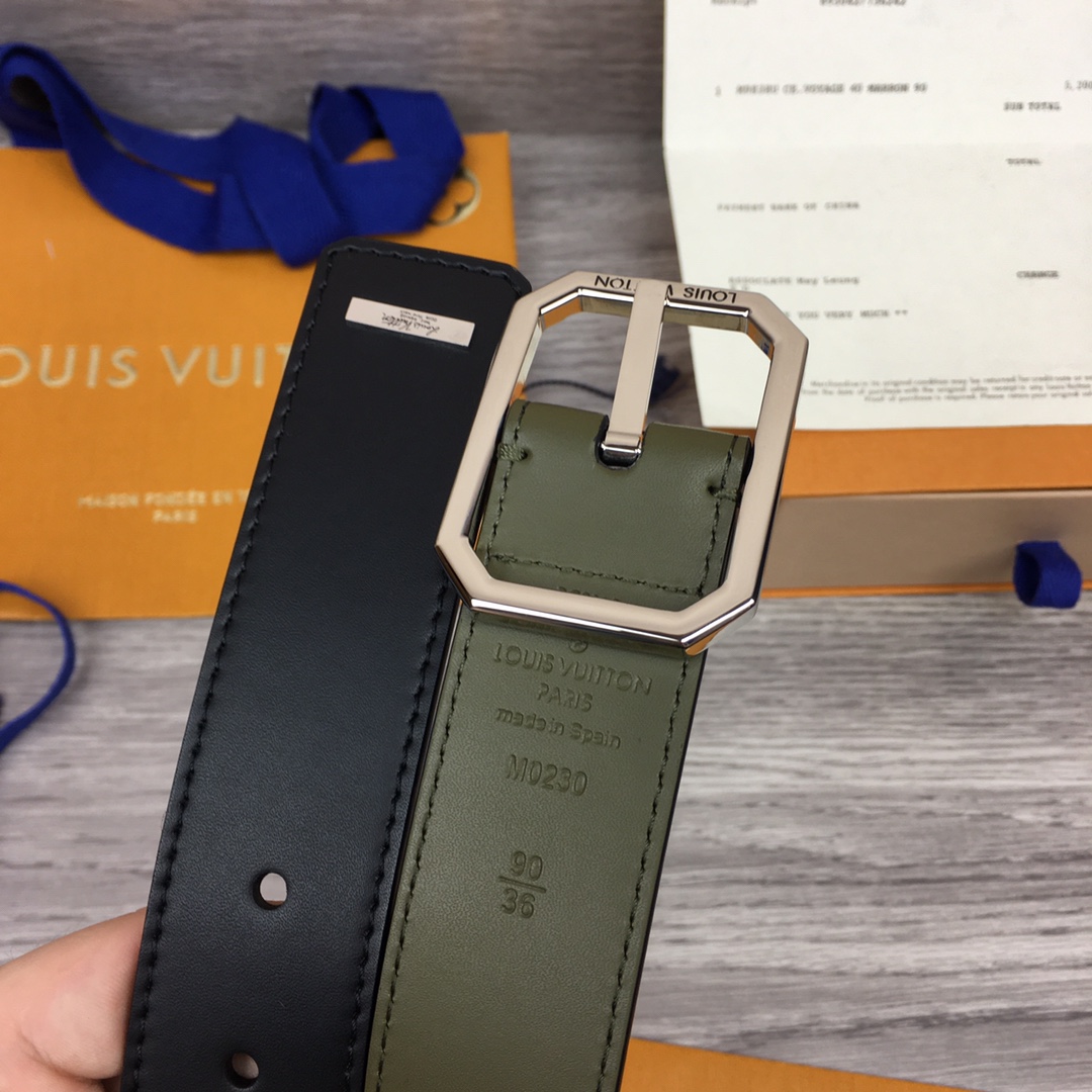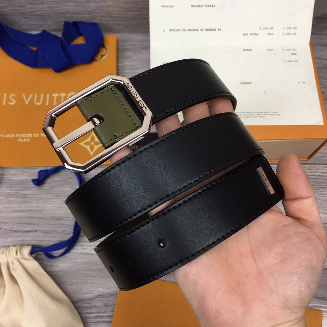 Louis Vuitton men’s belt. Width 35cm. This belt is made of double-sided original calfskin. Color: black-green. Enamel nameplate on both sides of the tail. Square pin buckle. Double-sided use. 35080230