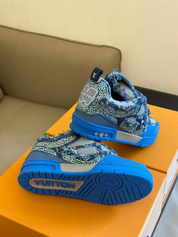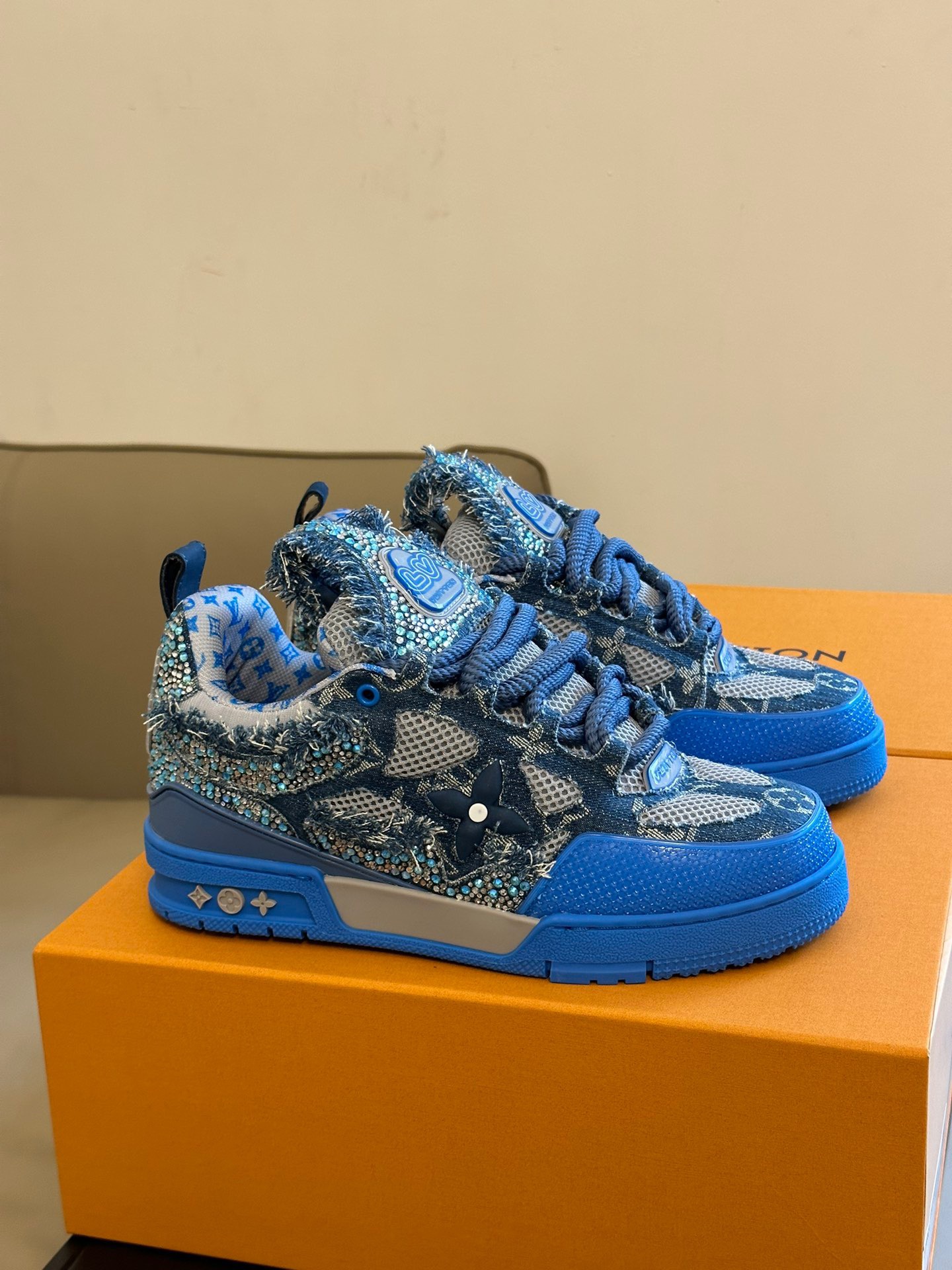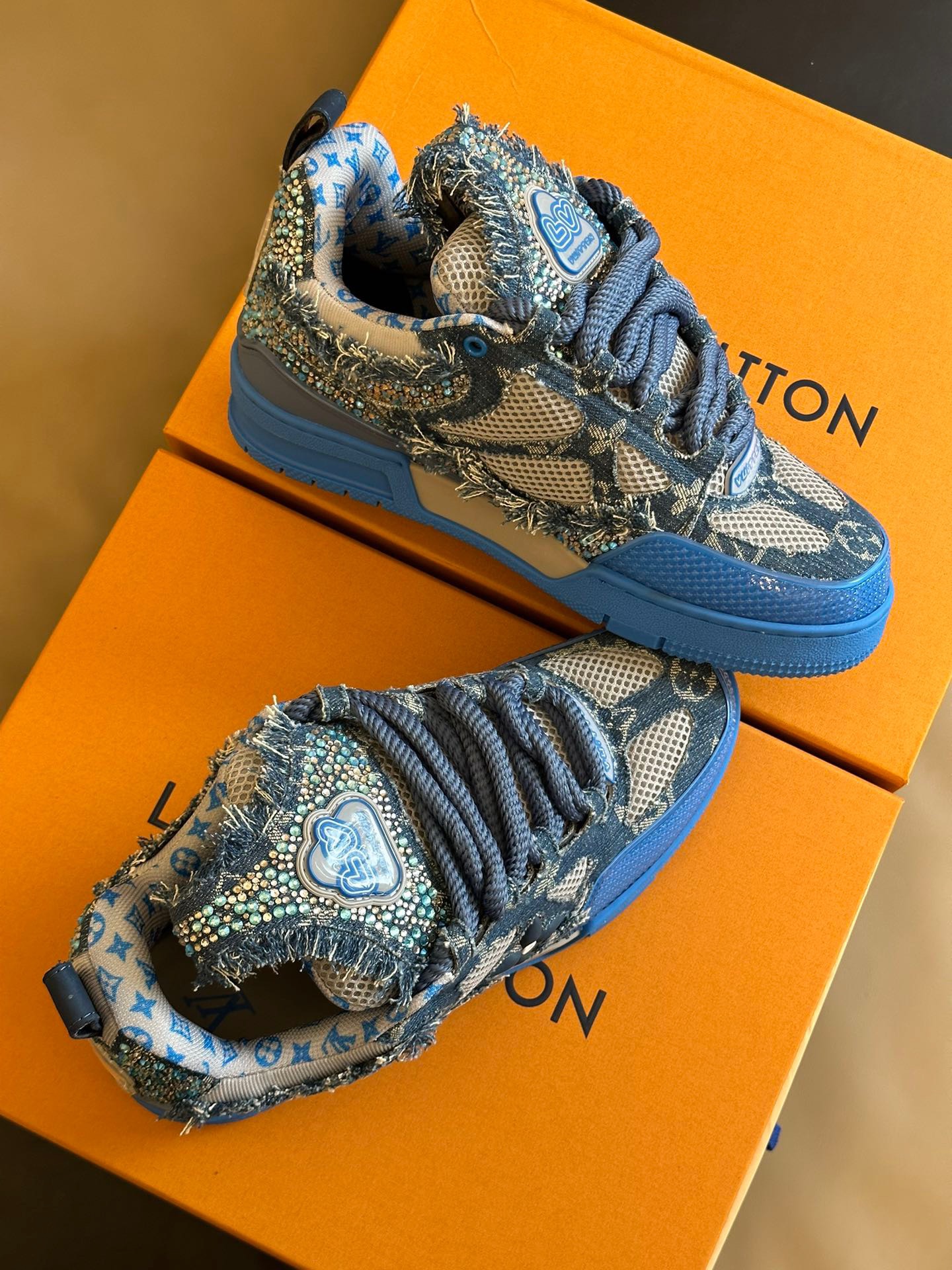 This exceptional edition of the LV Skate sneaker combines Monogram denim with sparkling Swarovski™ crystals and technical mesh. This Nineties-inspired design is characterized by its padded collar and tongue, which features an LV since 54 logo, referring to 1854, when Louis Vuitton was founded. Technical double laces and a bicolor rubber outsole complete this model.