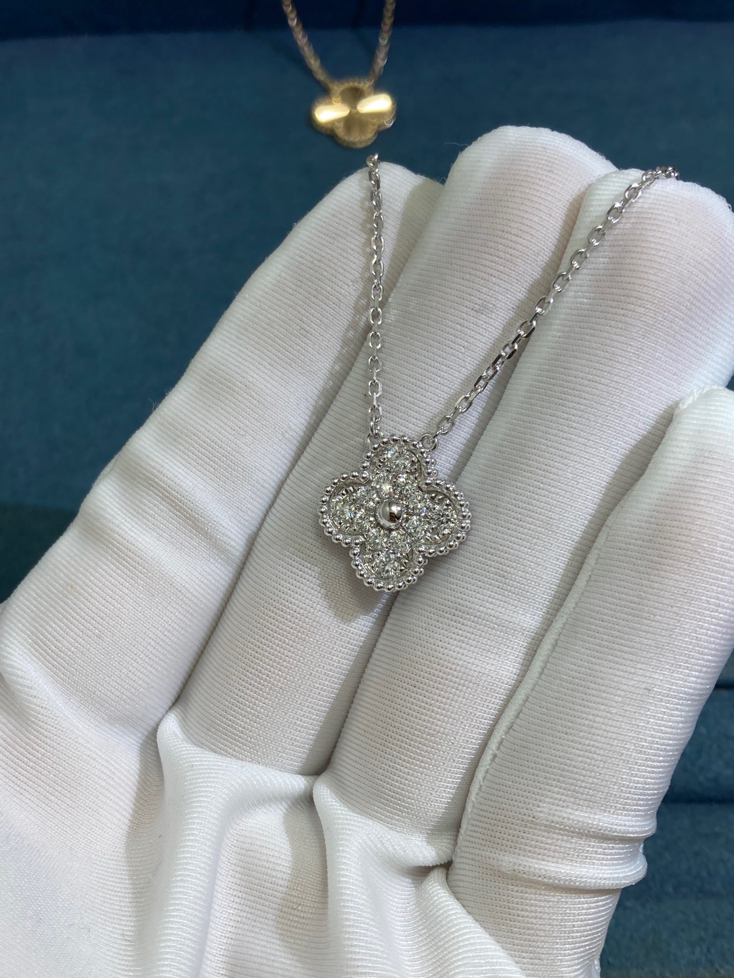 Van Cleef&Arpel Alhambra Medium Diamond Clover Necklace, White Gold