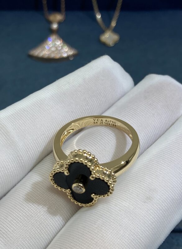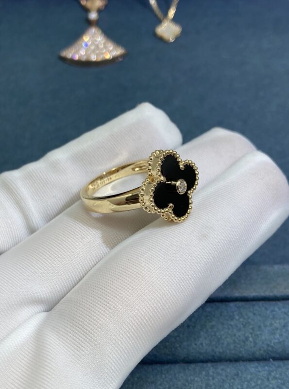 VCA Medium One Diamond Black Onyx Clover Ring, Yellow Gold