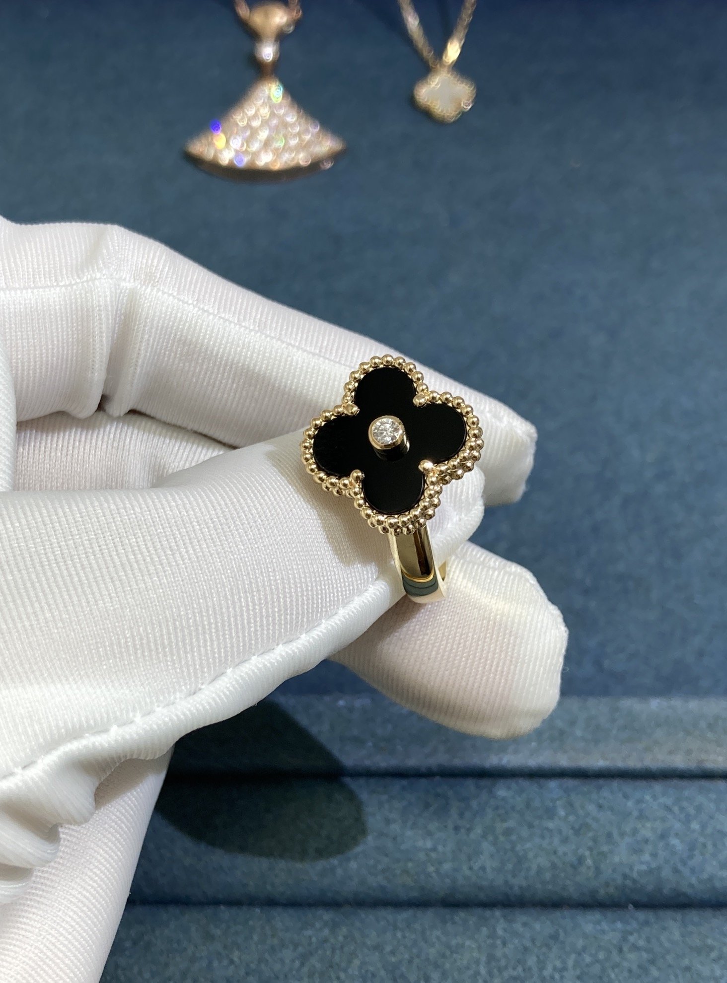 VCA Medium One Diamond Black Onyx Clover Ring, Yellow Gold