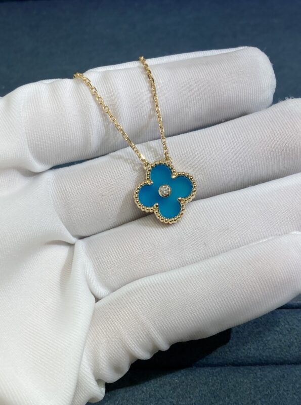 VCA Medium One Diamond Blue Agate Clover Necklace, Yellow Gold