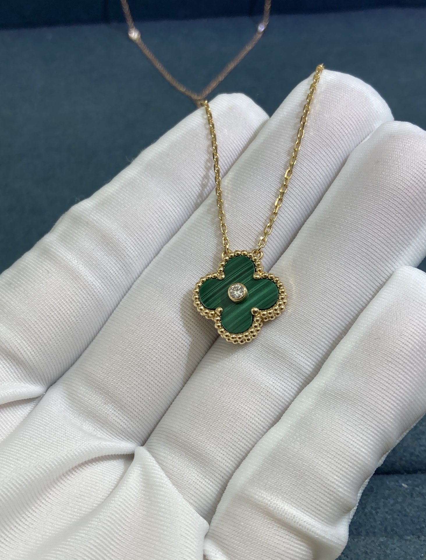 VCA Medium One Diamond Malachite Clover Necklace, Yellow Gold |
