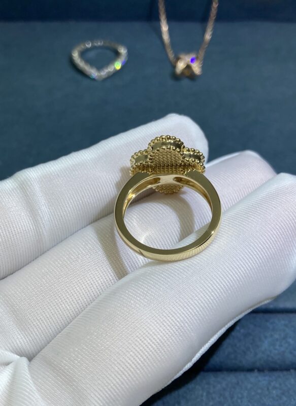 The metal used in pieces of jewelry are often a lustrous yellow or white gold, which is expertly polished to a mirror-like finish. The precious stones are carefully selected by our masters and set in a precise manner, showing off their color, clarity, and brilliance to their full potential.