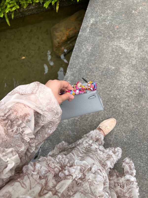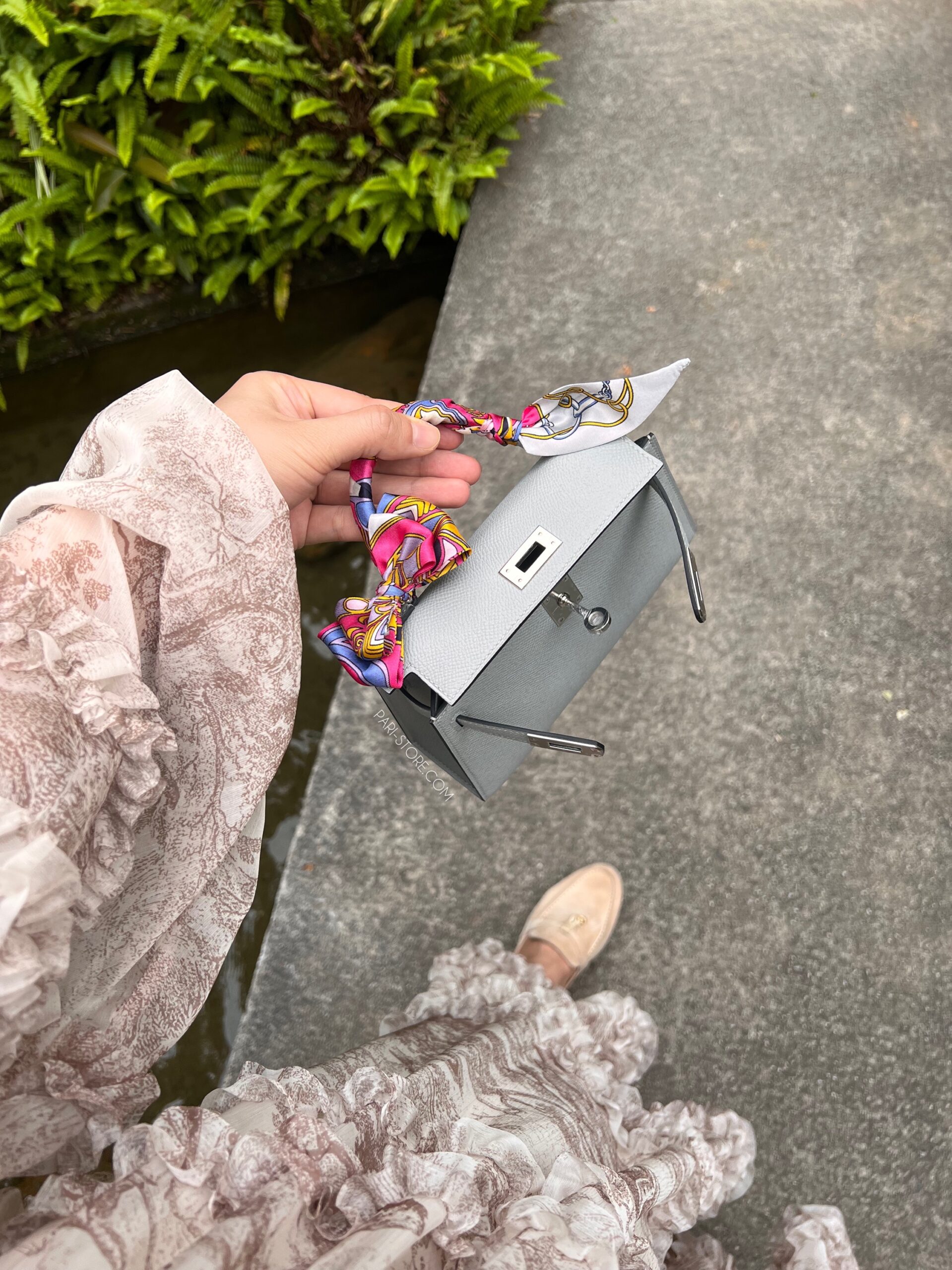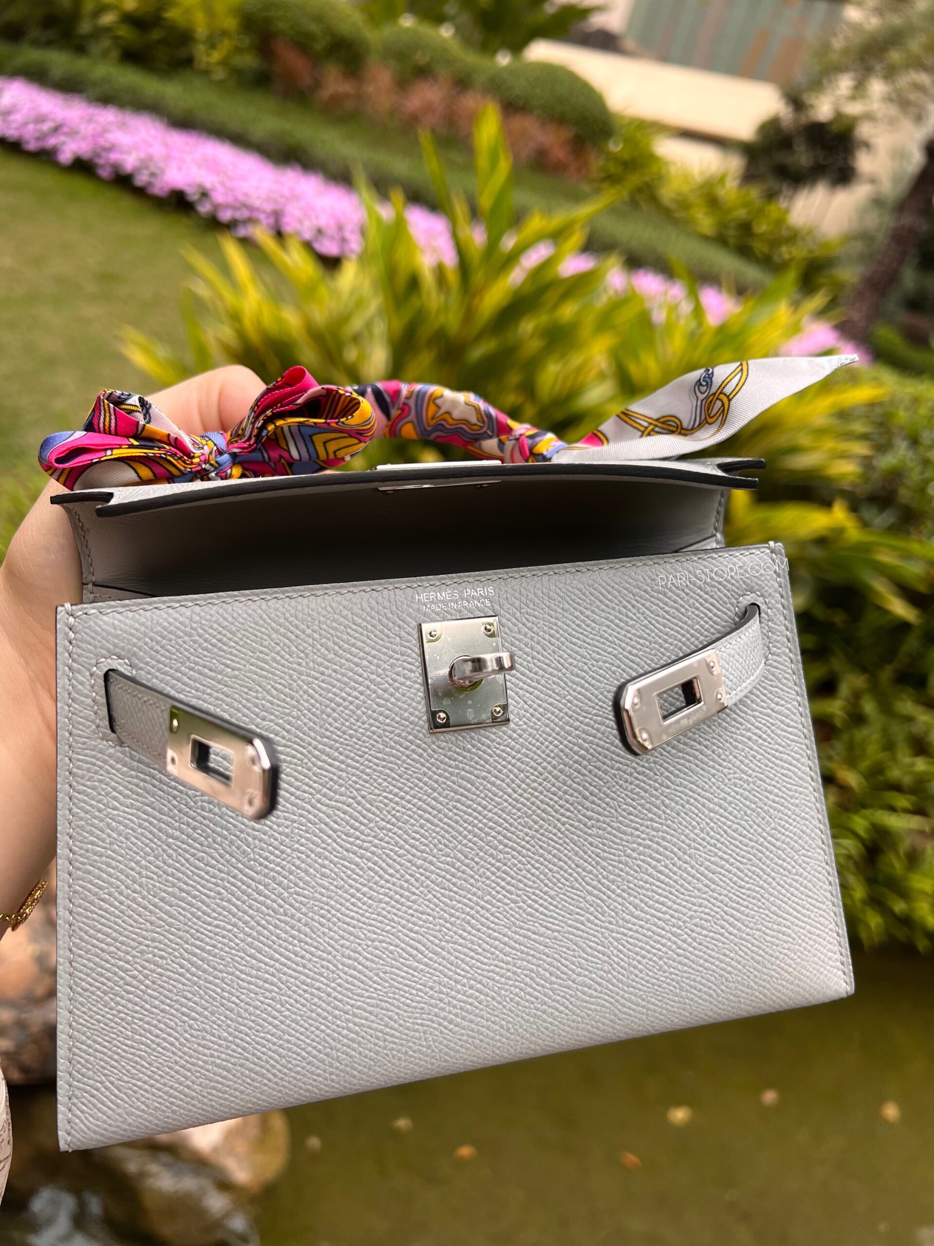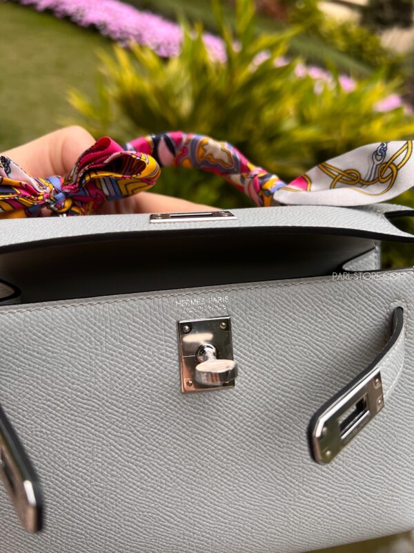 Mini Kelly in Epsom leather in Glacier Blue white colour. Fully hand-sewn with beeswax thread. Silver hardware.