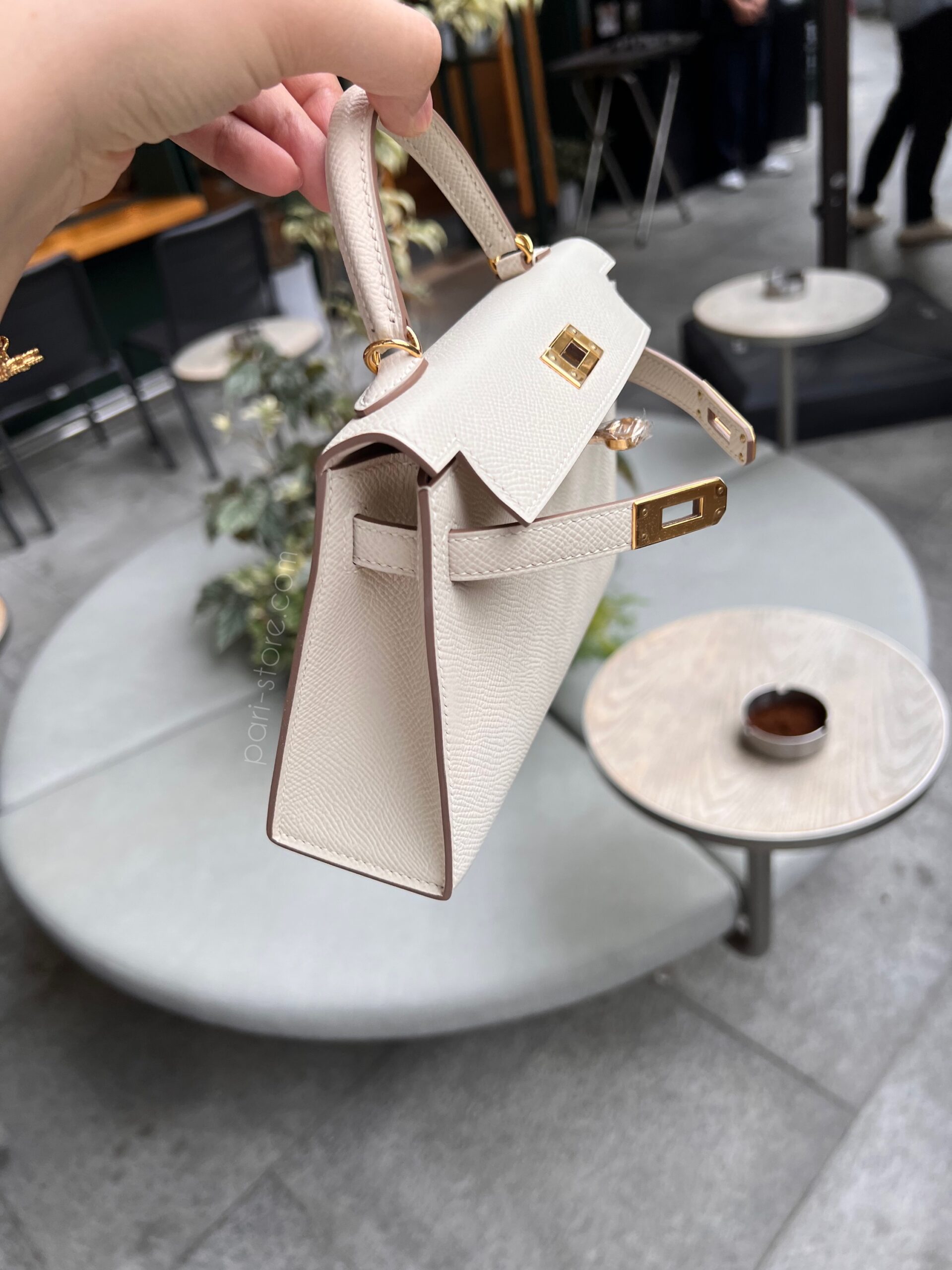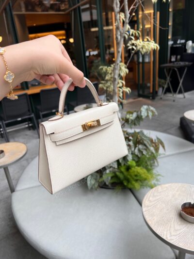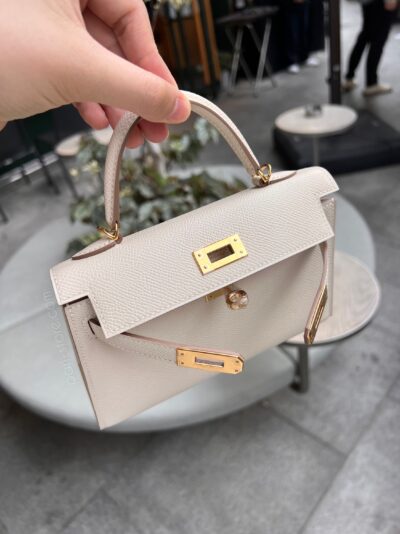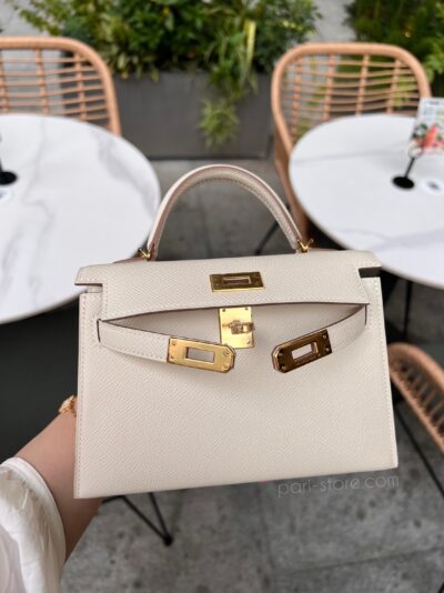 Mini Kelly in Epsom leather. In Craie white color with gold hardware.