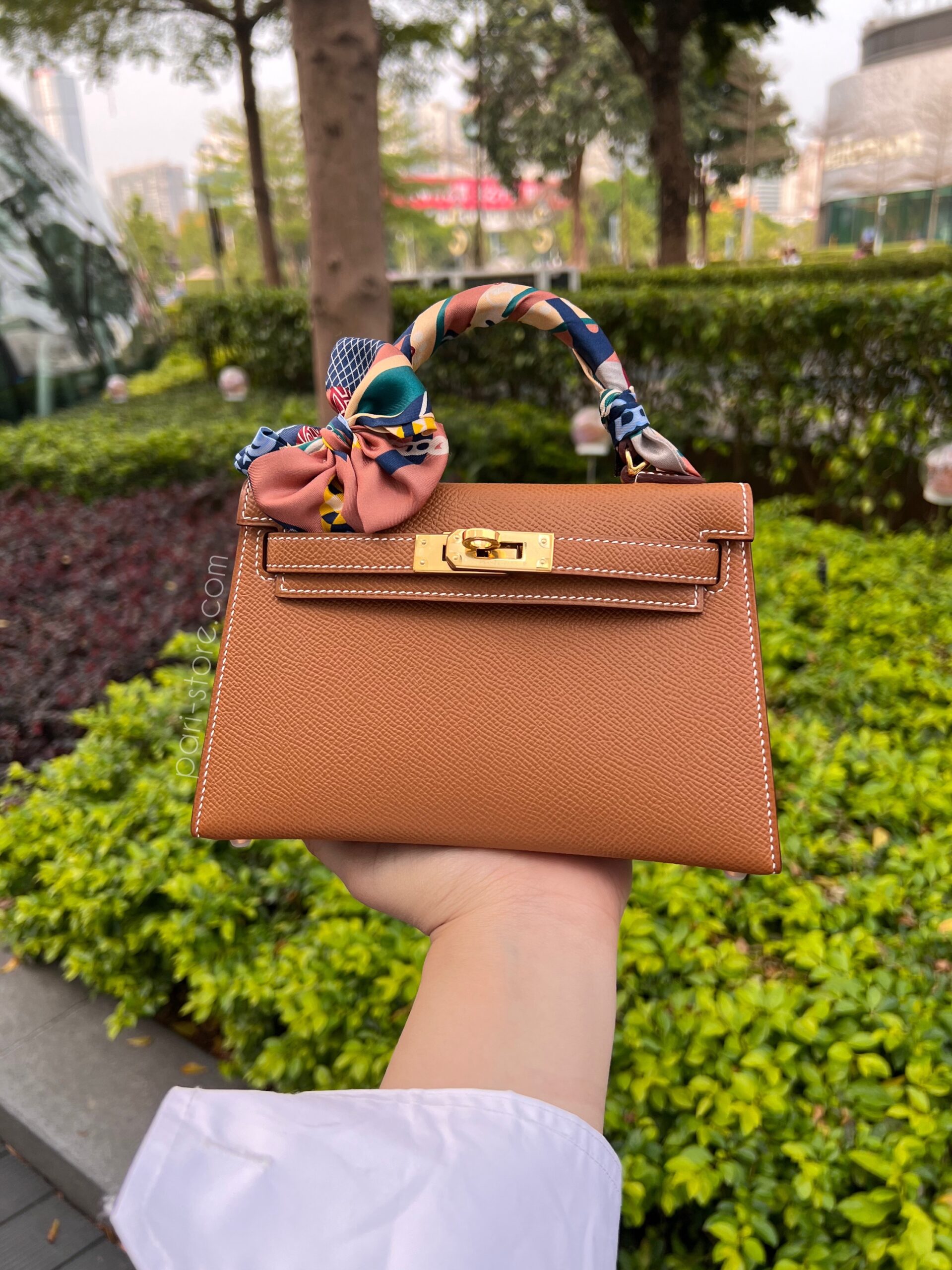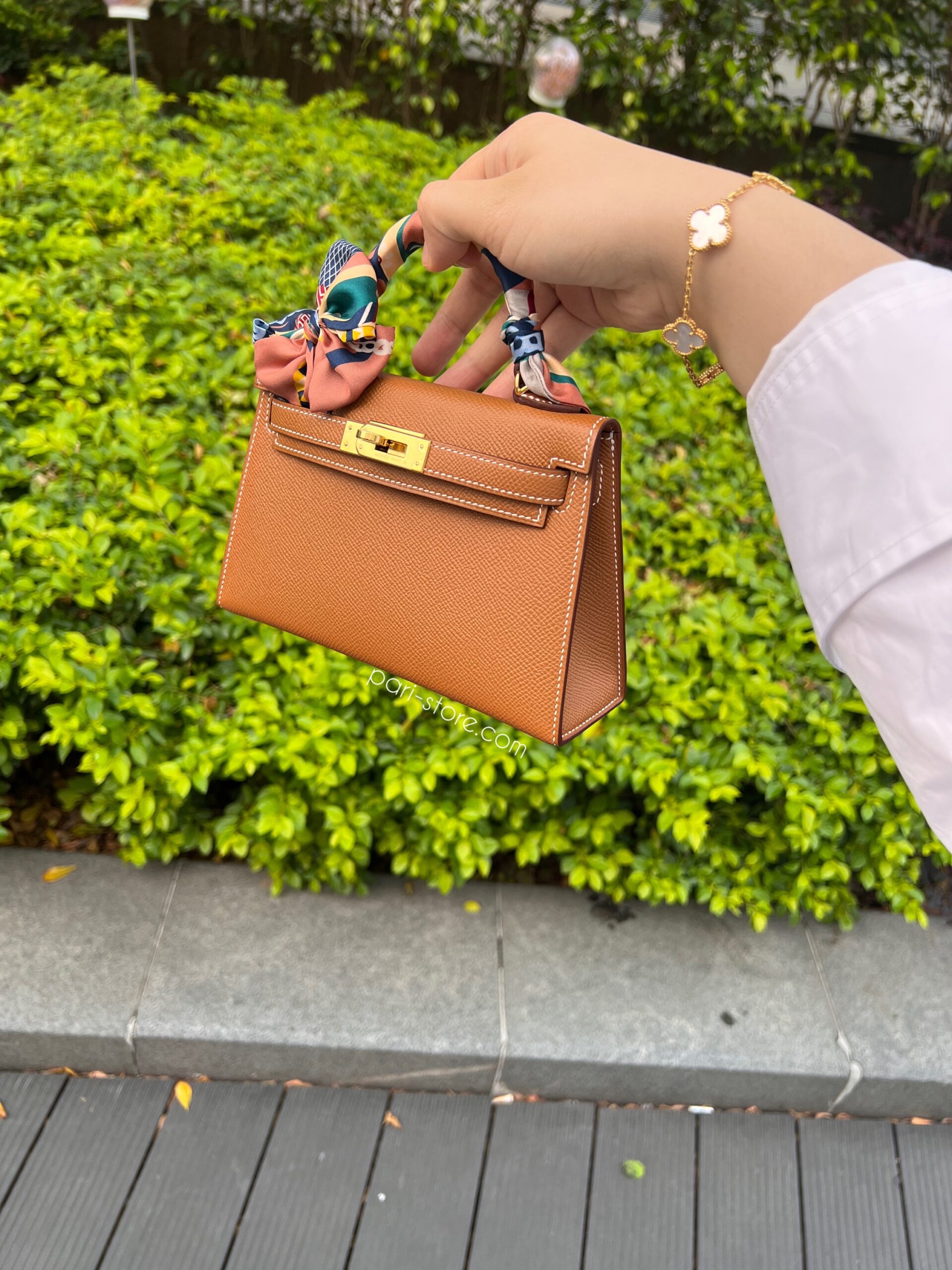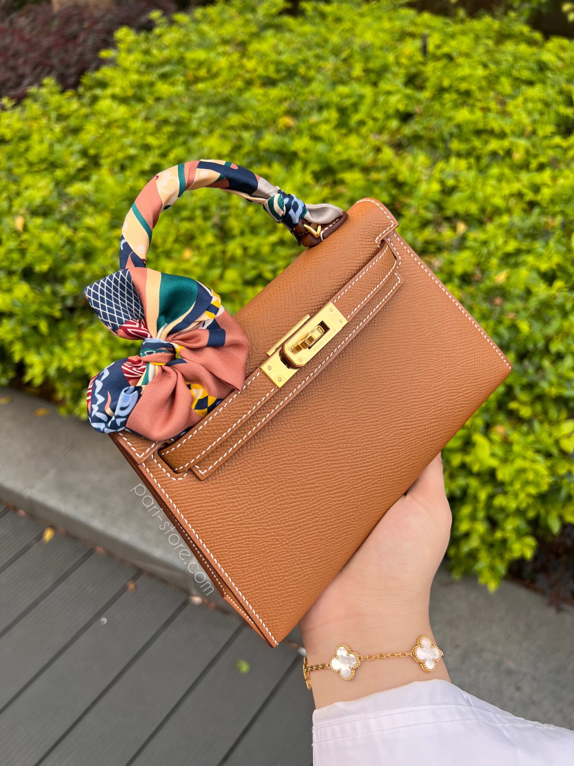 Mini Kelly in Epsom leather. Golden brown color with gold hardwares.