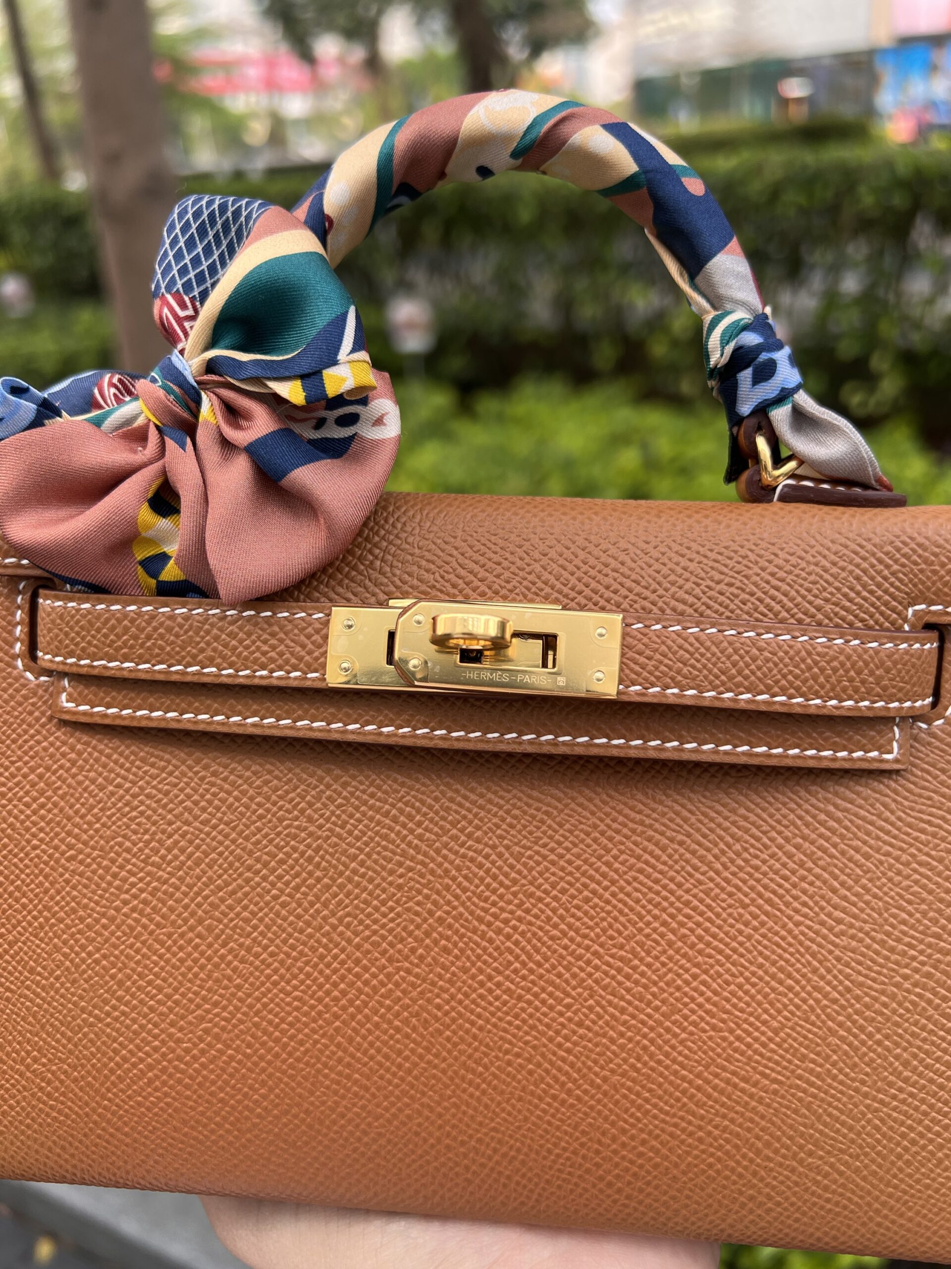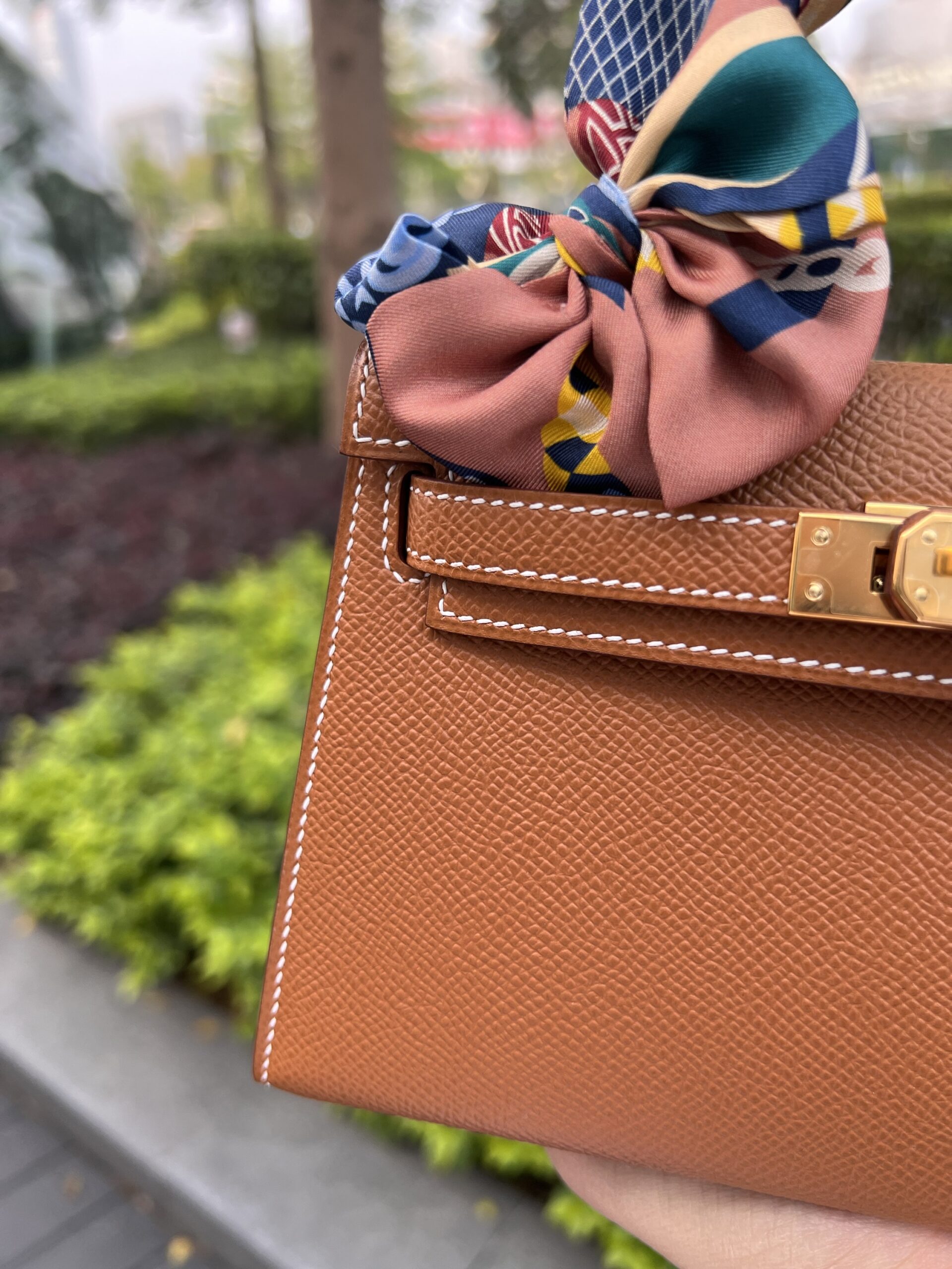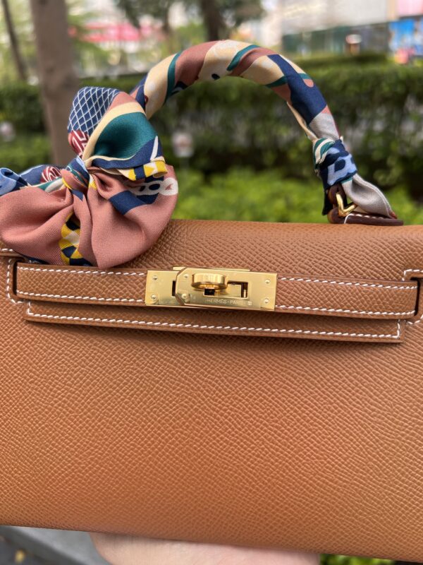 Mini Kelly in Epsom leather. Golden brown color with gold hardwares.