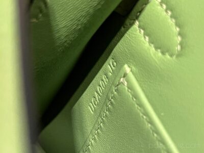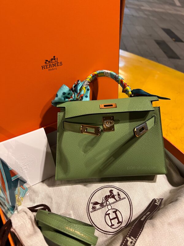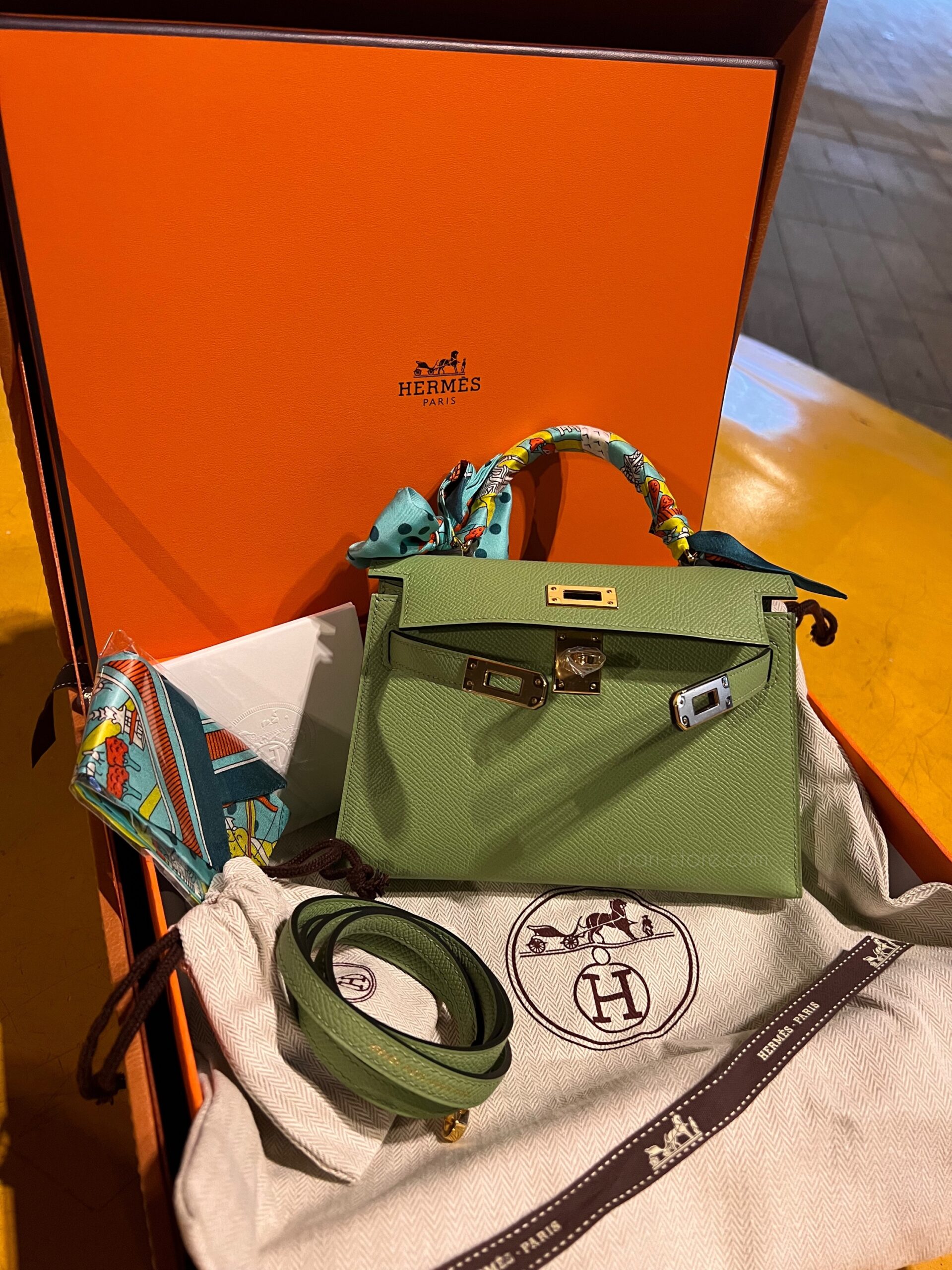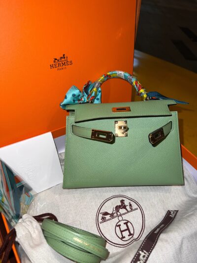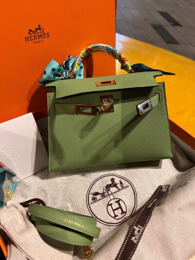 Mini Kelly in Epsom leather in Vert Criquet green colour. Fully hand-sewn with beeswax thread. Gold hardware.