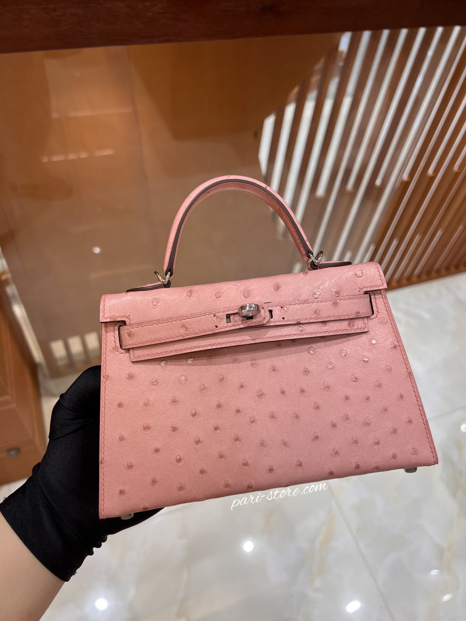 Mini Kelly in ostrich leather in Sakura pink colour. Fully hand-sewn. Silver hardware.