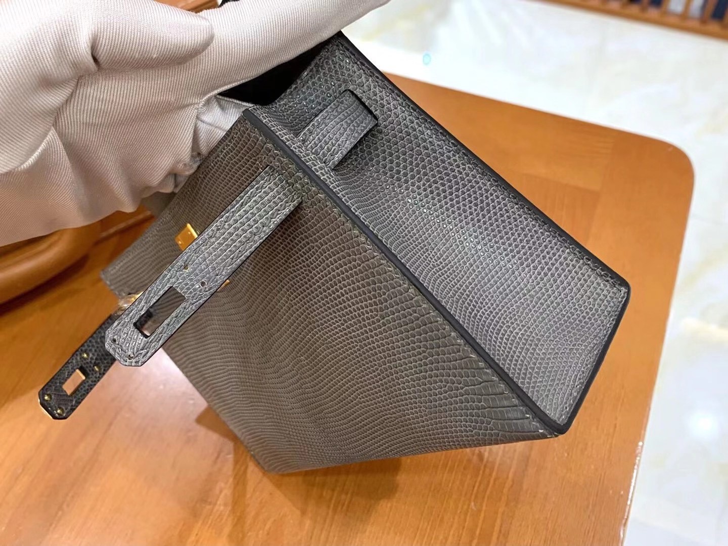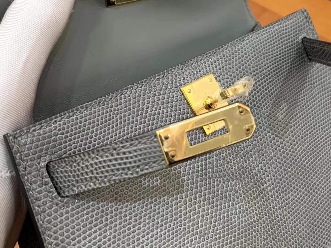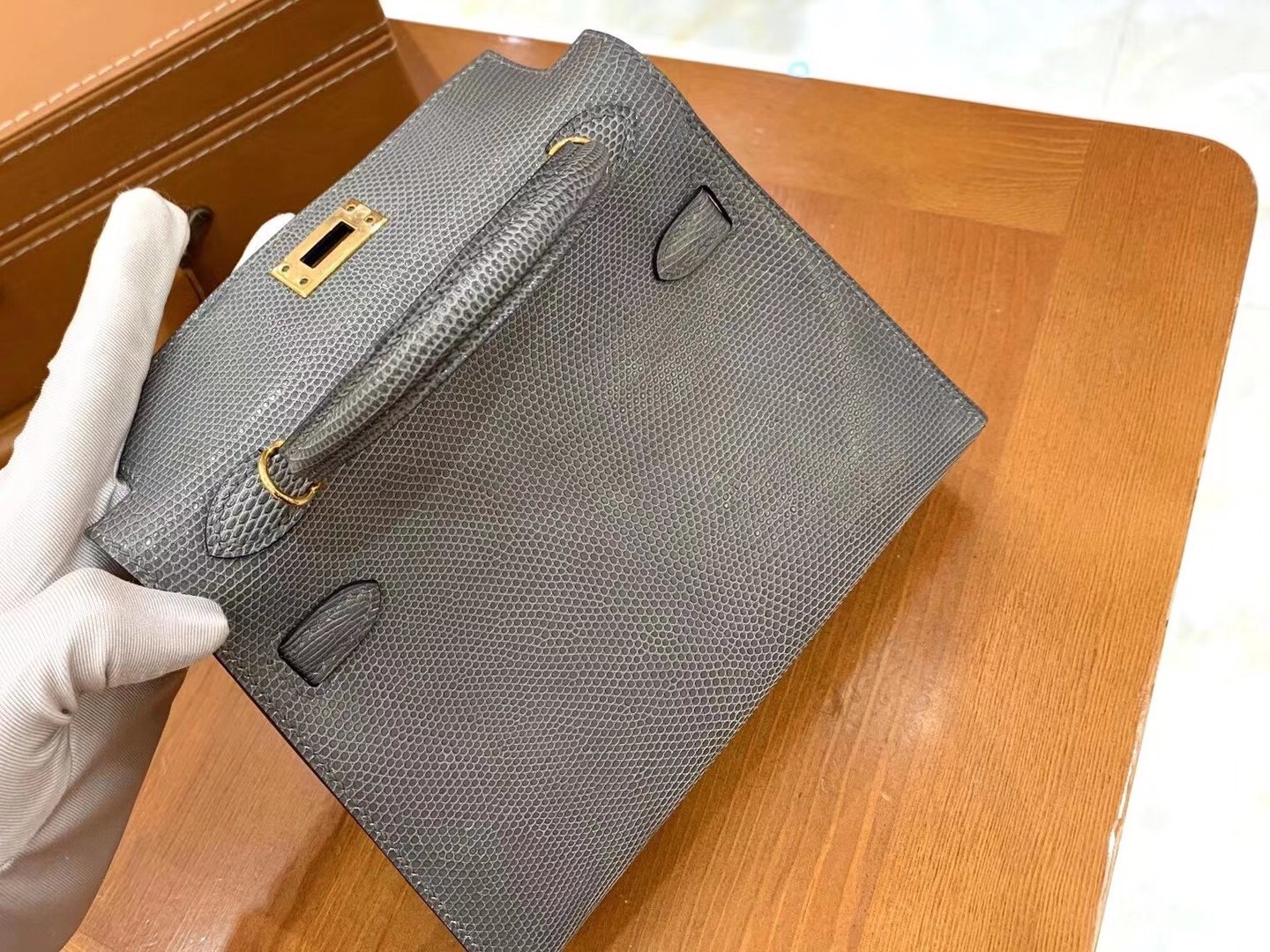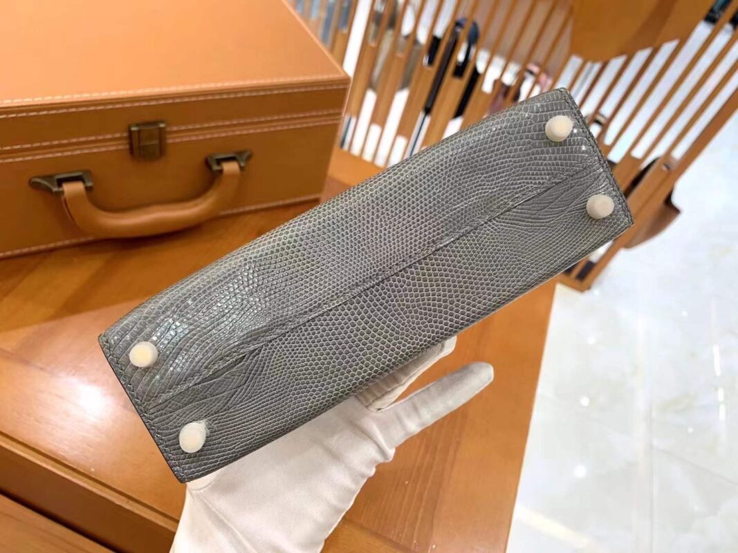 Mini Kelly II 19cm Paris Grey Imported wild lizard skin. Hand-sewn