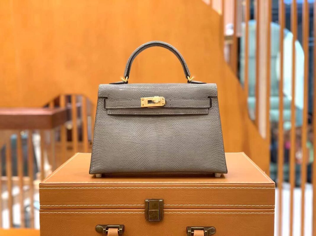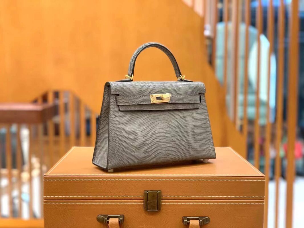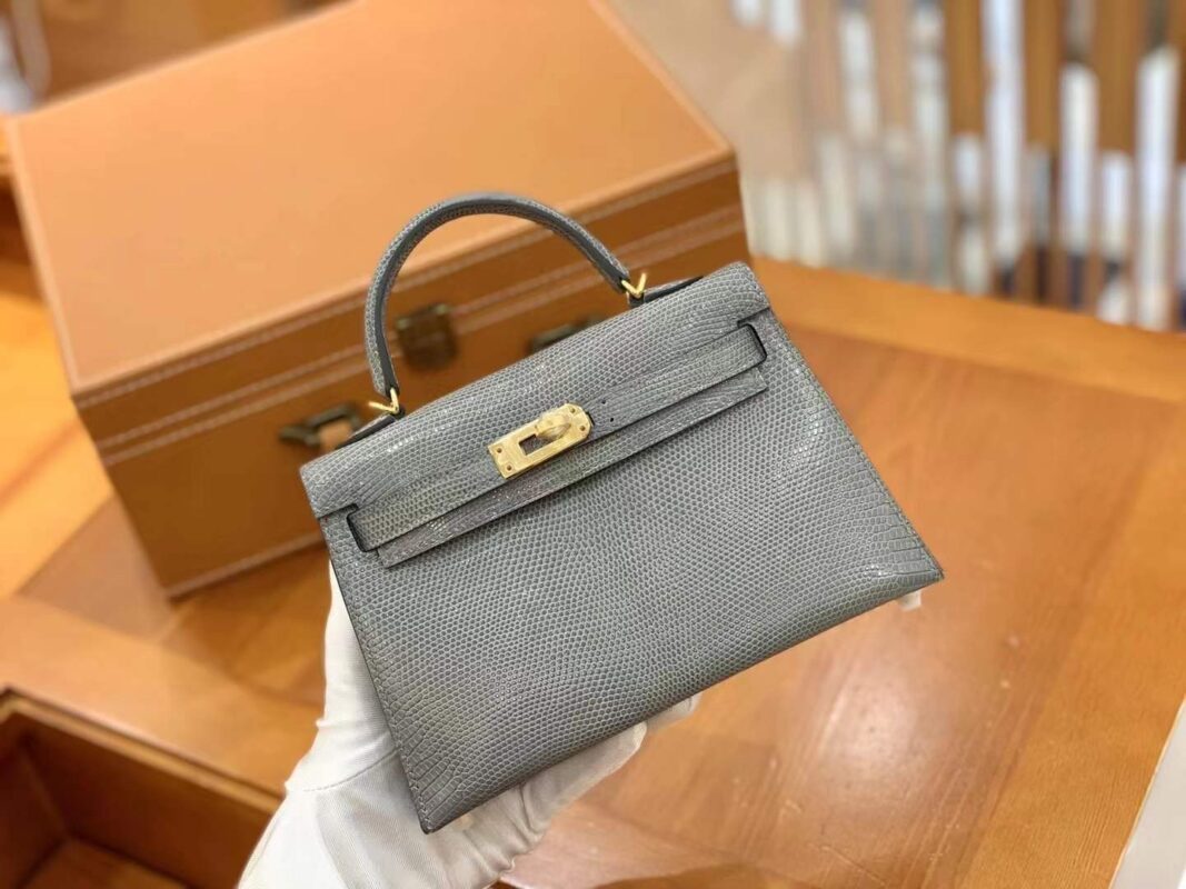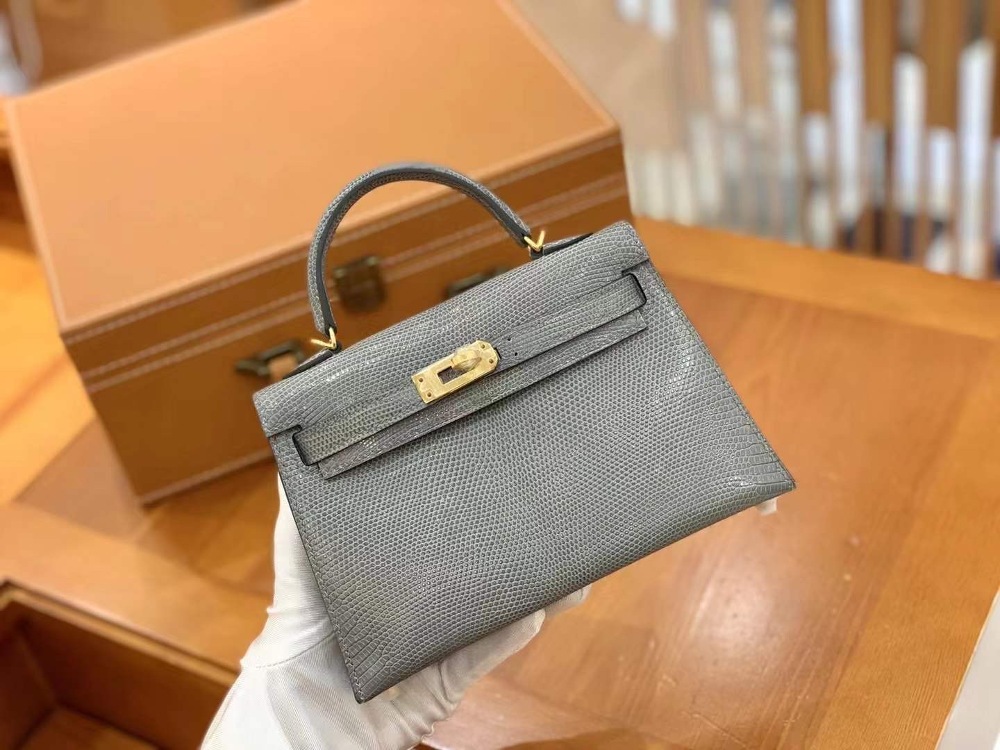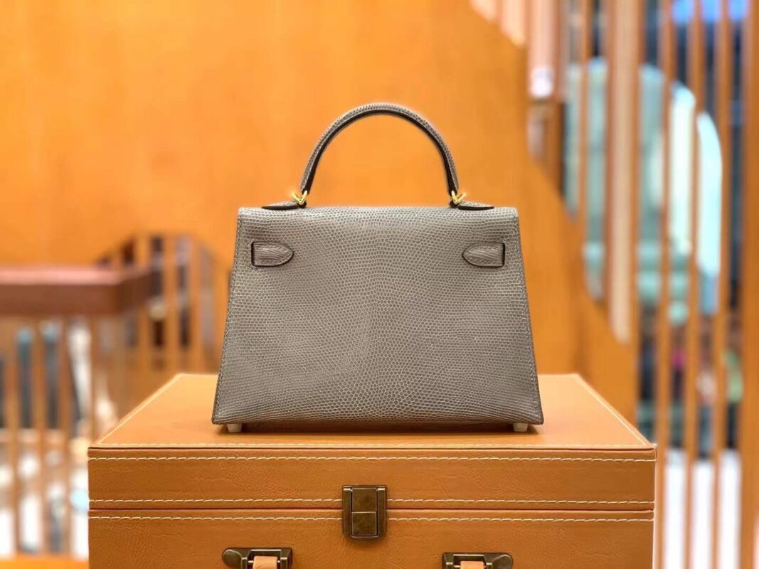 Mini Kelly II 19cm Paris Grey Imported wild lizard skin. Hand-sewn