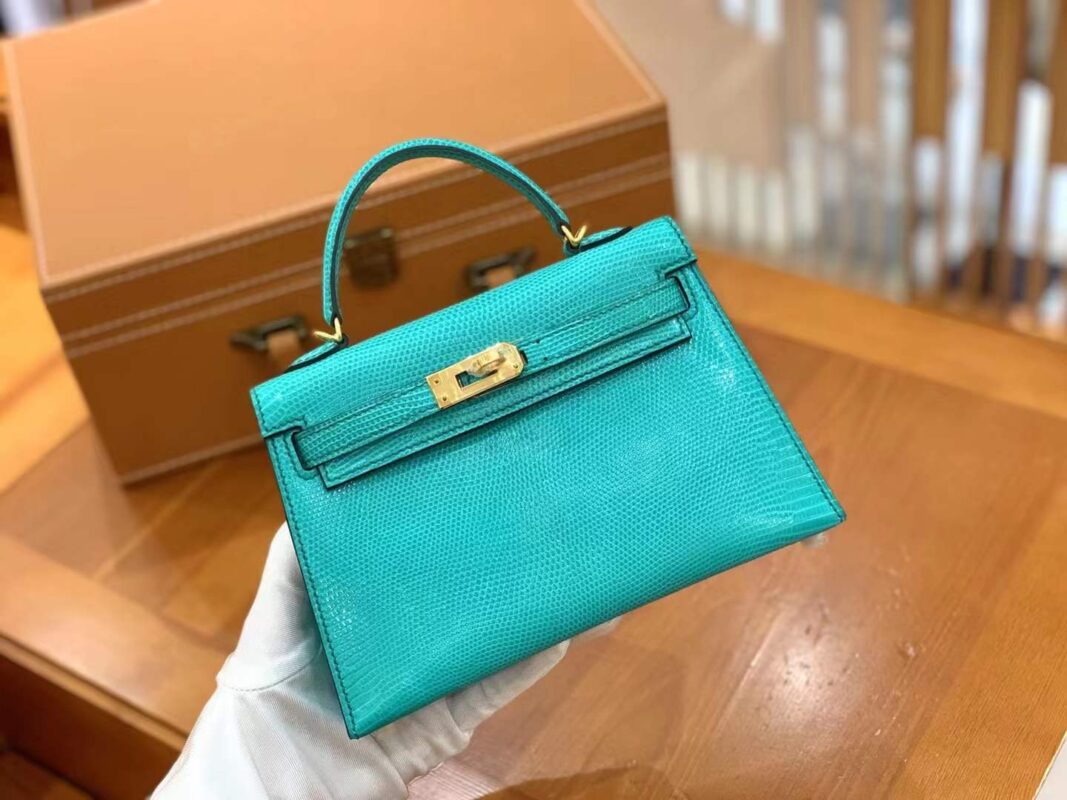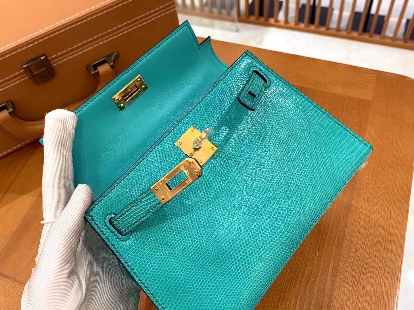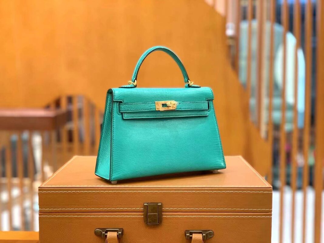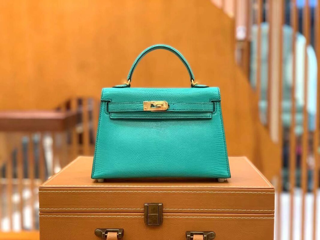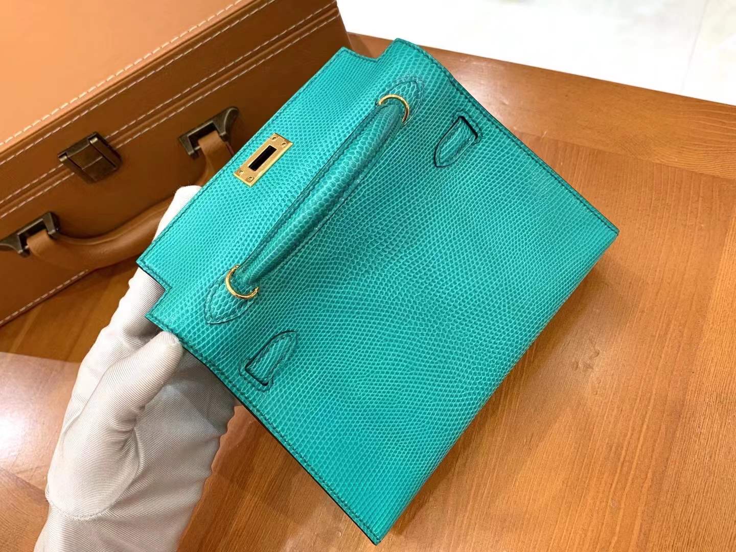 Mini Kelly II 19cm Verona Green Imported wild lizard skin. Hand-sewn