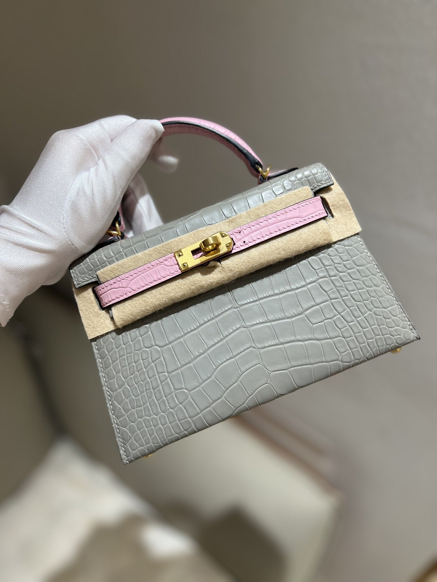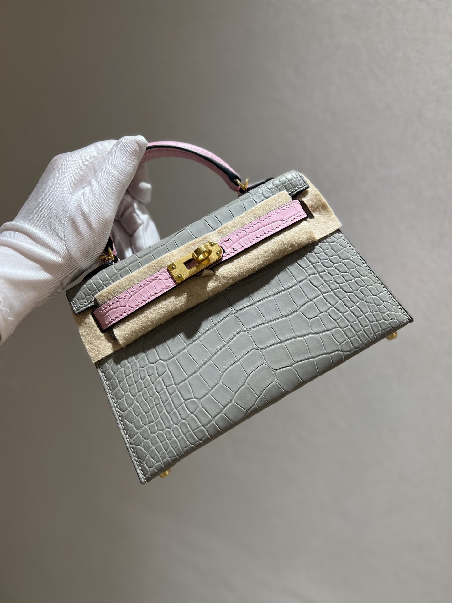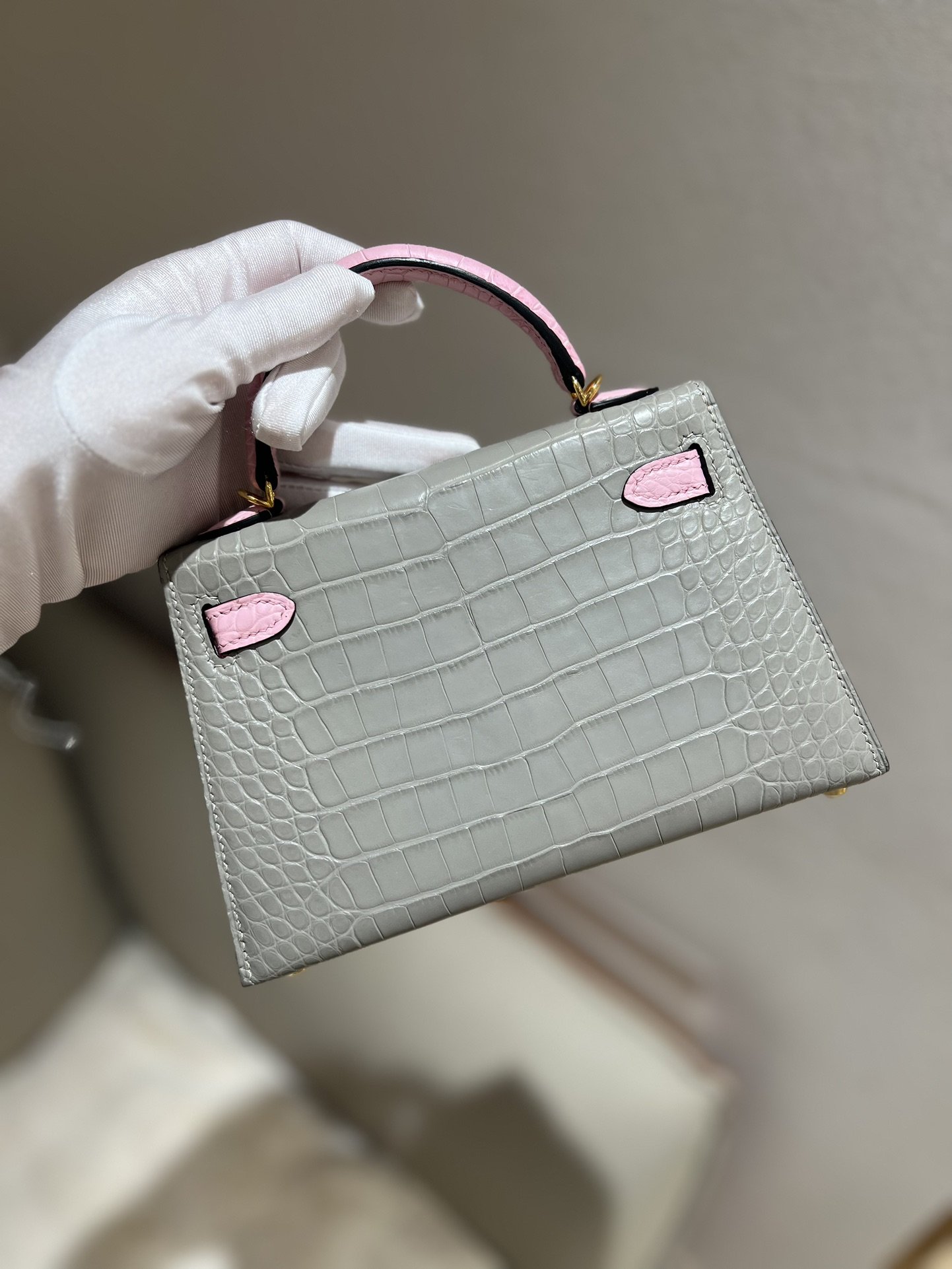 Mini Kelly in Gris Perle & Pink Matte Alligator