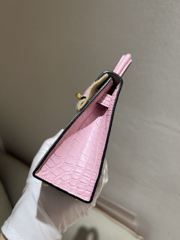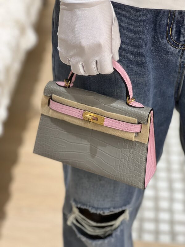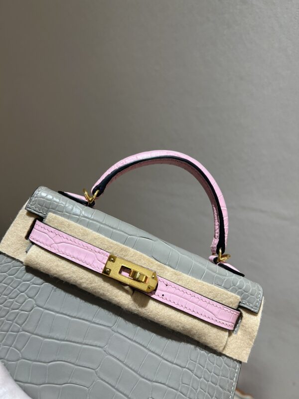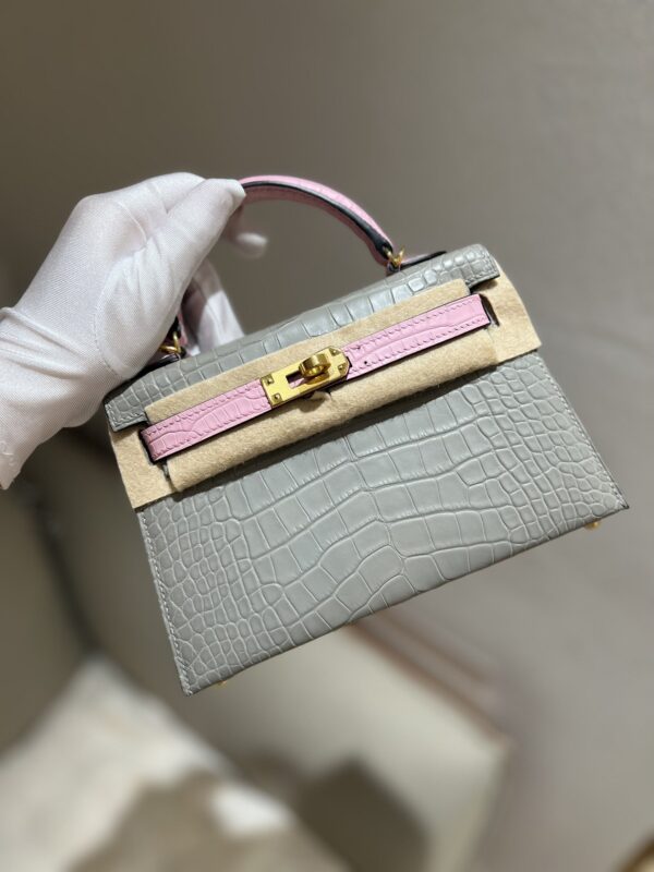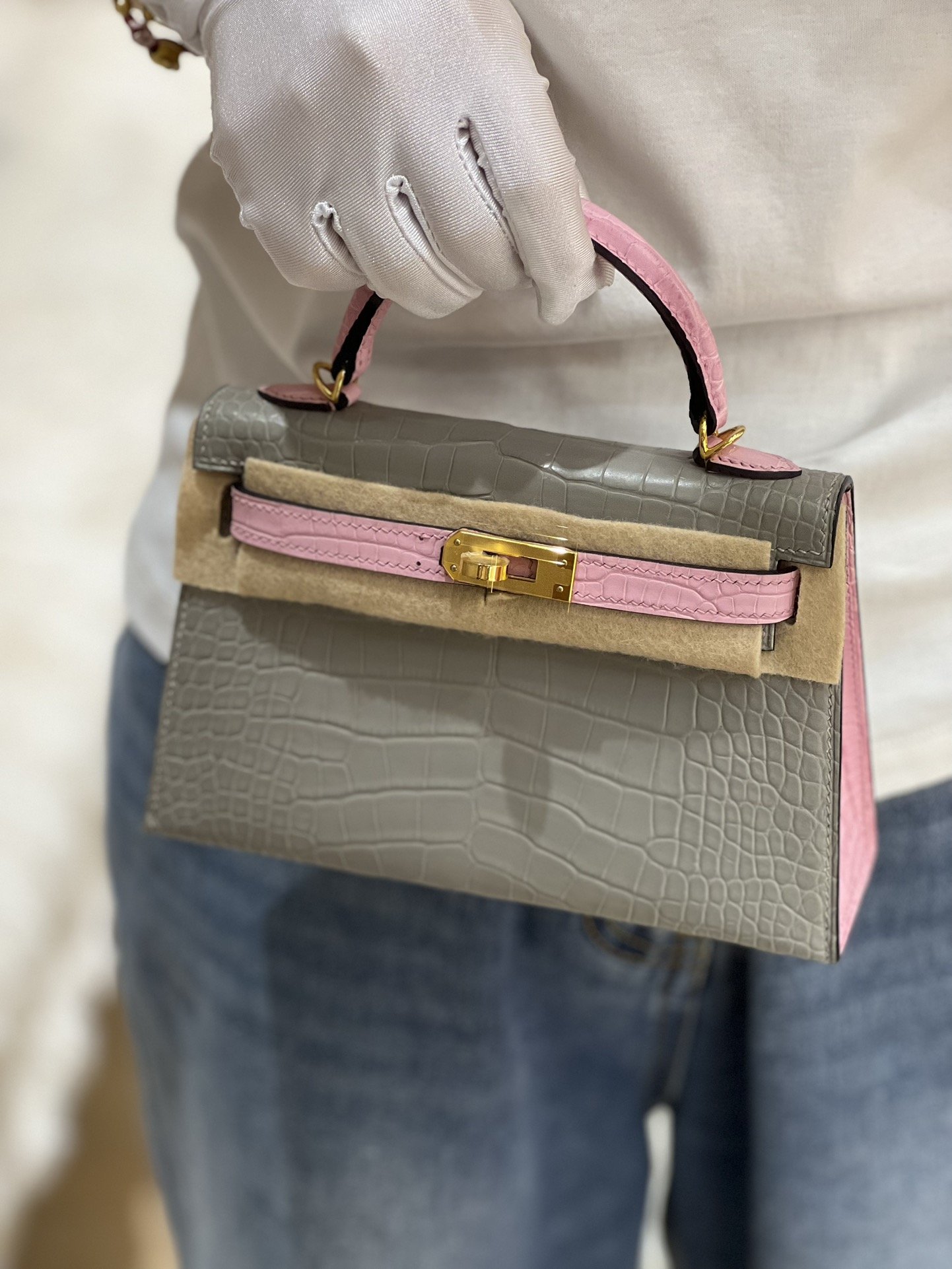 Mini Kelly in Gris Perle & Pink Matte Alligator