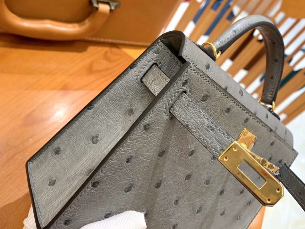 Mini Kelly 2nd Generation 19cm Mousse GreyImported South African KK grade ostrich leather. All hand-sewn