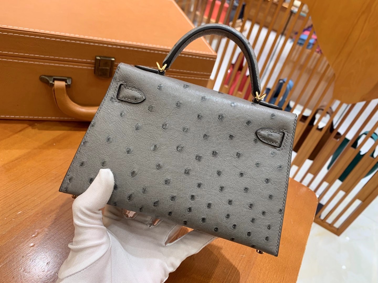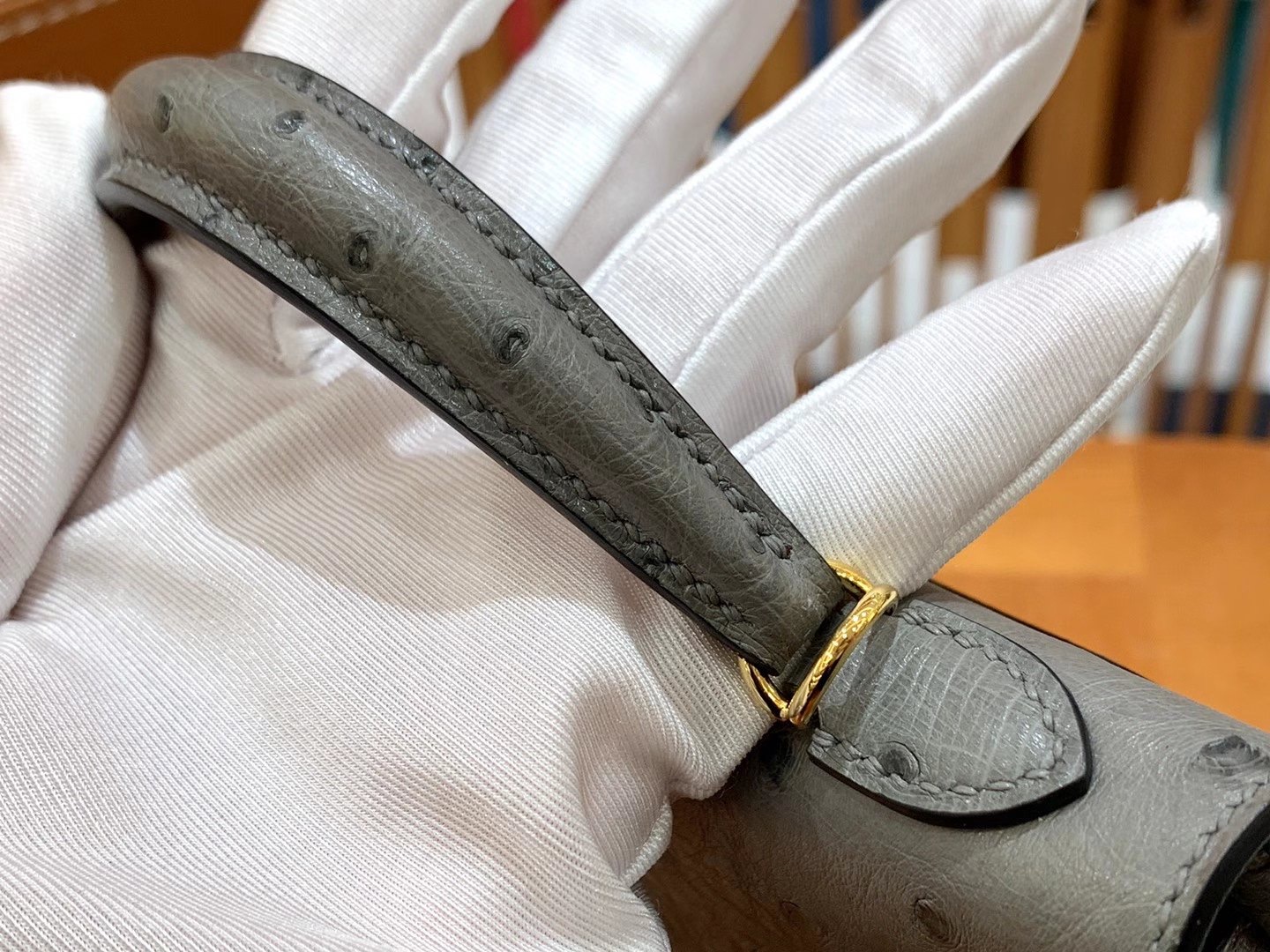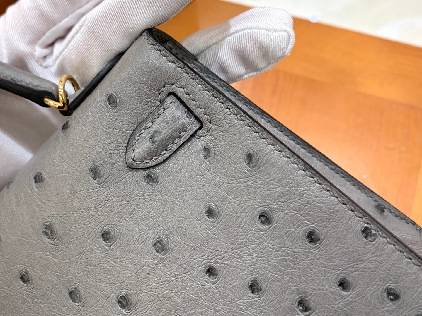 Mini Kelly 2nd Generation 19cm Mousse GreyImported South African KK grade ostrich leather. All hand-sewn