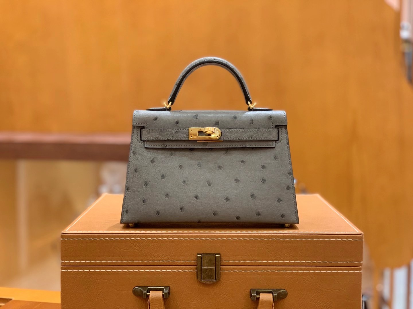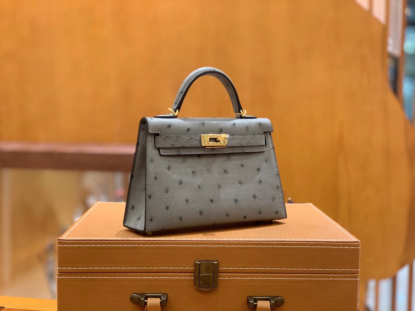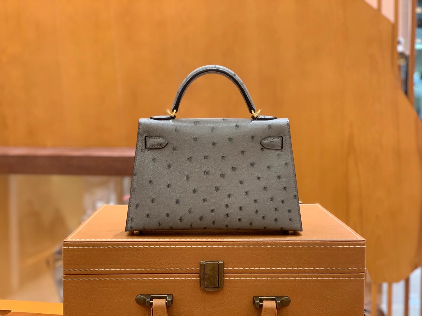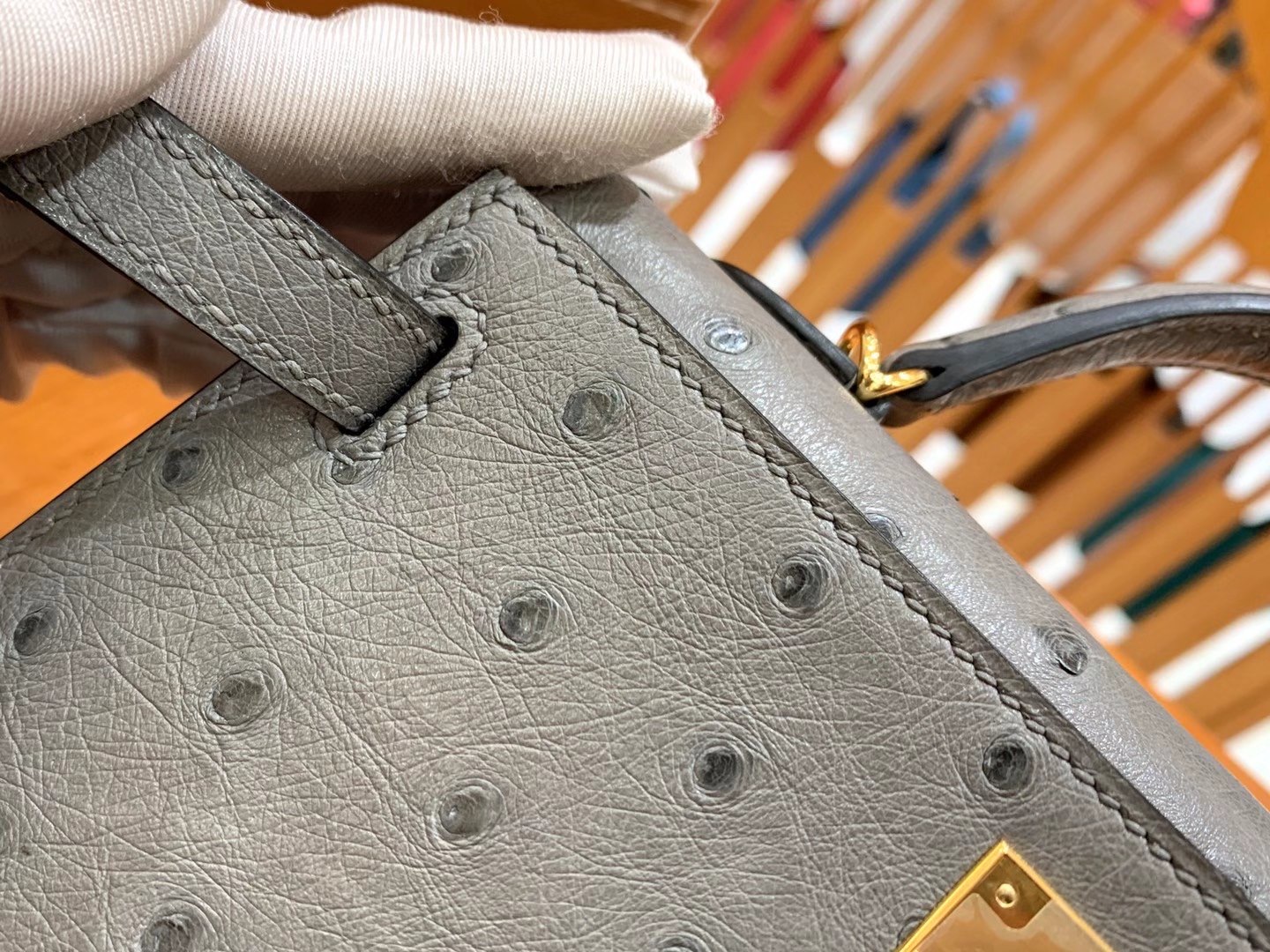 Mini Kelly 2nd Generation 19cm Mousse GreyImported South African KK grade ostrich leather. All hand-sewn