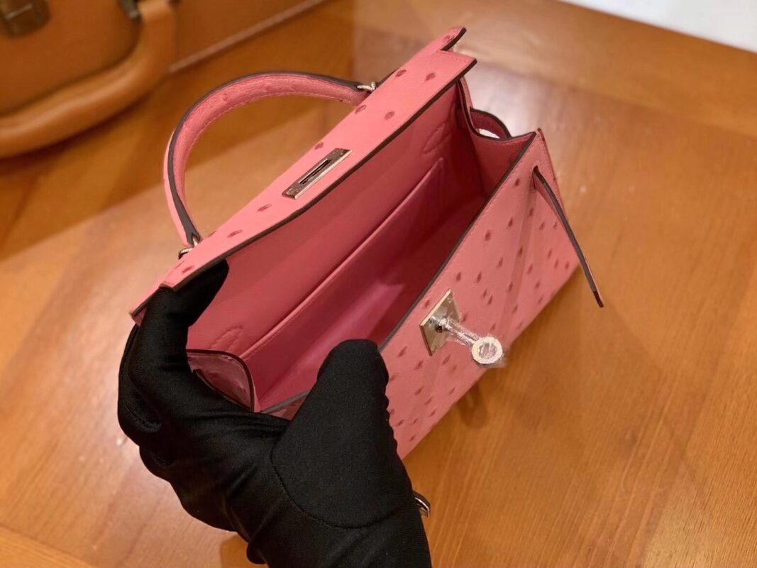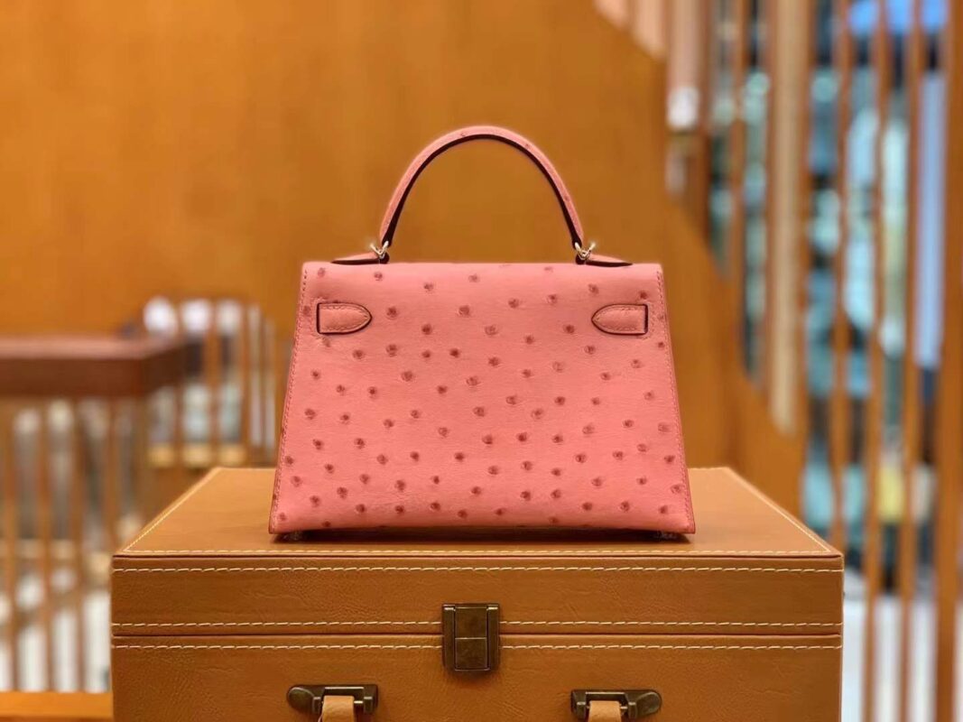 Mini Kelly II 19cm Rose Sakura. Imported South African KK grade ostrich leather. All hand-sewn
