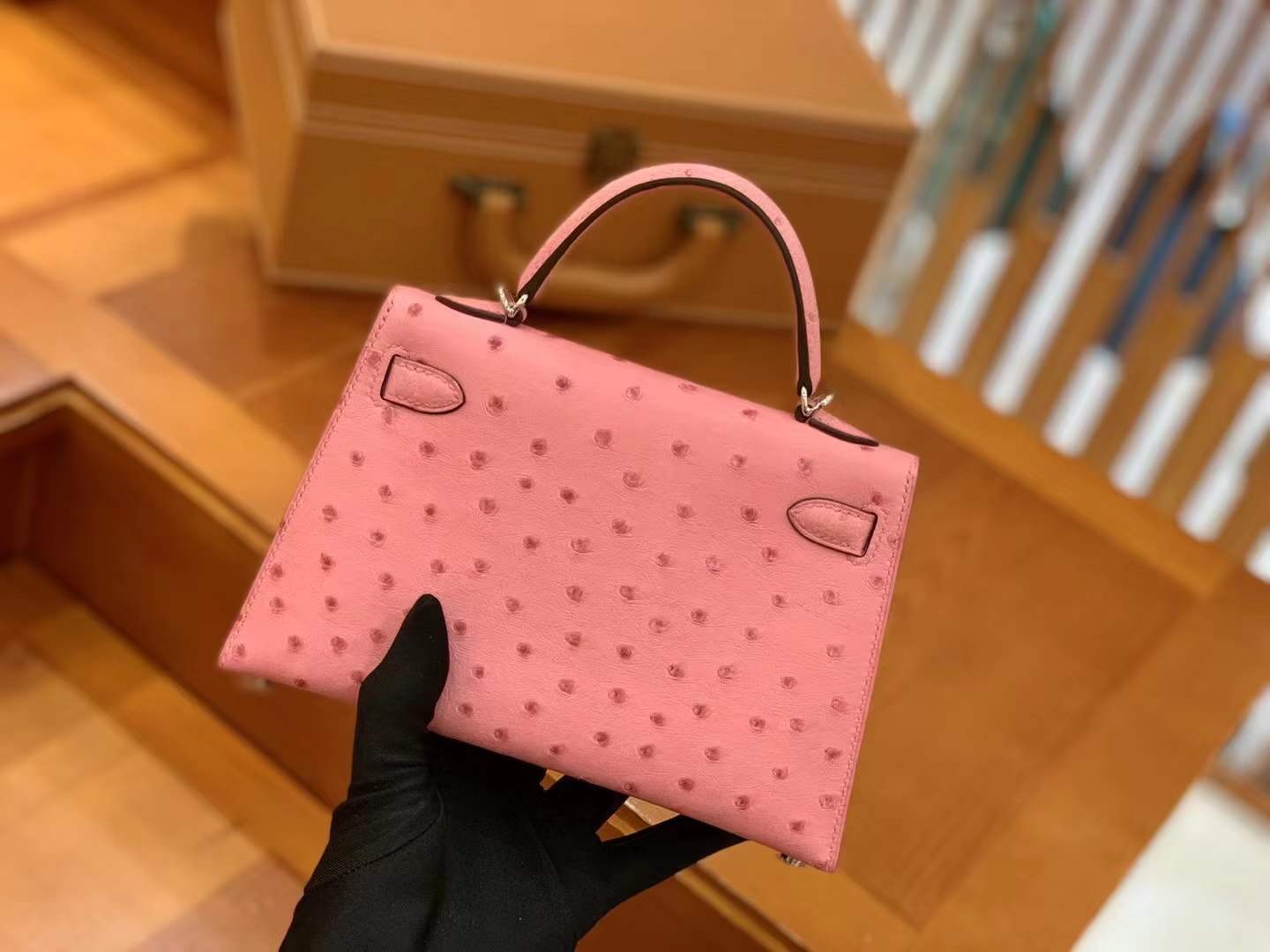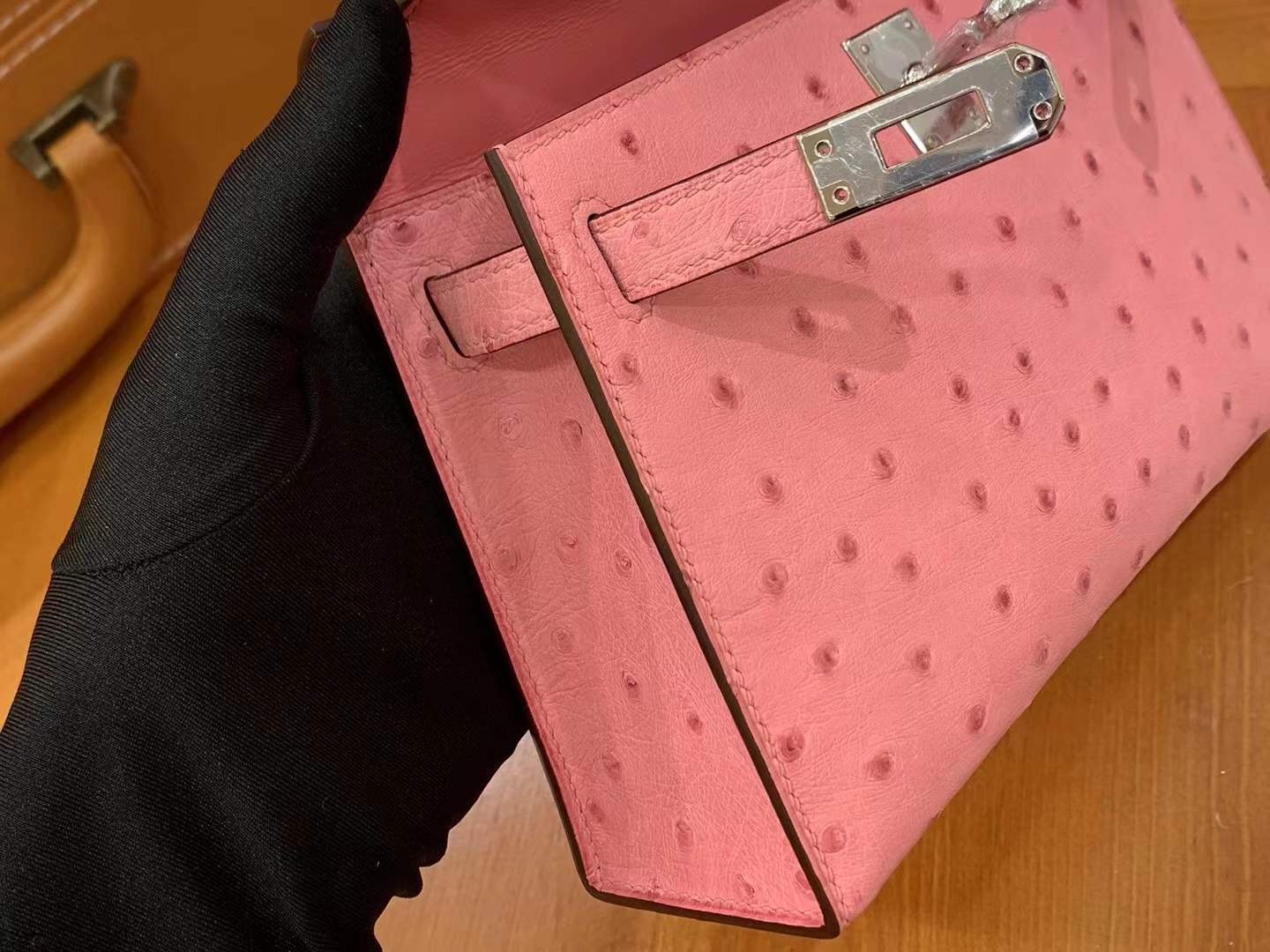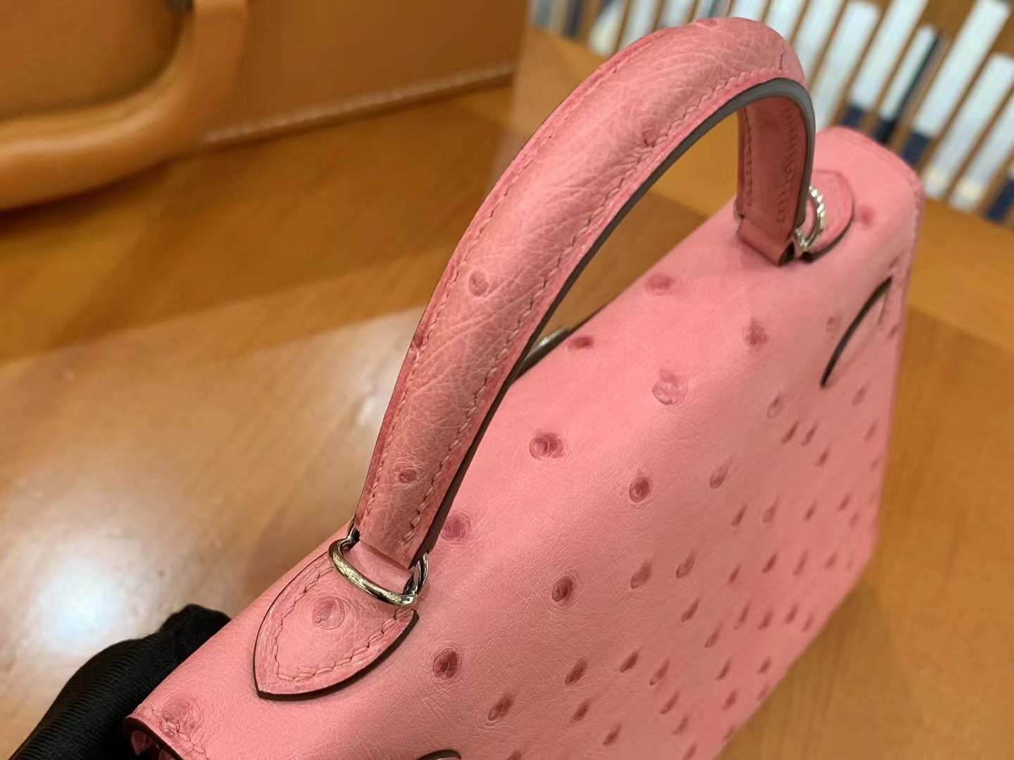 Mini Kelly II 19cm Rose Sakura. Imported South African KK grade ostrich leather. All hand-sewn