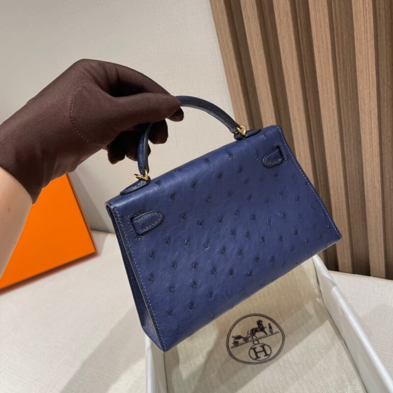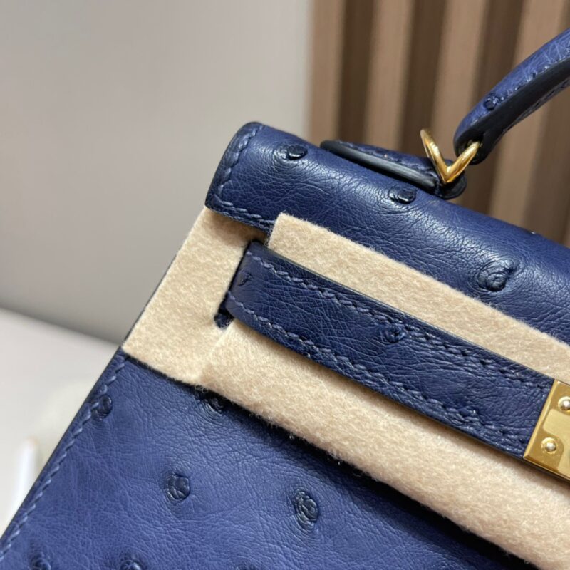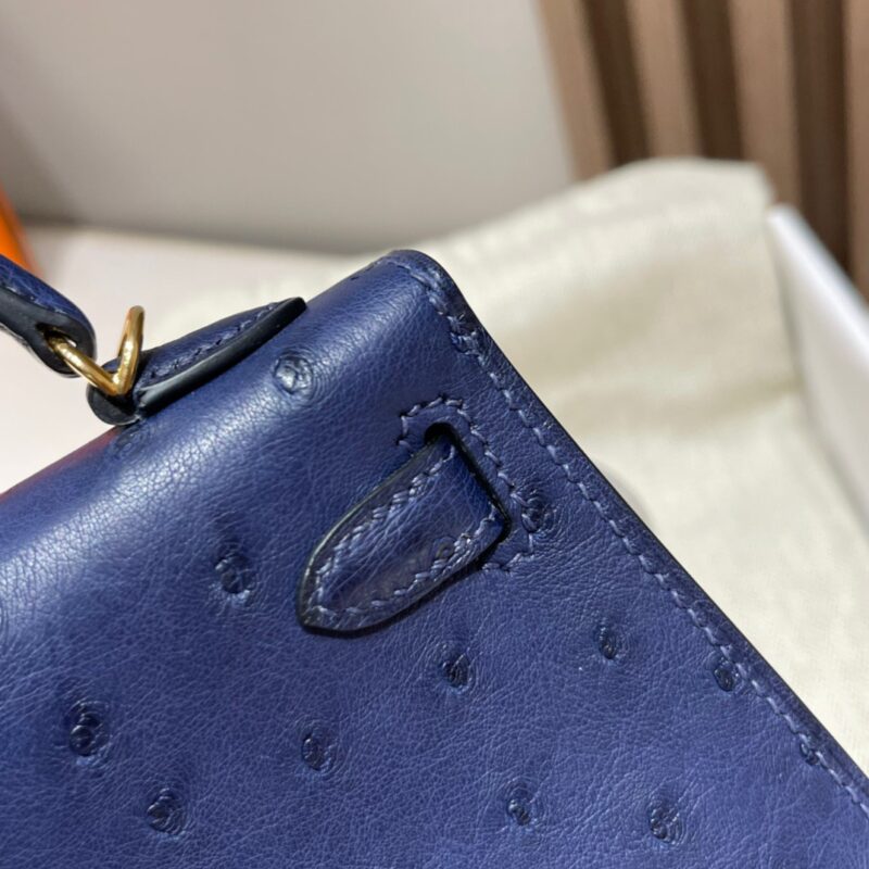 New Mini Kelly second generation ostrich leather Sapphire Blue – (Bleu Saphir) – 73 Gold Buckle