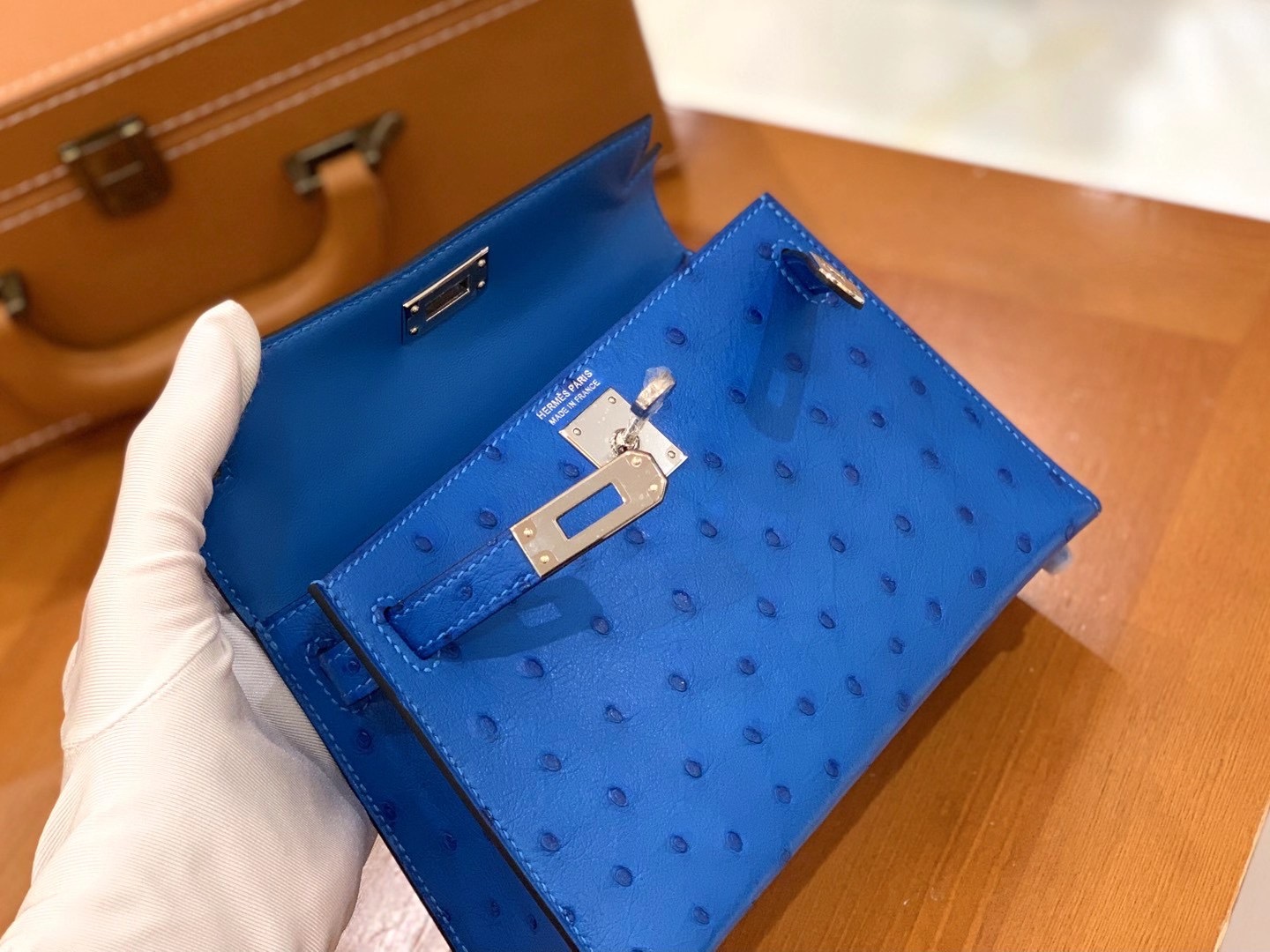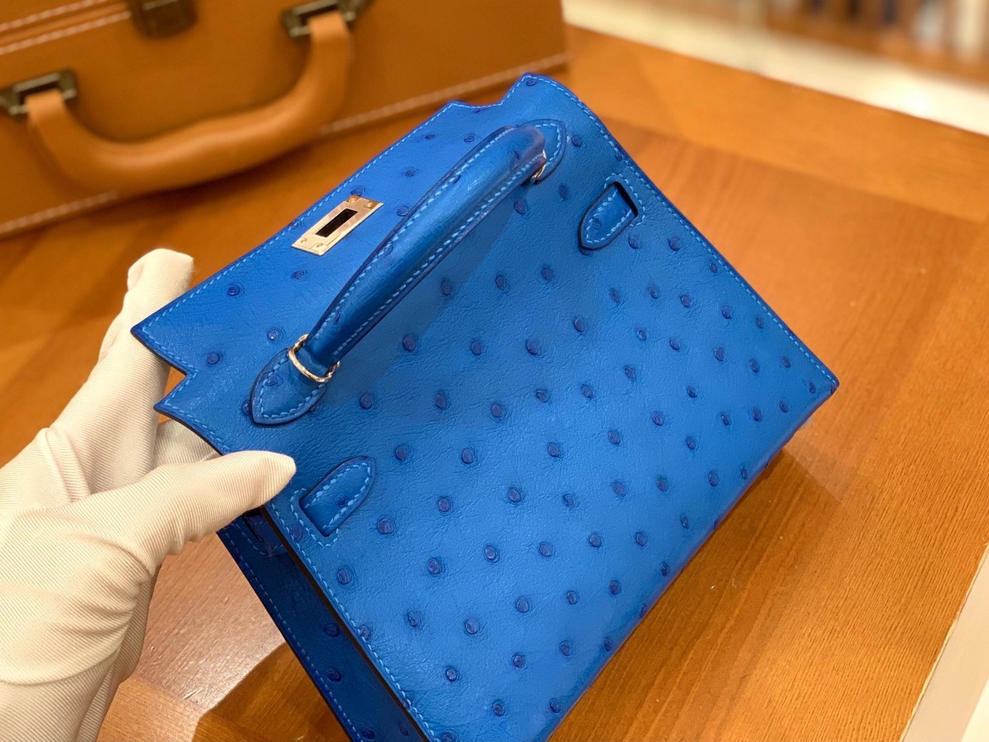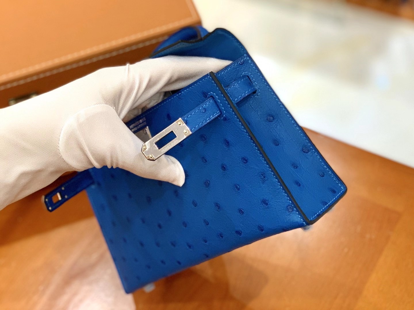 Mini Kelly second generation 19cm Water blueImported South African KK grade ostrich leather. All hand-sewn