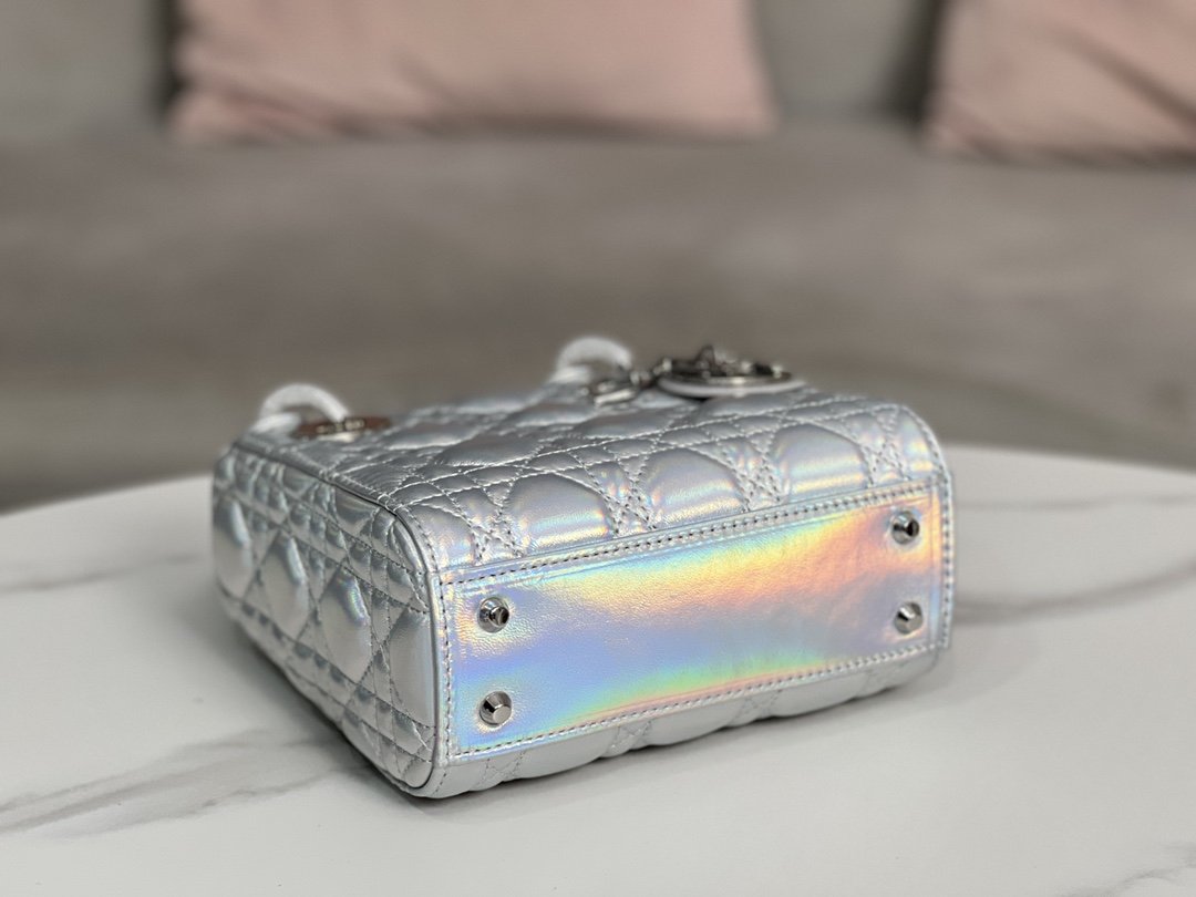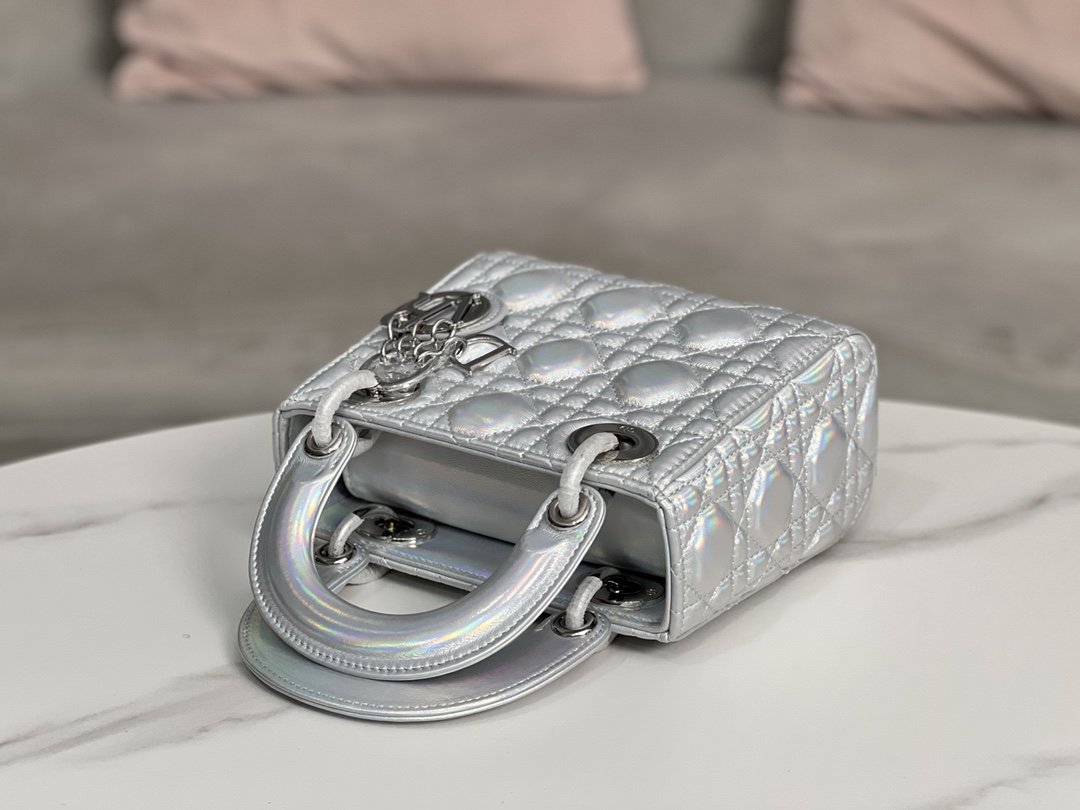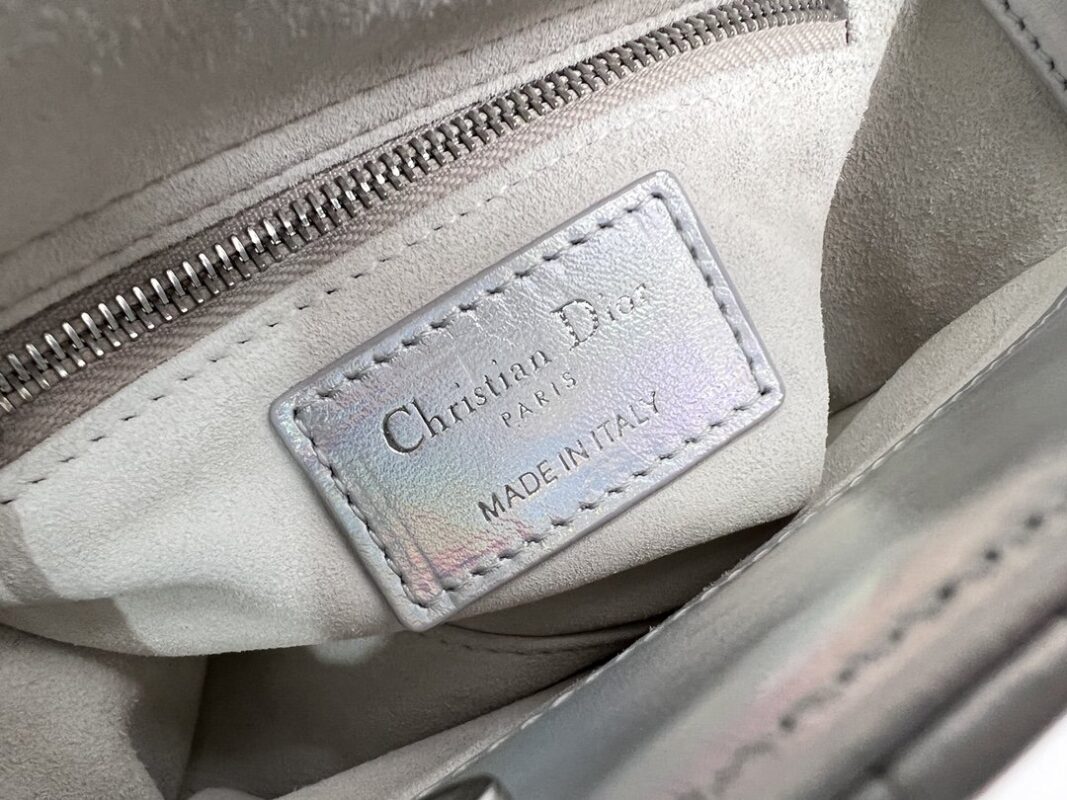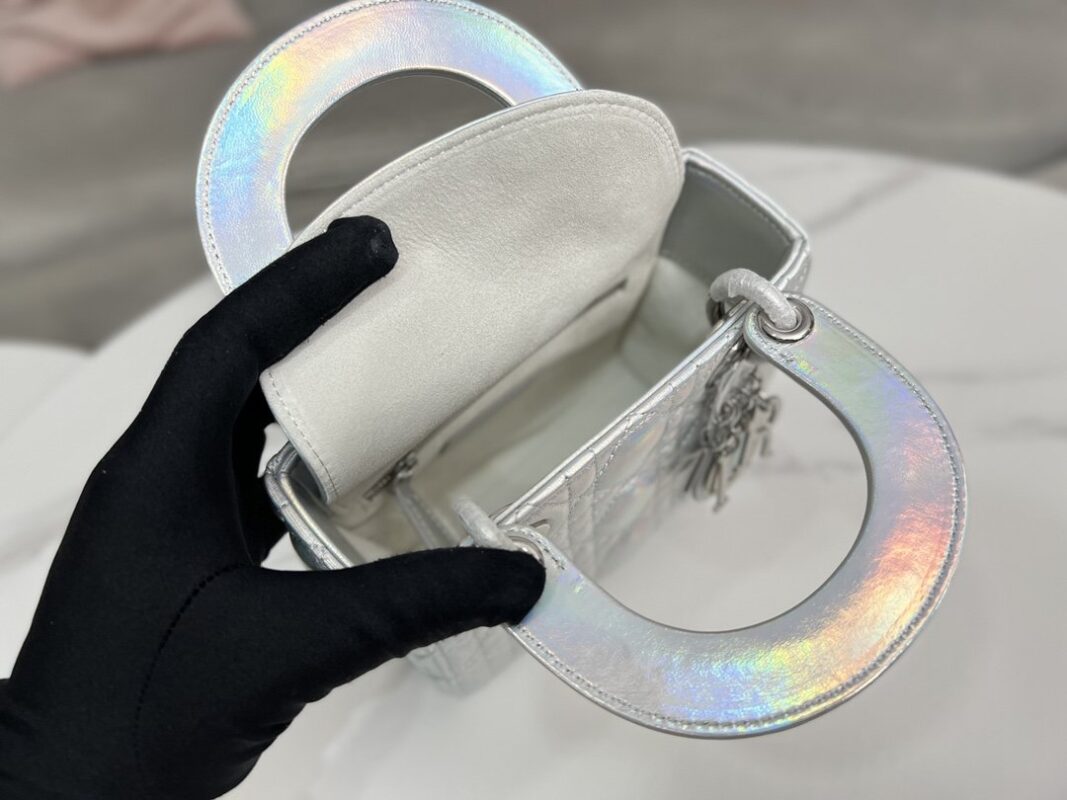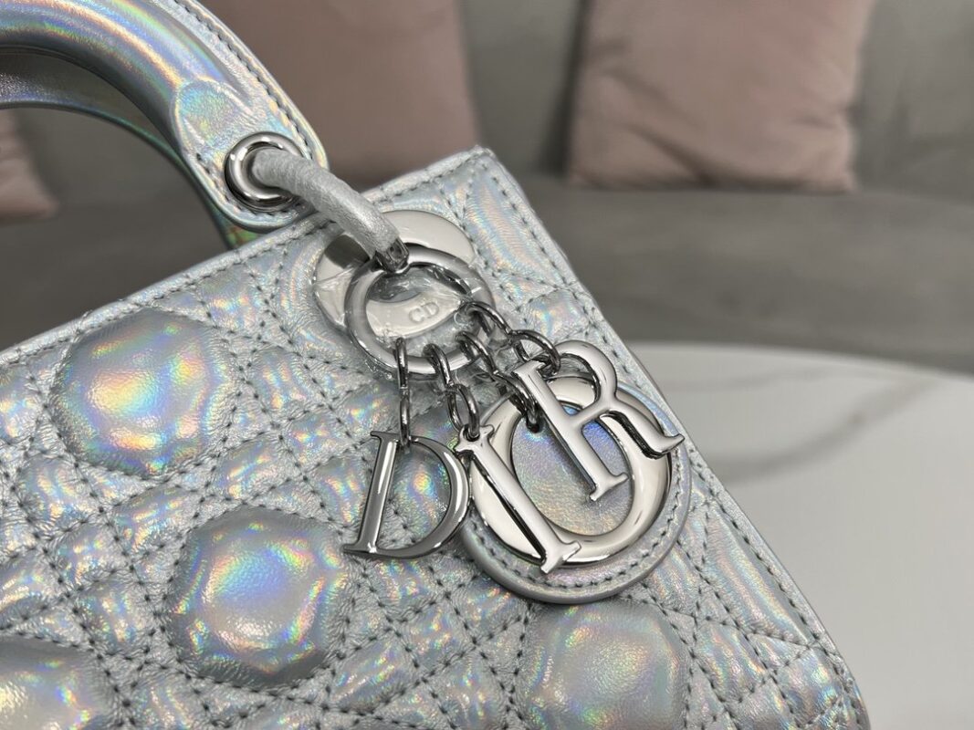 The Lady Dior bag from the Dior Or collection epitomizes Dior’s vision of elegance and beauty. Crafted from Neon Silver Metallic Lambskin with bold quilted detailing with Cannage topstitching, this timeless design is timeless. Embellished with a metal D.I.O.R. charm in rose gold finish for an elegant look. The mini style, with its detachable chain shoulder strap, can be carried by hand or cross-body, making it the ideal companion for evening wear.
