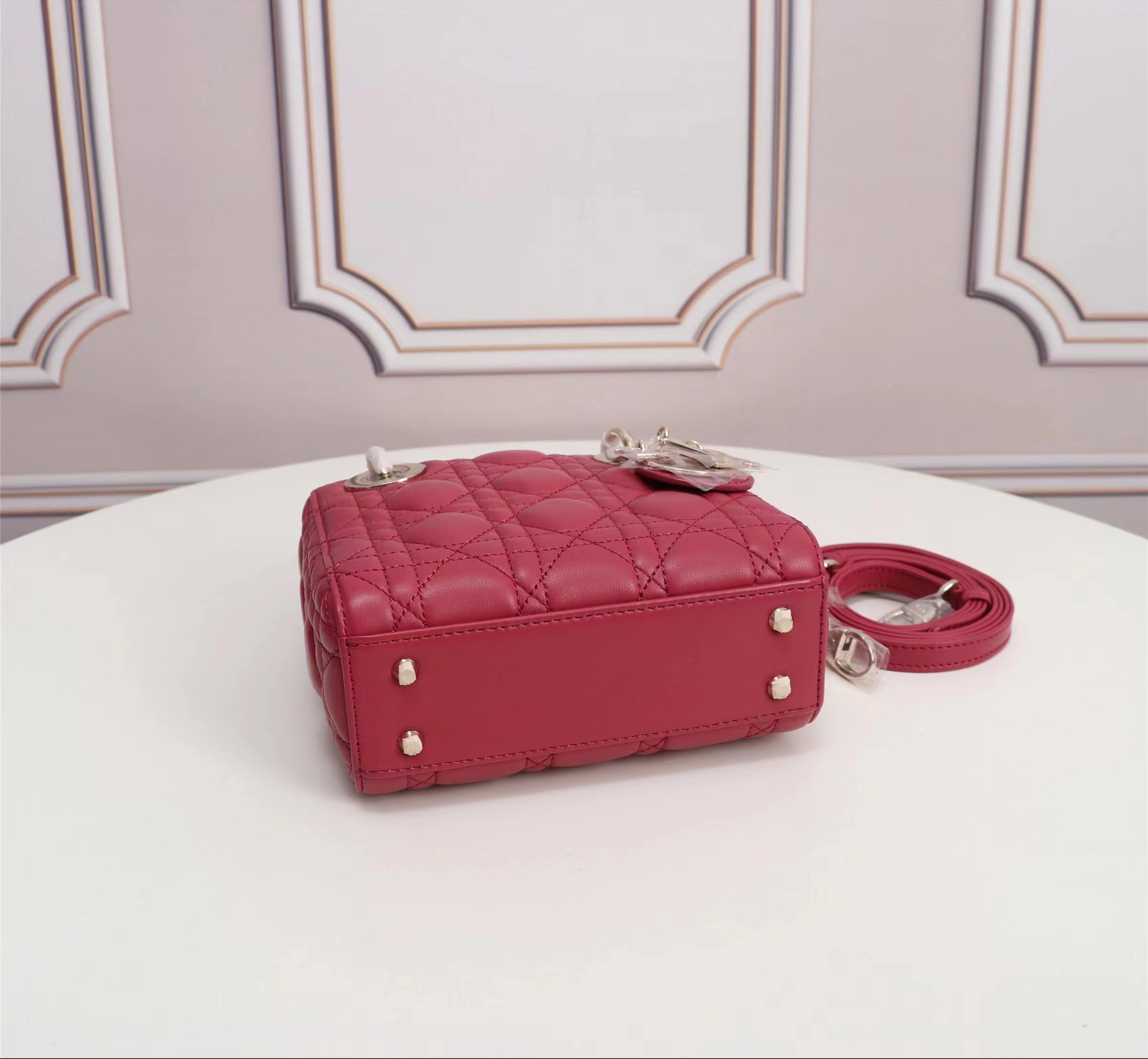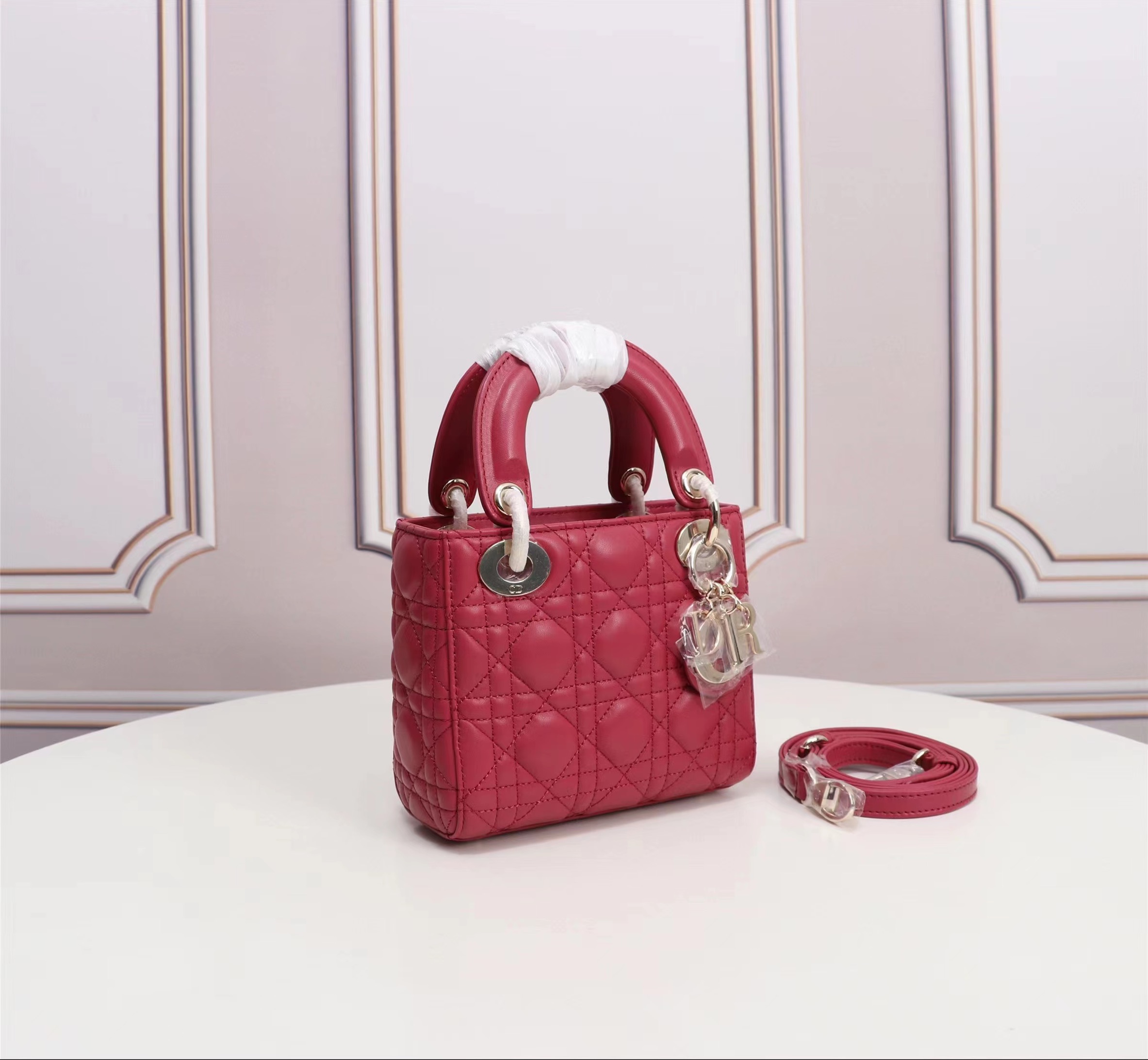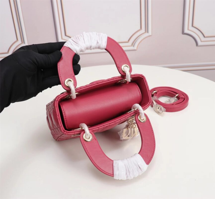 Dior top imported original sheepskin mini Diana bag lipstick bag. Mini LadyDior handbag sheepskin details color: Strawberry Red 12 x10 x5 cm Flip top closure Adjustable leather shoulder strapModel: M49P
