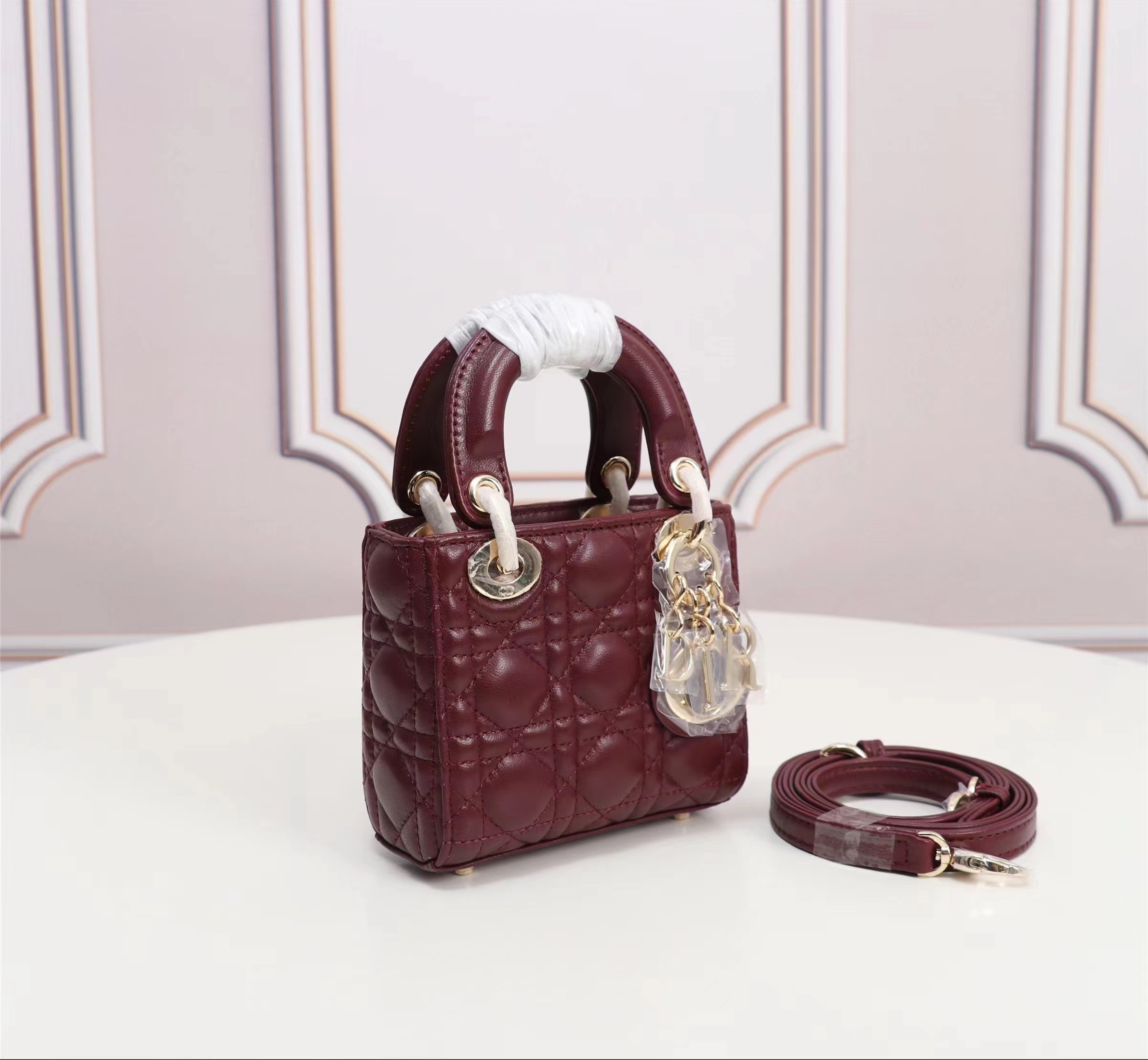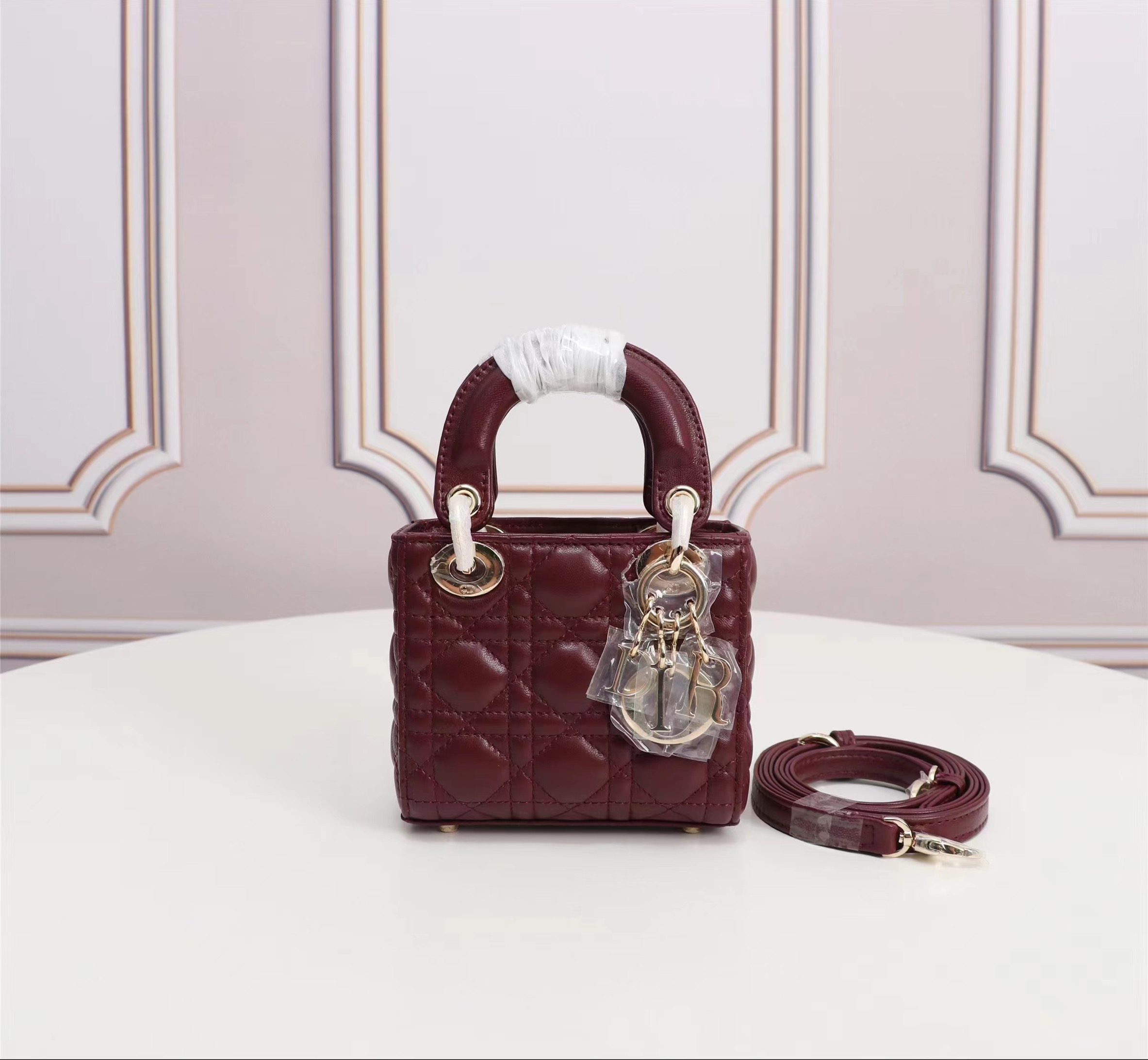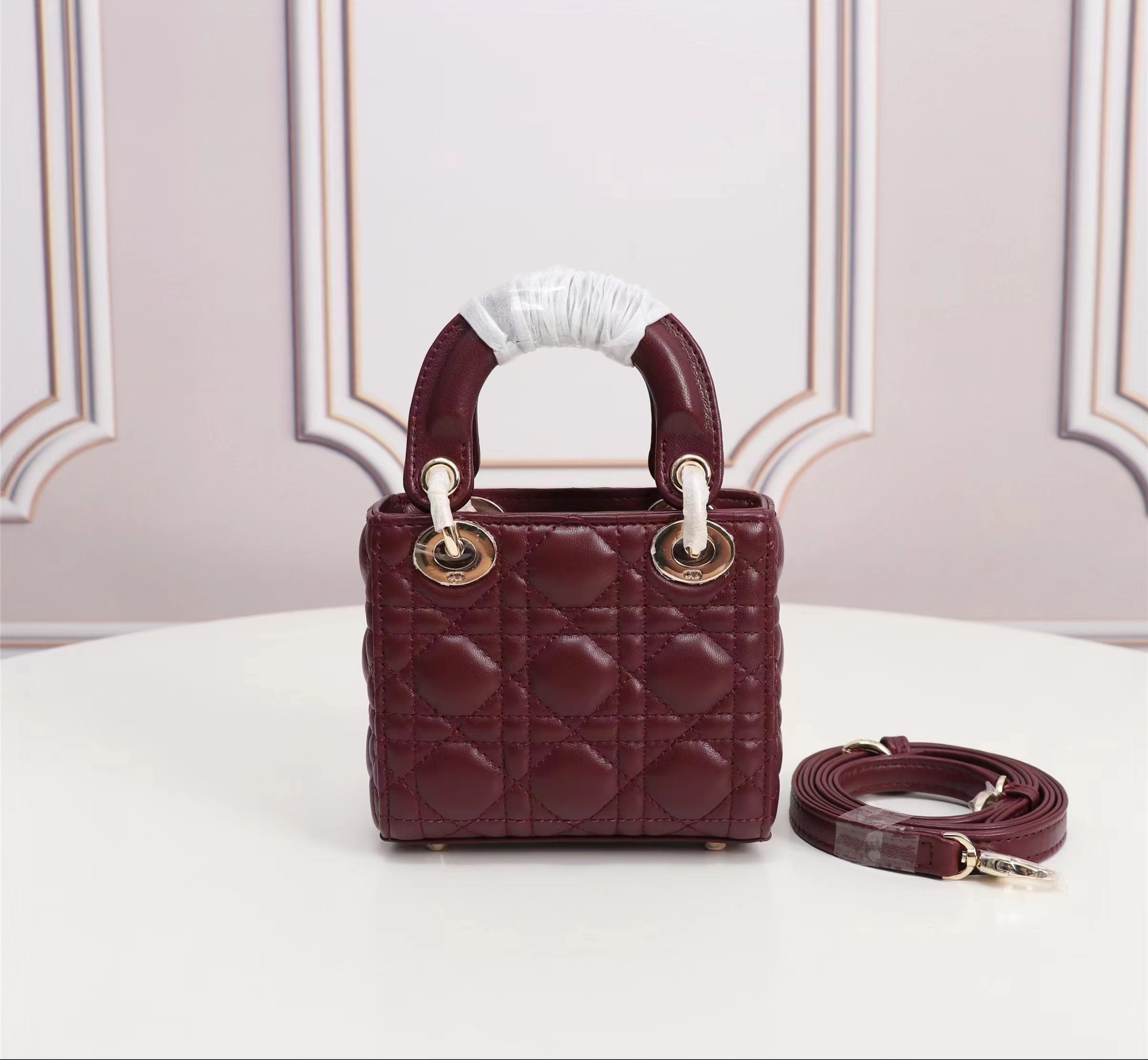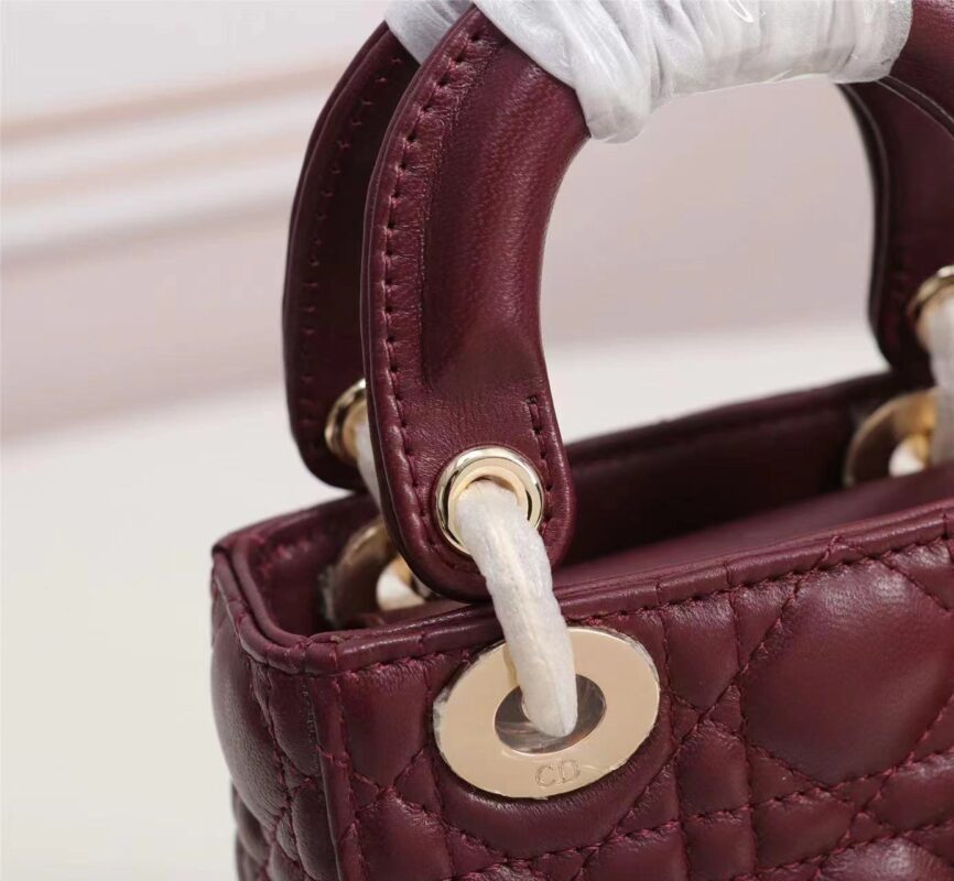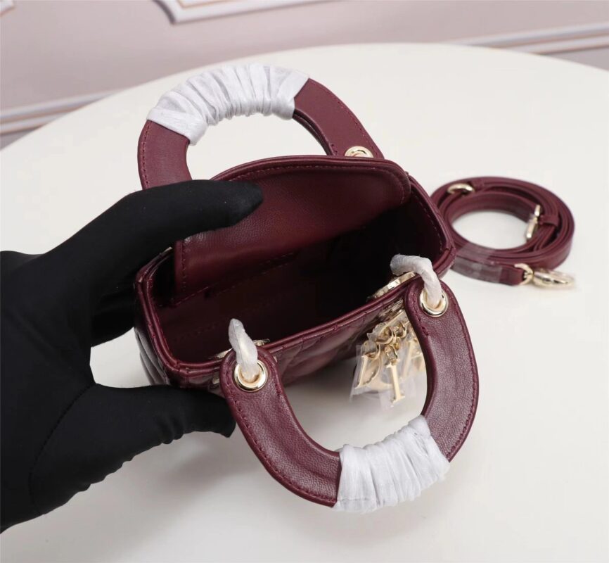 Dior top imported original sheepskin mini Diana bag lipstick bag. Mini LadyDior handbag sheepskin details color: Wine Red 12 x10 x5 cm Flip top closure Adjustable leather shoulder strapModel: M49P