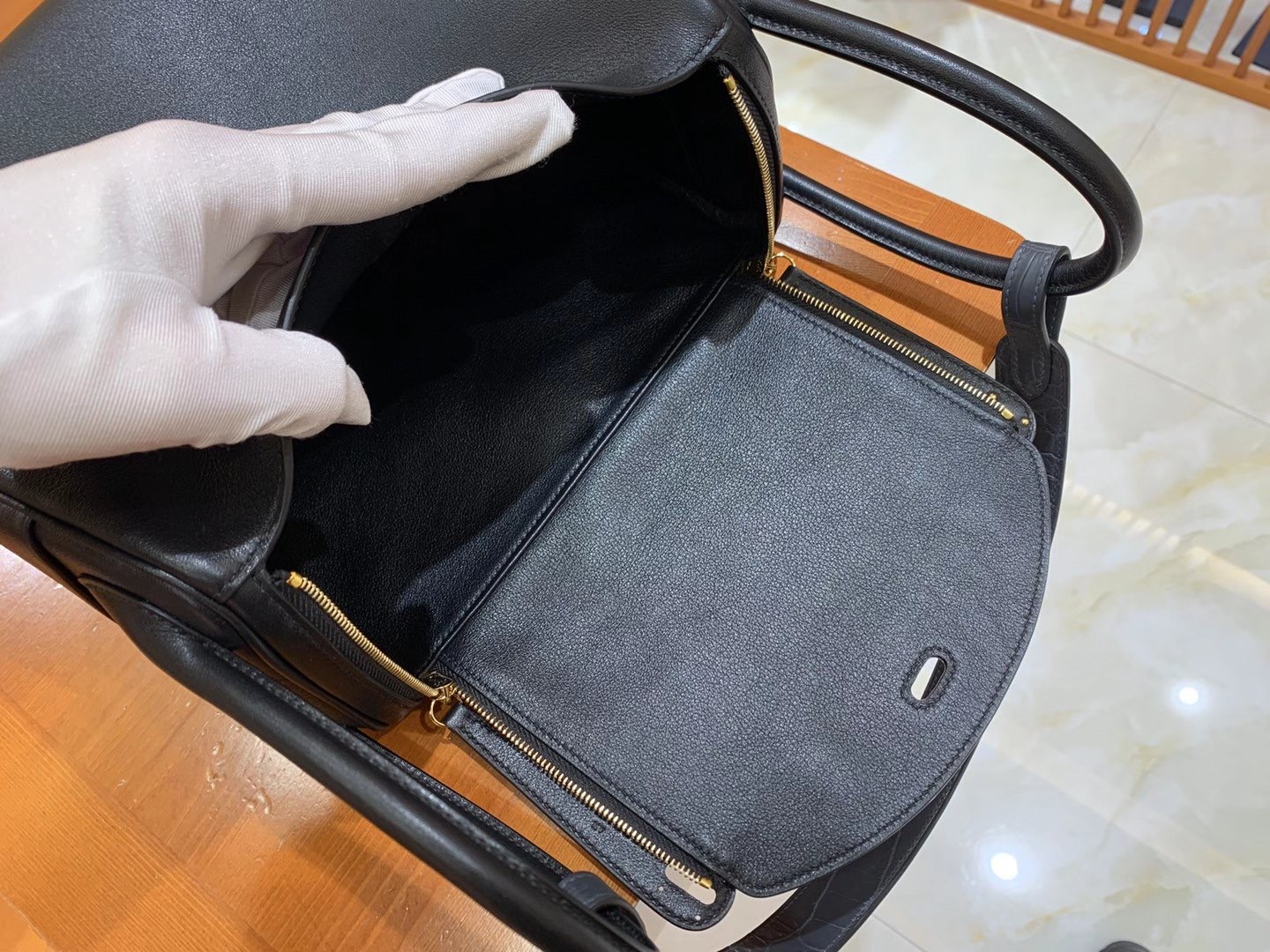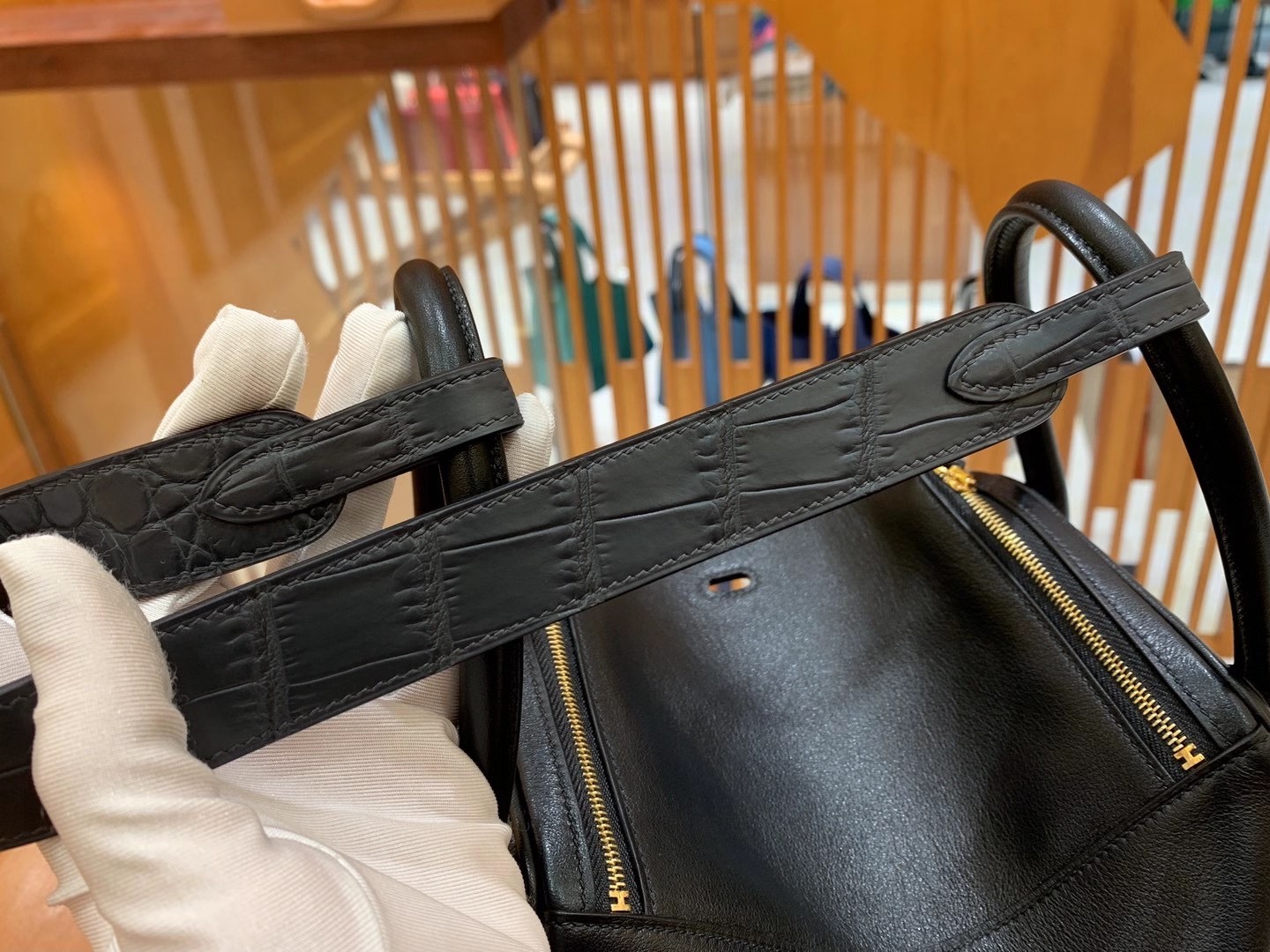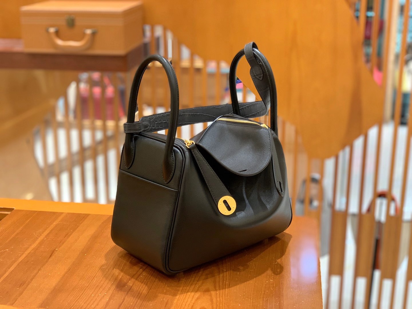 Lindy 26cm Black Imported swift and crocodile leather. Hand-stitched