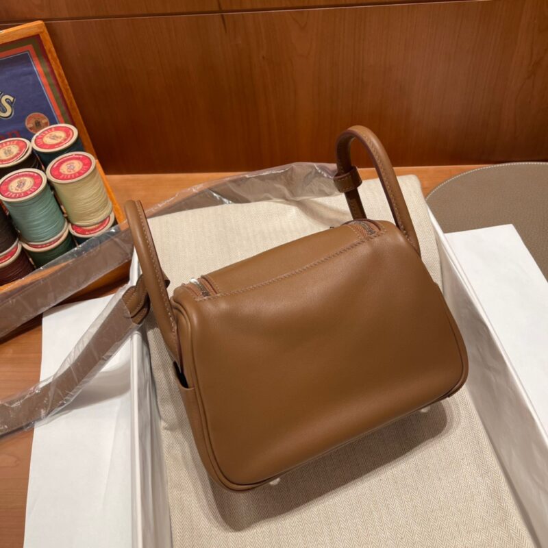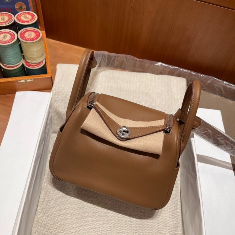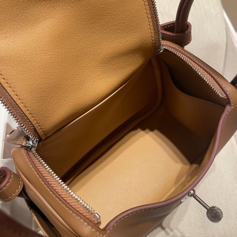 Mini Lindy Swift leather. 3G Chestnut color (Alezan). Inner spelling 4B Biscuit color (Biscuit). Silver buckle