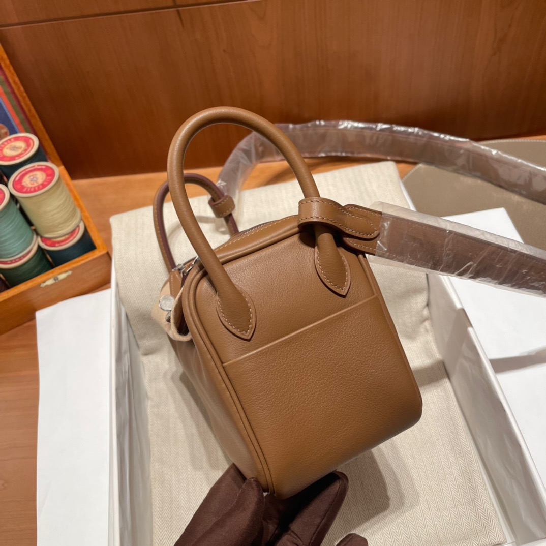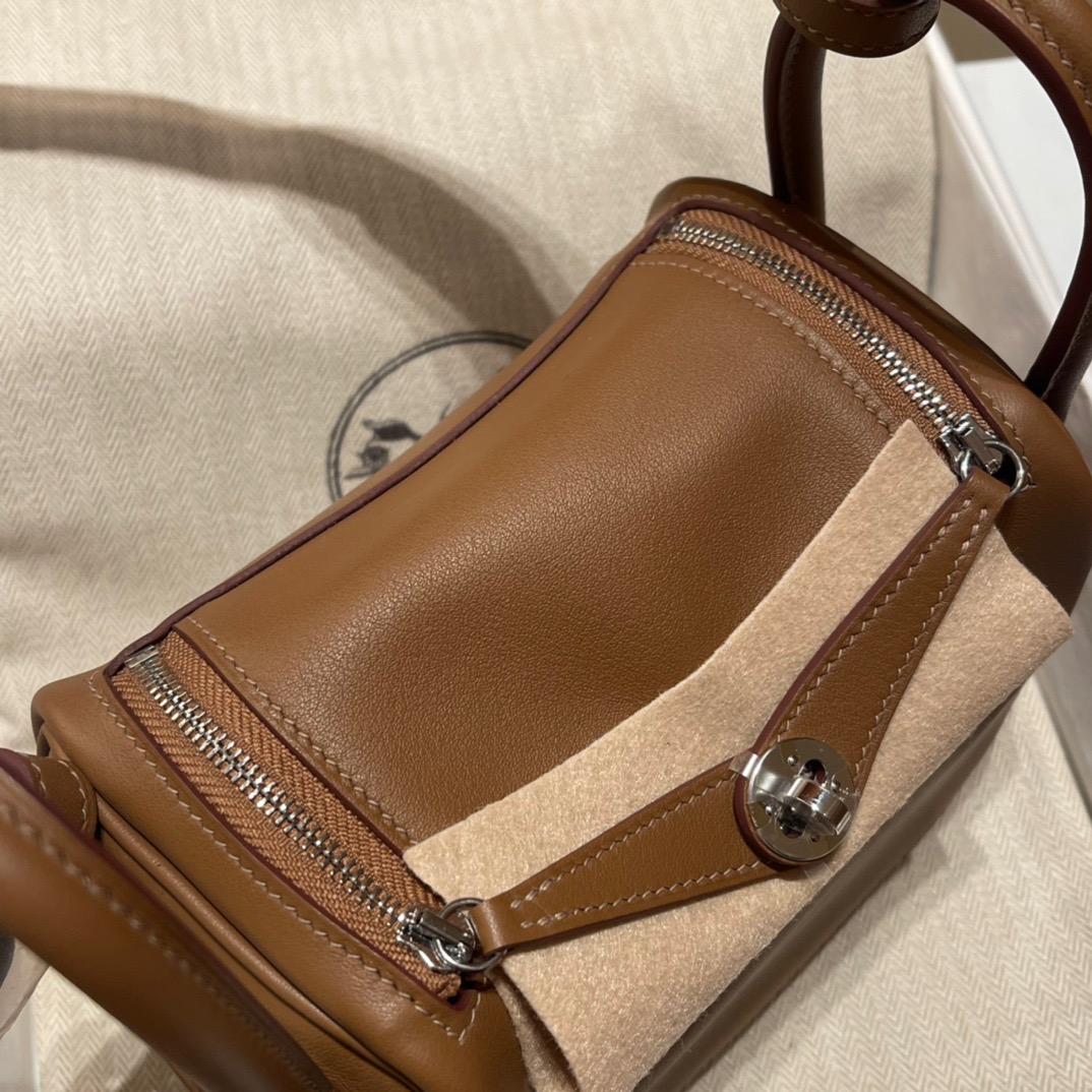 Mini Lindy Swift leather. 3G Chestnut color (Alezan). Inner spelling 4B Biscuit color (Biscuit). Silver buckle
