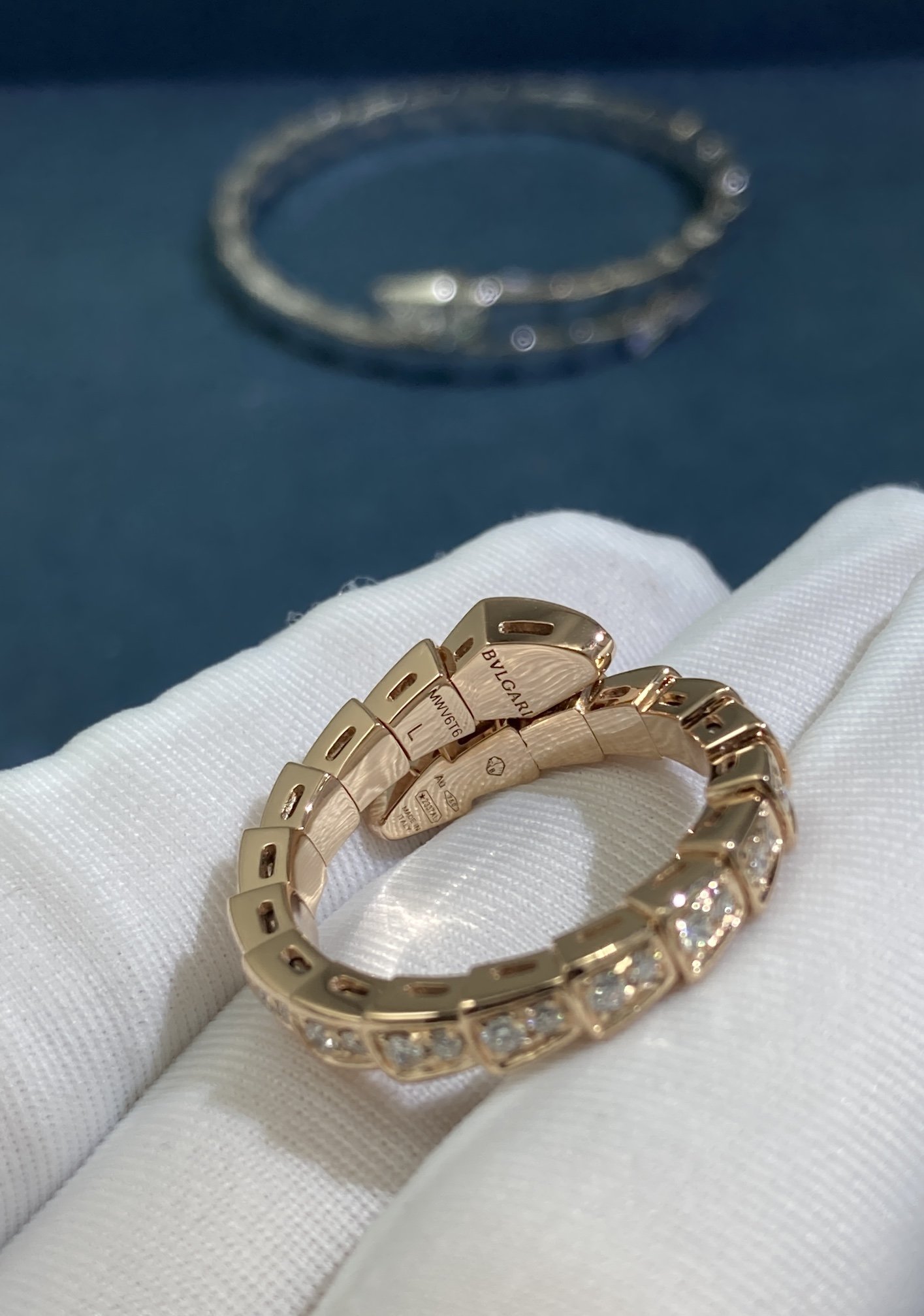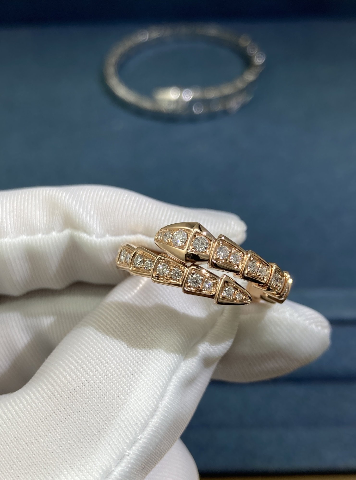 Bvlgary's Narrow Snake Ring All Over Diamonds, Rose Gold