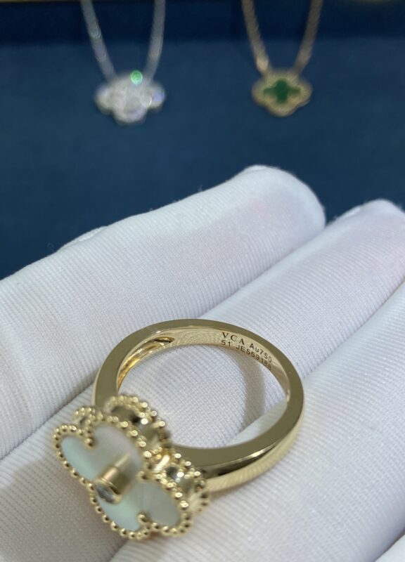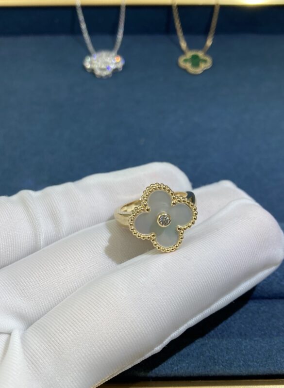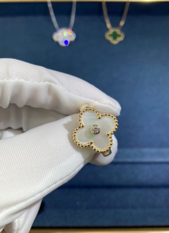 One Diamond White Shell Four-Leaf Clover Ear Racket, Gold Color
