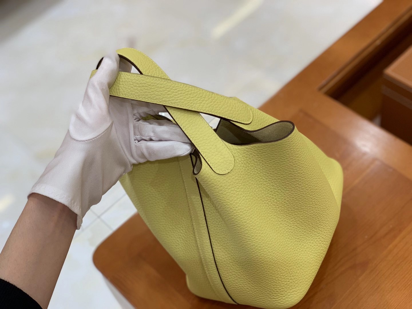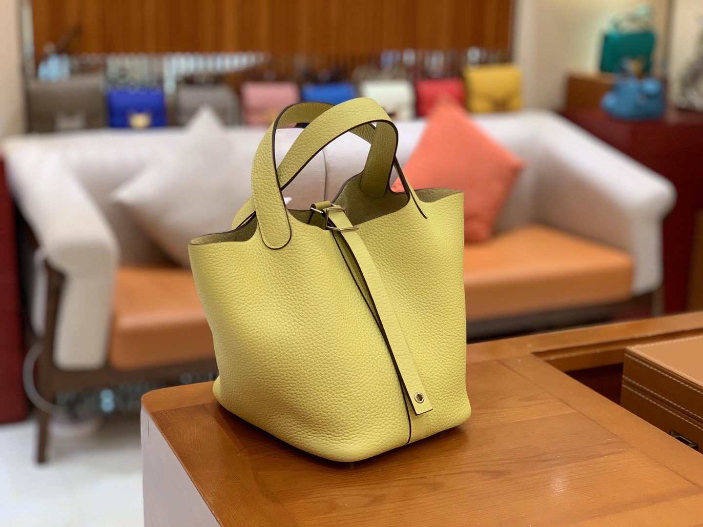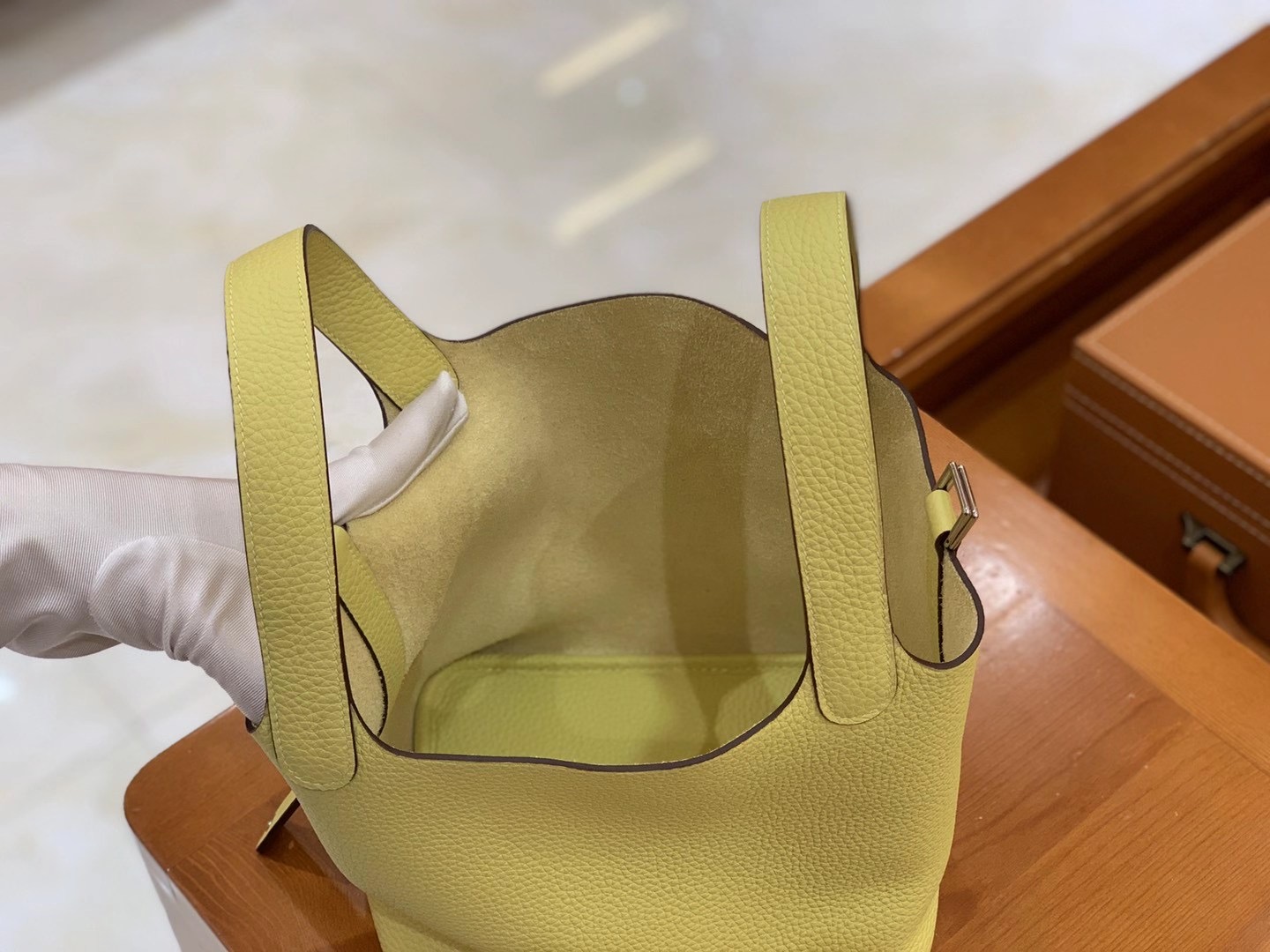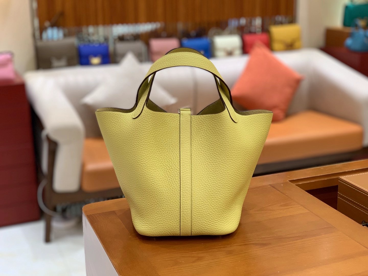 Picotin 18cm Jaune Poussin Imported TC cowhide. Fully hand-sewn