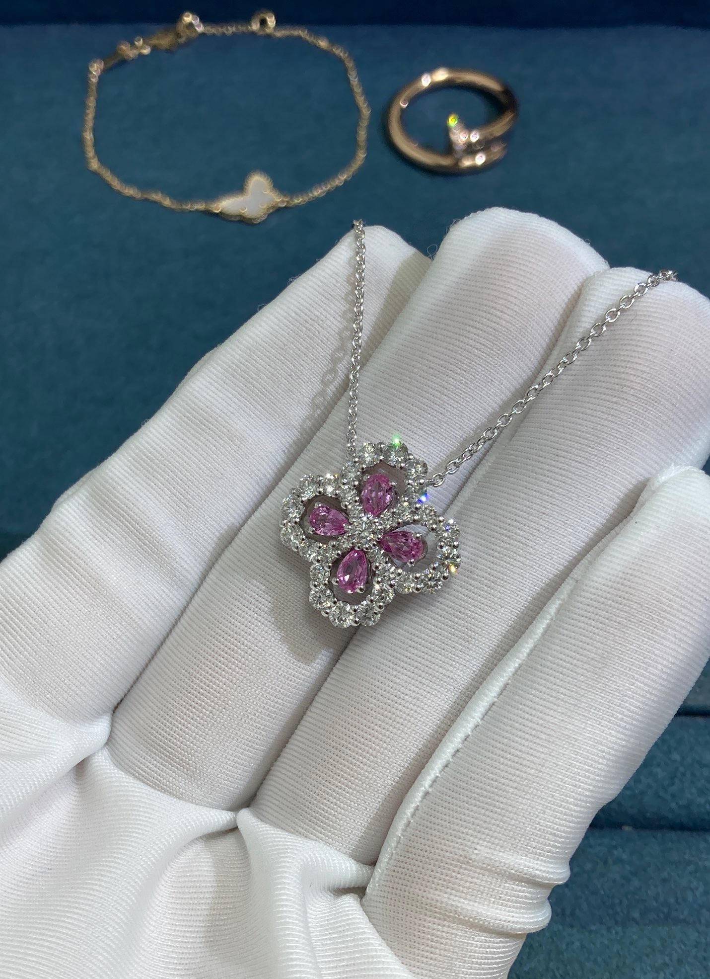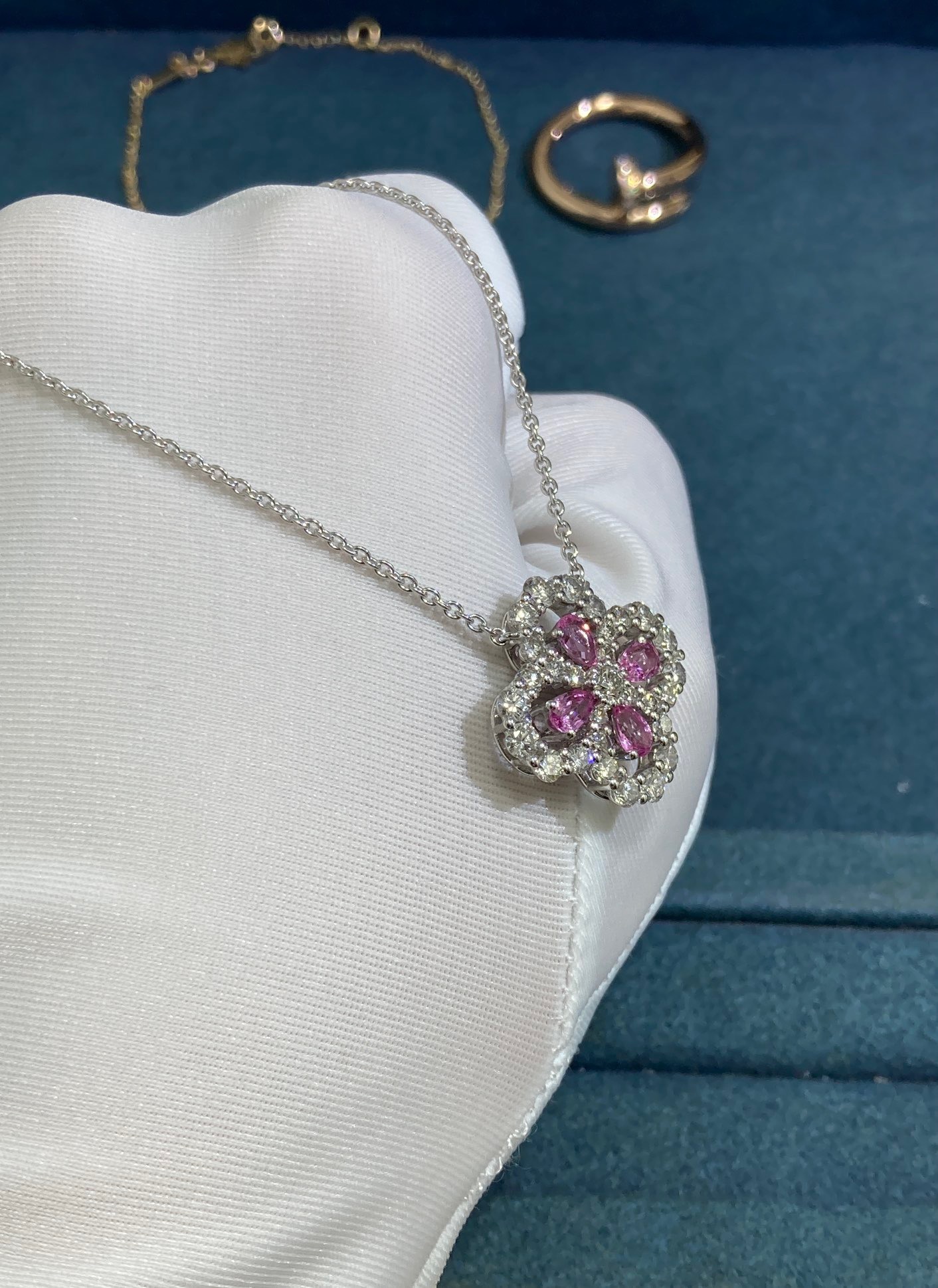 The metal used in pieces of jewelry are often a lustrous yellow or white gold, which is expertly polished to a mirror-like finish. The precious stones are carefully selected by our masters and set in a precise manner, showing off their color, clarity, and brilliance to their full potential.