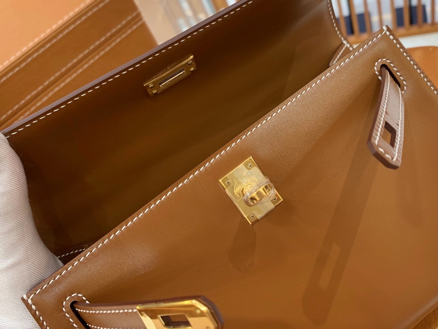 Mini Kelly Generation 22cm Golden Brown Imported BOX cowhide French beeswax thread 100% hand-sewn