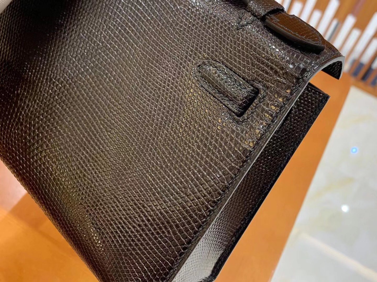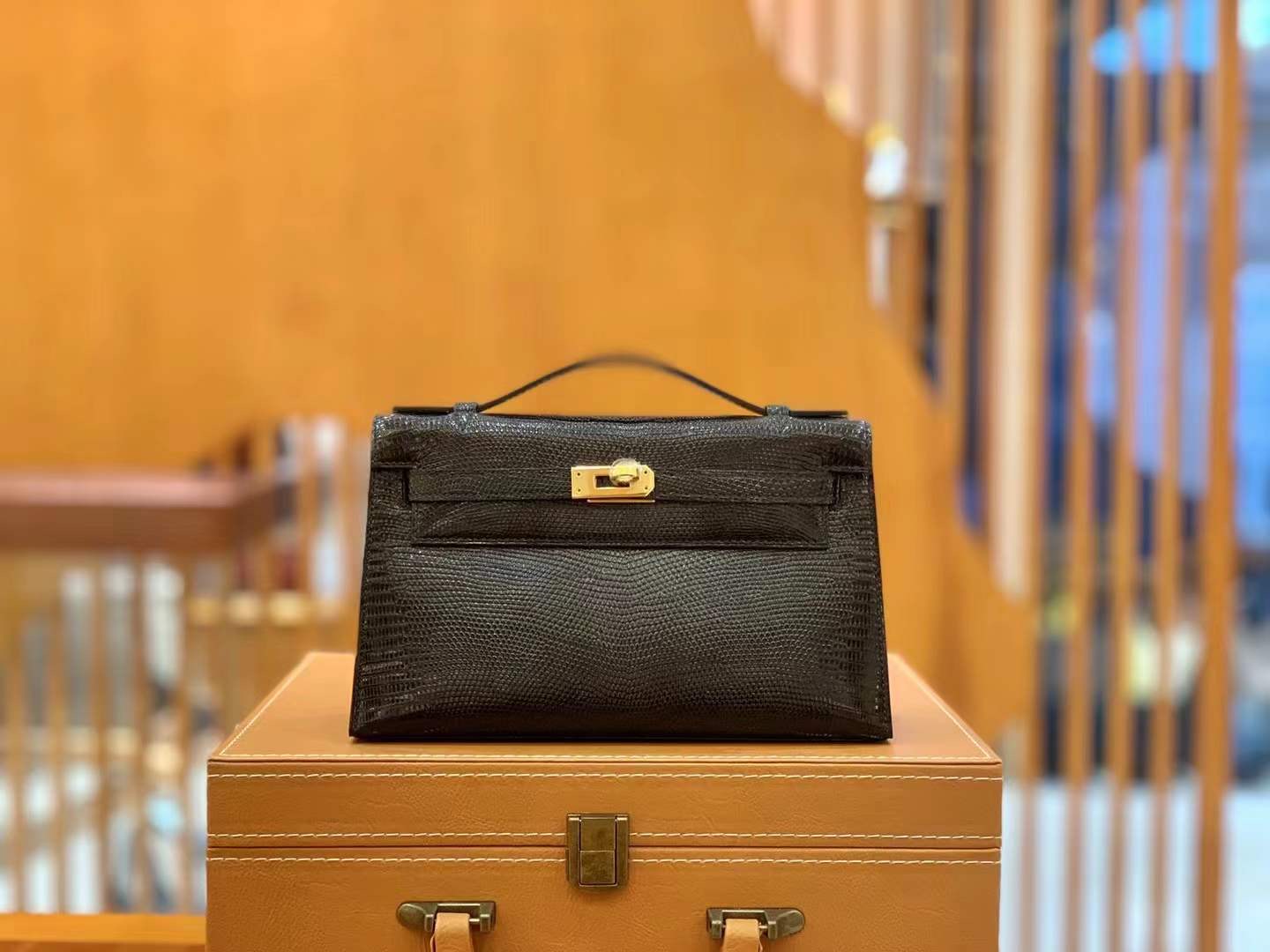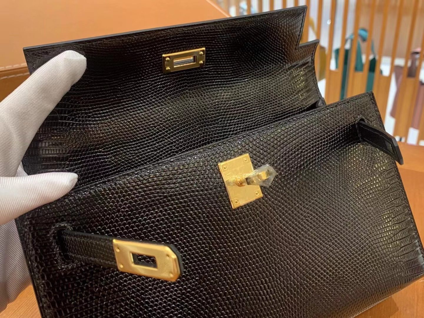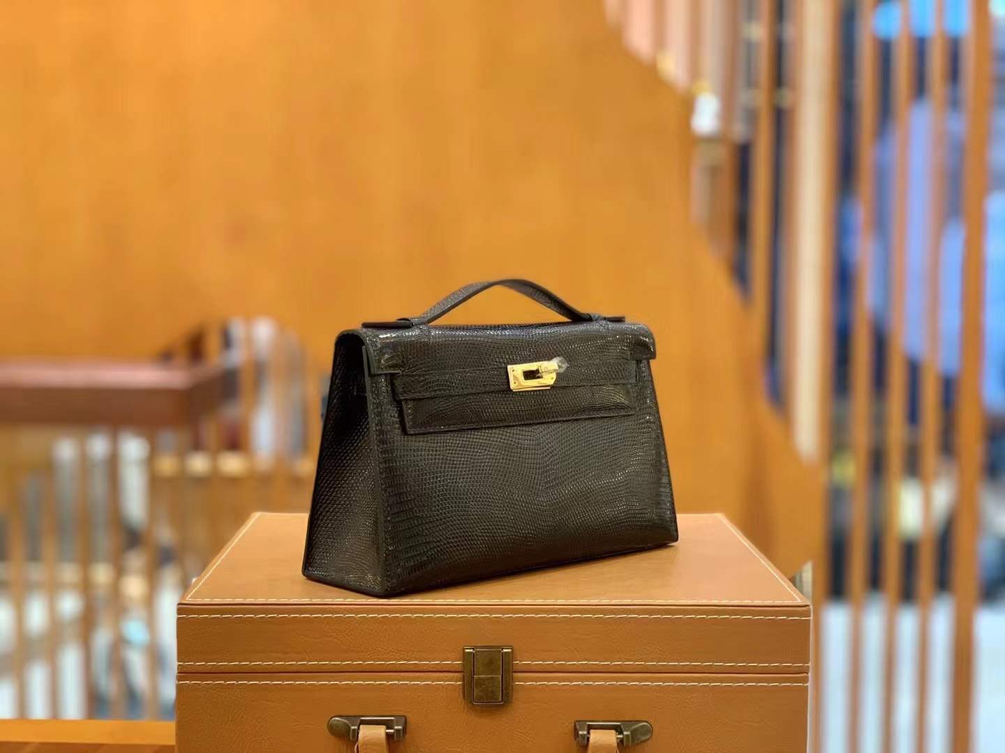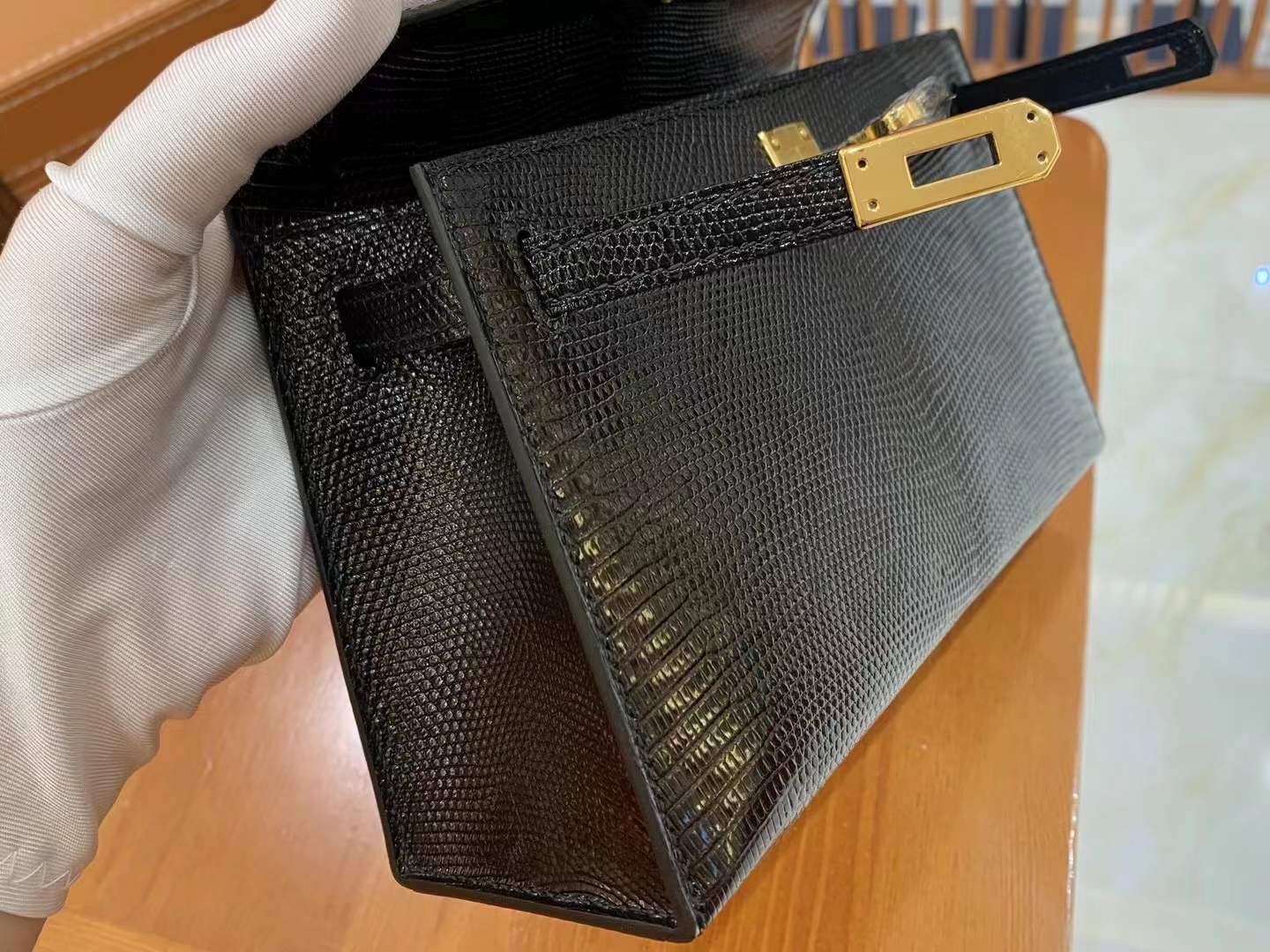Mini Kelly Generation 22cm Black Gold Imported wild lizard skin. Hand-sewn